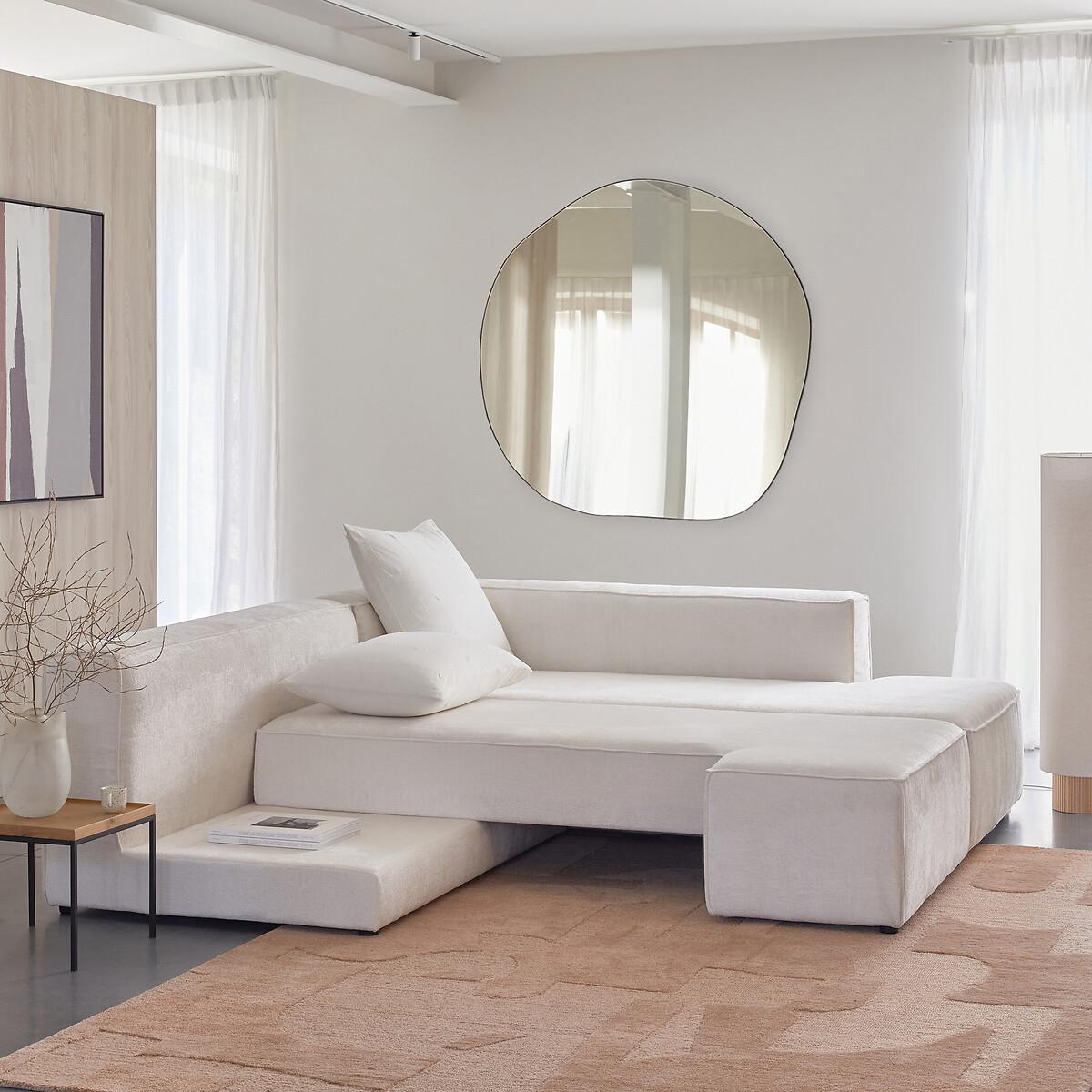 I love this organic-shaped mirror for its soft, natural silhouette that adds a touch of relaxed elegance to any space. It’s particularly versatile, working well in both modern and more eclectic interiors, whether as a focal point above a console table or nestled within a gallery wall. Its large size makes it practical for bringing in light and creating the illusion of more space, especially in smaller rooms. For styling, try pairing it with warm-toned frames or natural textures like wood and linen for a cosy, inviting feel. or, let it stand alone for a clean, minimal look that highlights its unique shape.