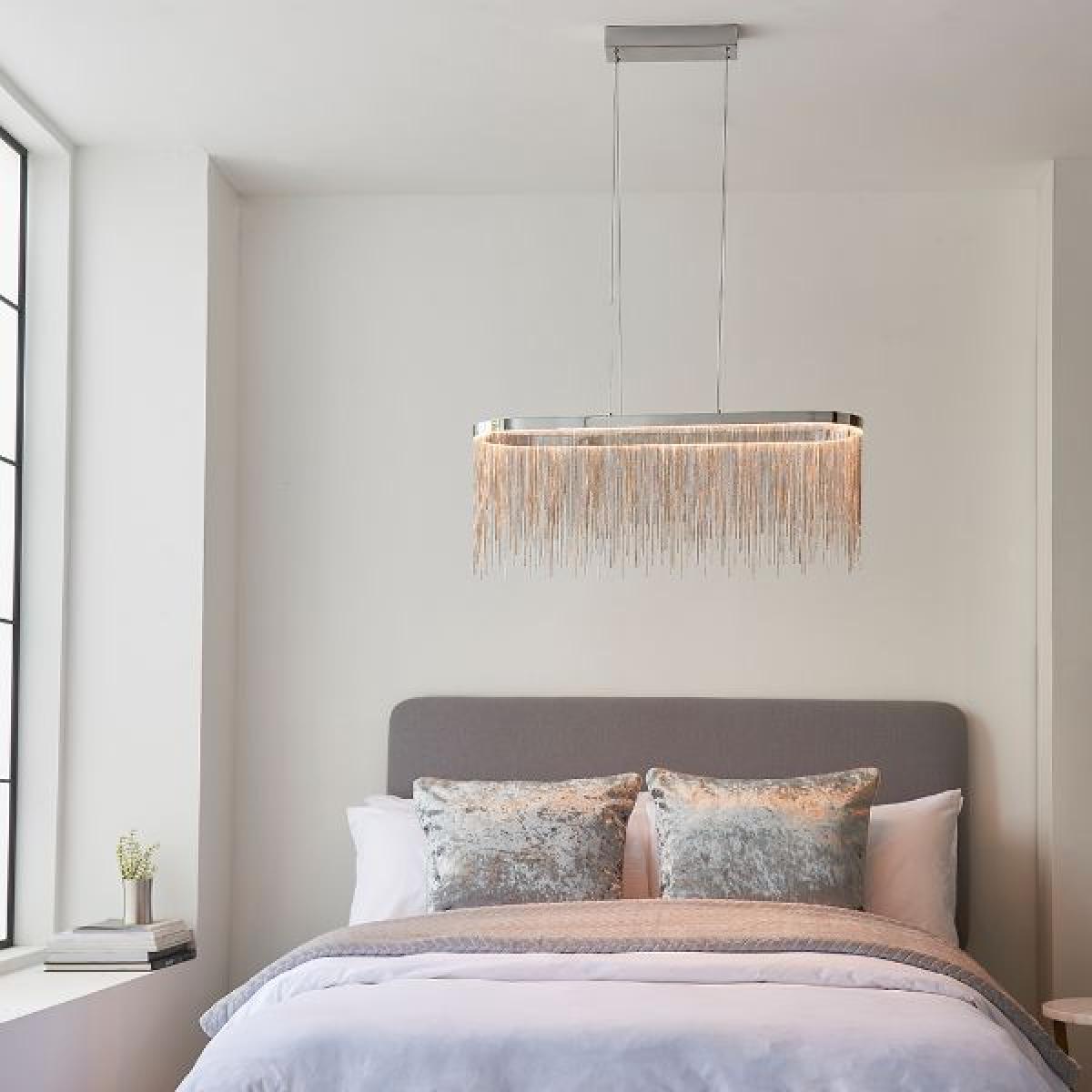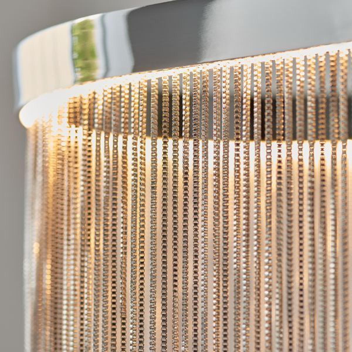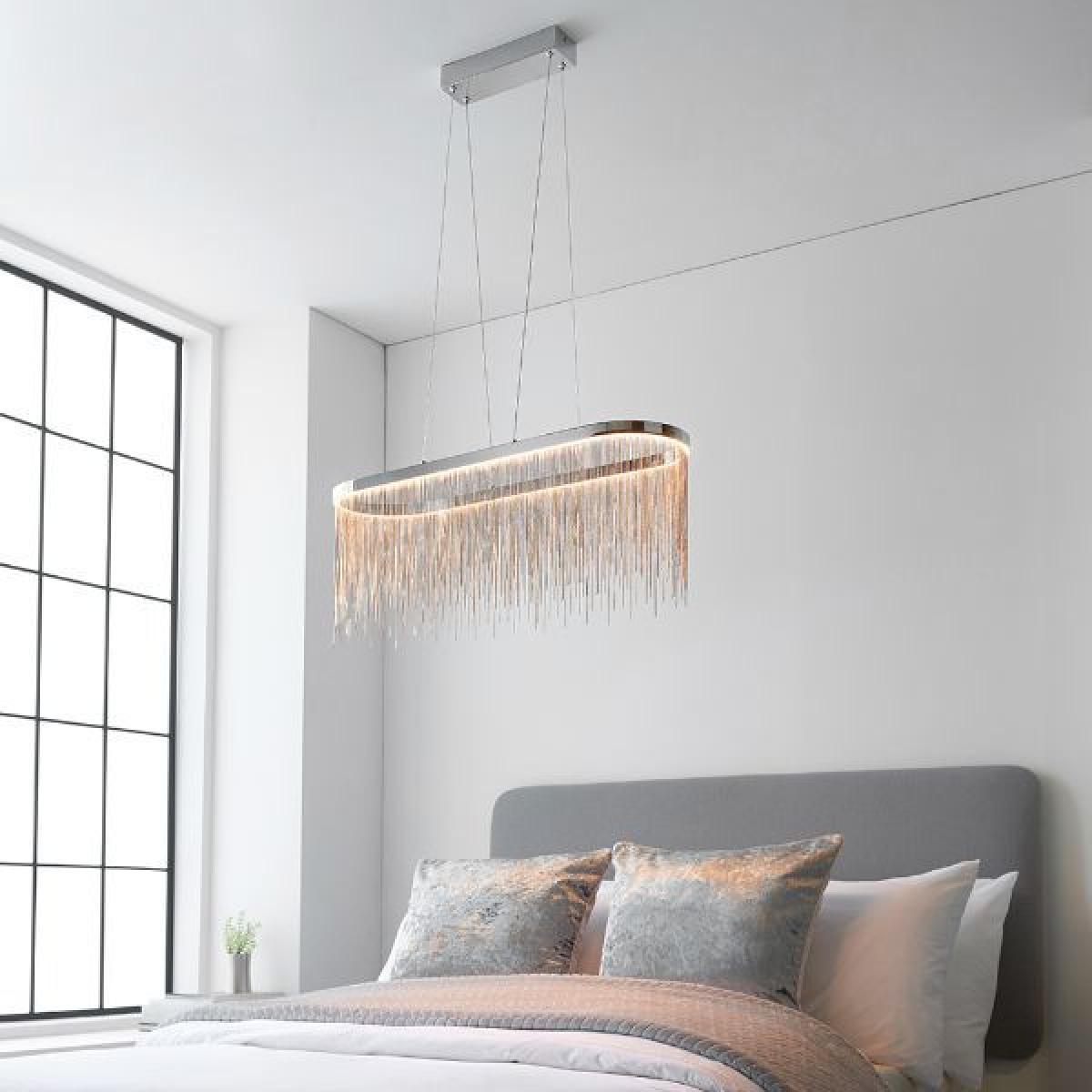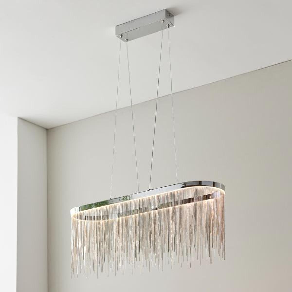 Modern ceiling pendant boasting chrome chain detail. Add a contemporary touch to your home with the stunning Orphelia Oval ceiling pendant. Featuring a modern oval shape and integrated LED lighting, diffused by a waterfall of hundreds of delicate chrome chains. Perfect for modern interiors, the Orphelia is plated in a polished chrome finish. Suspended by thin cables, the pendant will 'float' above dining areas, lounges and bedrooms. Modern ceiling pendant boasting chrome chain detail. Add a contemporary touch to your home with the stunning Orphelia Oval ceiling pendant. Featuring a modern oval shape and integrated LED lighting, diffused by a waterfall of hundreds of delicate chrome chains. Perfect for modern interiors, the Orphelia is plated in a polished chrome finish. Suspended by thin cables, the pendant will 'float' above dining areas, lounges and bedrooms.