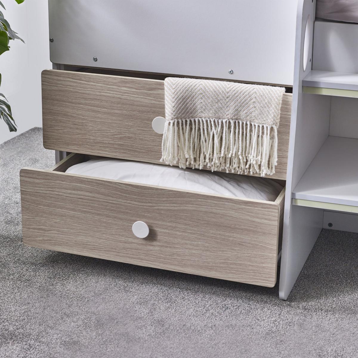 I love the Orpheus midsleeper for its versatile, modern look and functional design. Its light oak finish adds warmth to a variety of interiors, from Scandi-inspired spaces to more contemporary or minimalist schemes. This bunk is great for making the most of smaller bedrooms, and pairing it with colourful or patterned textiles can add personality and character. Practical styling tips include using under-bed space for storage or a pull-out drawer for toys and books, keeping the room tidy. To soften the overall feel, consider adding cosy cushions and fairy lights or wall art around the bed area. Its neutral tone makes it easy to integrate into most kid’s rooms or guest spaces without losing style or cohesion.