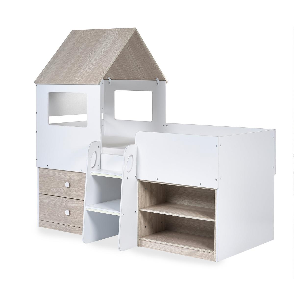 * House Style Bed Frame* Built In Drawers and Shelving* Glow in the Dark Ladder This enchanting house-style bed captures the imagination with its two pull-out drawers and open shelving, providing plenty of space for toys and necessities. The study glow-in-the-dark ladder adds a playful touch, leading to the cosy haven on top complete with a wonderful roof and opened windows on each side.