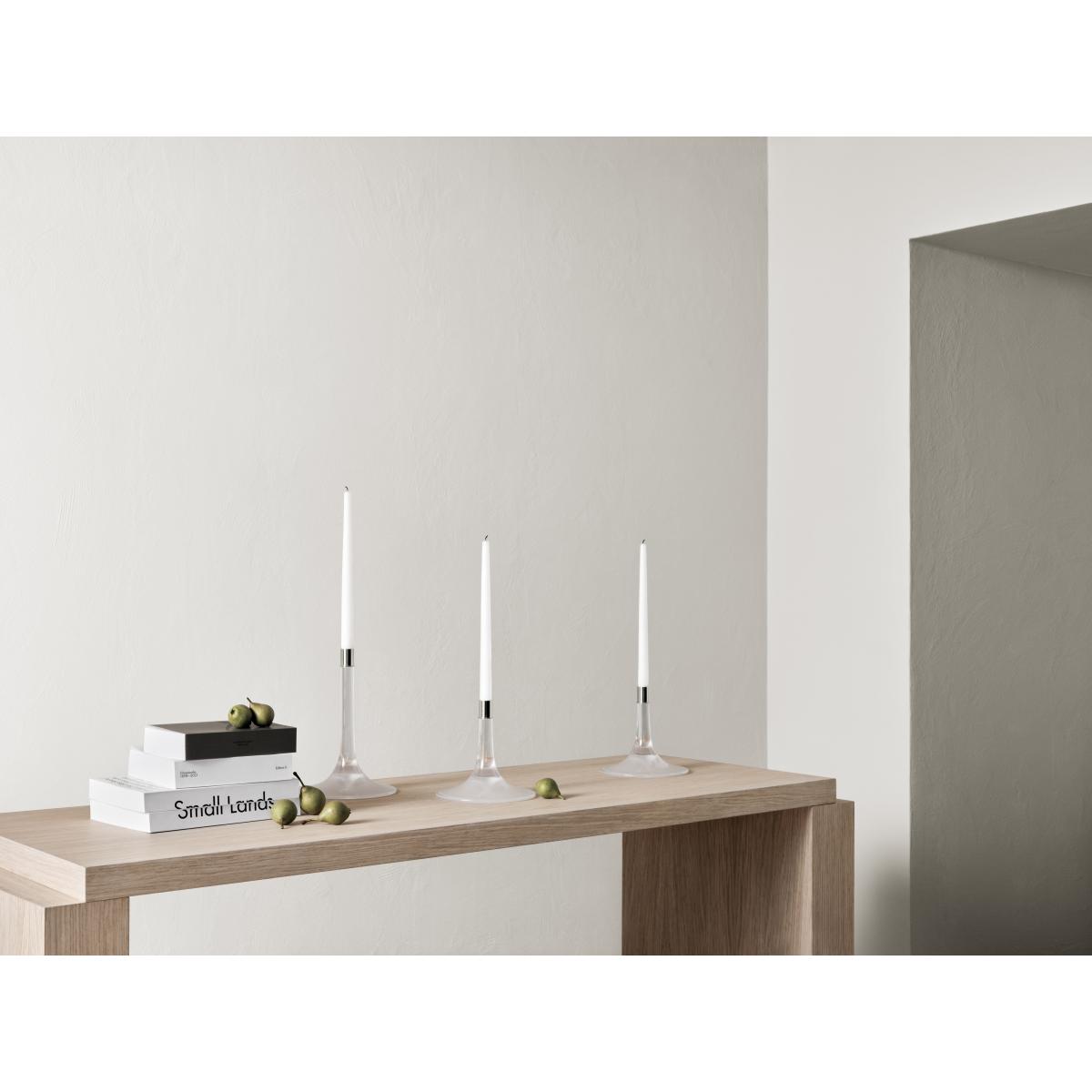 I love the clean, minimalist design of these clear candlesticks, making them incredibly versatile for various interiors. They work particularly well in modern, Scandinavian, or contemporary settings where their understated elegance can shine. For practical styling, I suggest grouping a few for a dramatic centrepiece or placing one on a mantel or side table to add height and visual interest. The transparency of the glass allows them to blend seamlessly with other decor, whether coloured accents or metallic finishes. To keep the look fresh, consider pairing them with simple candles in neutral tones or subtle patterns for a sleek, sophisticated feel.