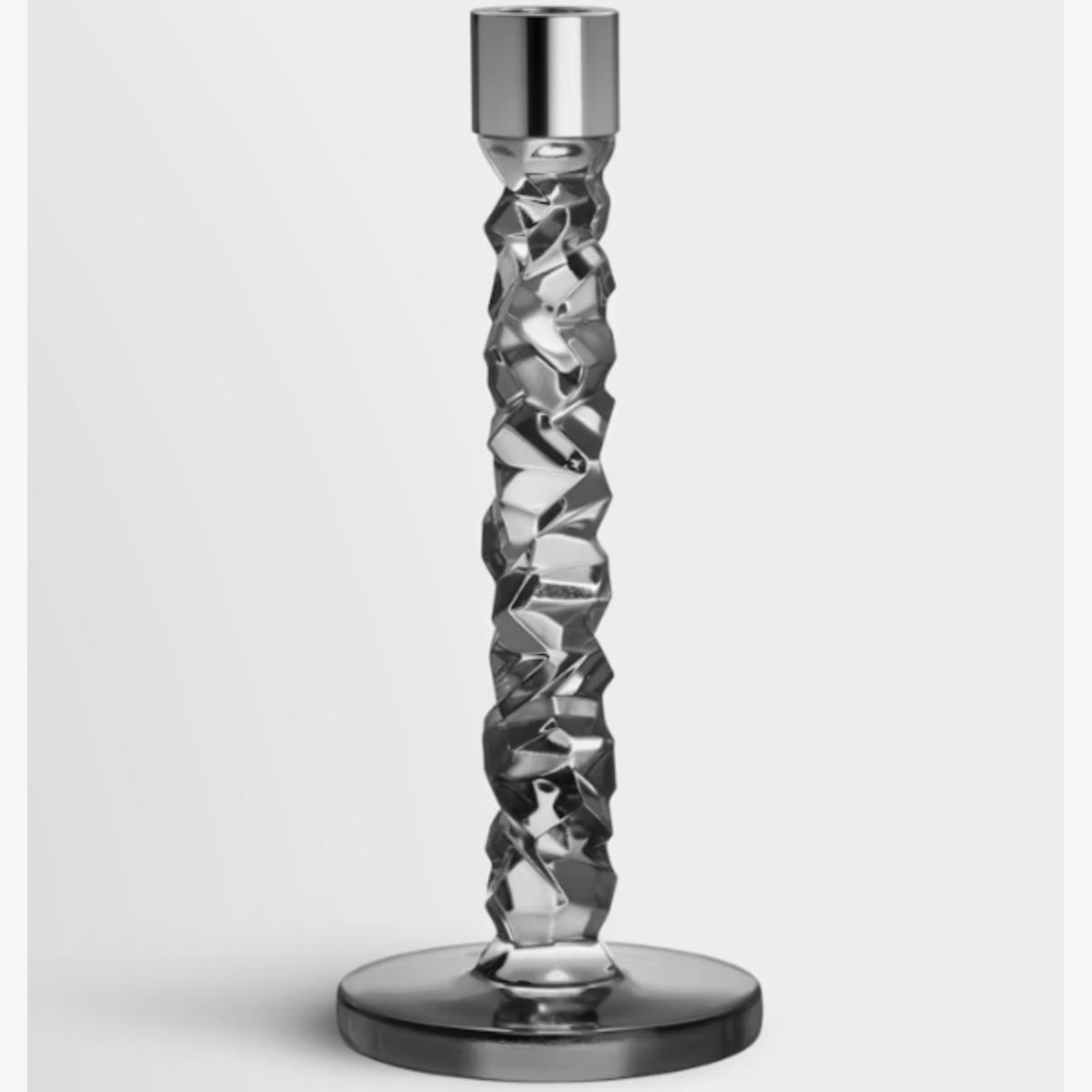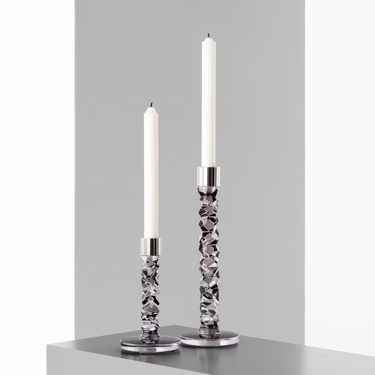 The Carat collection is based on a contemporary interpretation of the traditional cut glass for which Orrefors is world-renowned. The irregular geometry produces beautiful reflections of light in the crystal. The candlestick in anthracite is available in three sizes with details in stainless steel. The medium candlestick comes in a 2-pack. Designed by Lena Bergström.