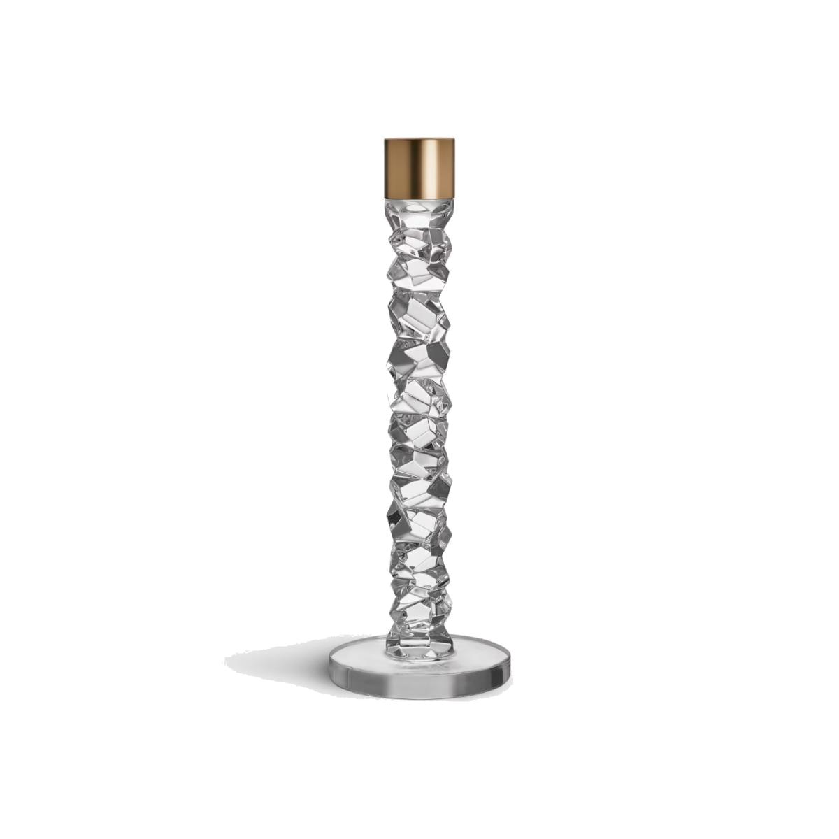 The Carat collection is based on a contemporary interpretation of the traditional cut glass for which Orrefors is world-renowned. The irregular geometry produces beautiful reflections of light in the crystal. The candlestick in clear glass is available in three sizes, with details in bronze or stainless steel. The medium candlestick with a bronze holder comes in a 2-pack. Designed by Lena Bergström.