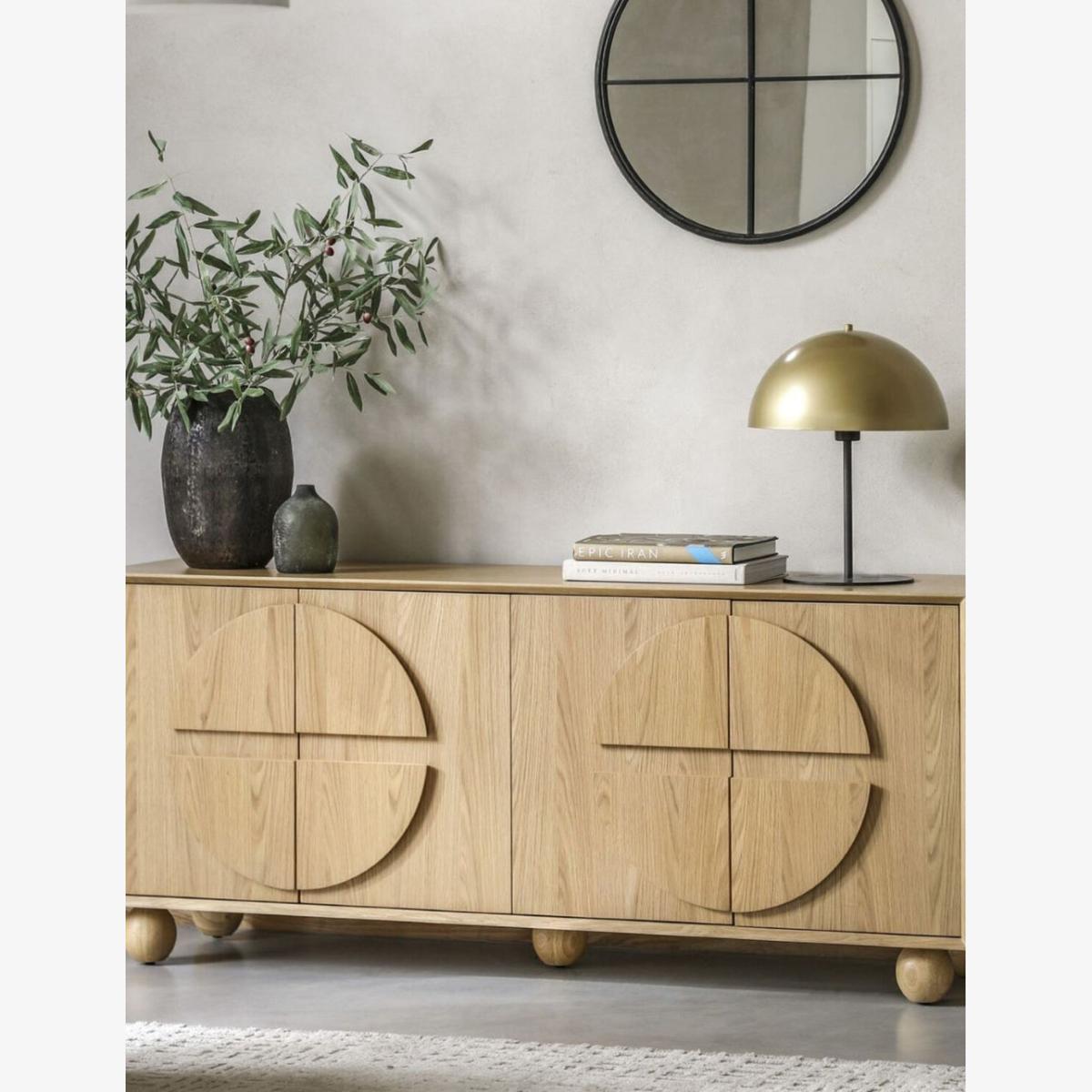 Designed to highlight the use of geometric design, with a nod towards a retro feel but in a more modern format, this stunning 4 door sideboard combines style and practicality. It features beautiful circular shaping on the doors, with spherical feet echoing this. It is made using oak veneers and solids, where practical, with a natural matt finish. Matching pieces are available. Designed to highlight the use of geometric design, with a nod towards a retro feel but in a more modern format.