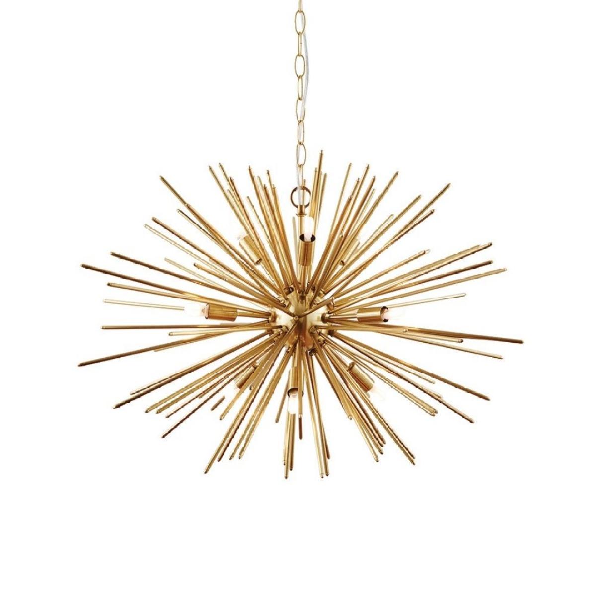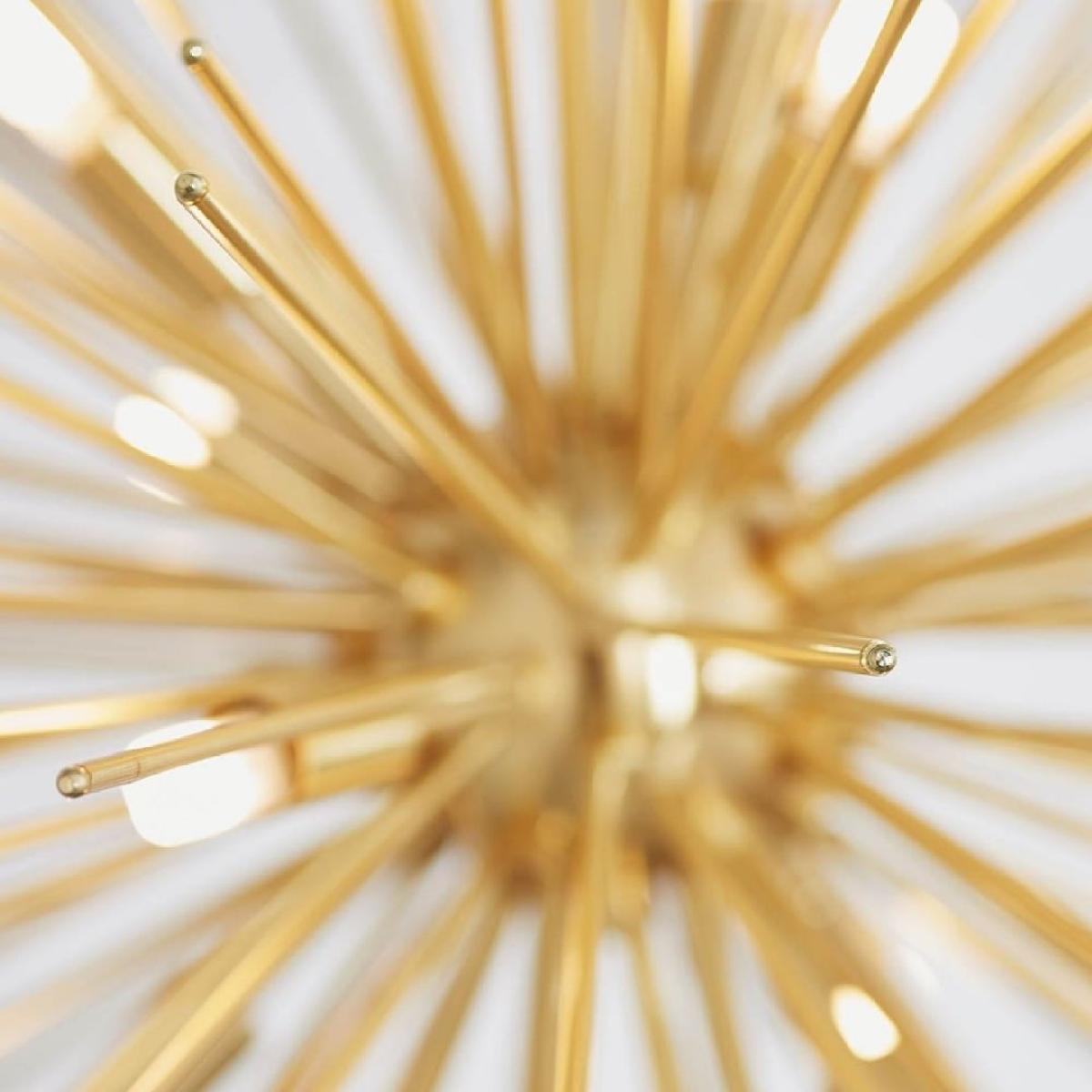 Orta 9-light pendant ceiling light, featuring a sputnik design and a satin gold finish. The Orta pendant ceiling light is a striking statement piece inspired by the iconic sputnik design. Featuring a bold arrangement of satin brass metal spikes, this eye-catching fixture creates a dynamic and sculptural focal point. The nine lights are scattered throughout the structure, casting a beautifully diffused glow that enhances any interior with warmth and elegance. Perfect for contemporary and mid-century modern spaces, the Orta pendant light adds a sense of drama and sophistication to dining rooms, living areas or hallways. Its radiant gold finish brings a luxurious touch, making it a standout feature in any setting. Orta 9-light pendant ceiling light, featuring a sputnik design and a satin gold finish. The Orta pendant ceiling light is a striking statement piece inspired by the iconic sputnik design. Featuring a bold arrangement of satin brass metal spikes, this eye-catching fixture creates a dynamic and sculptural focal point. The nine lights are scattered throughout the structure, casting a beautifully diffused glow that enhances any interior with warmth and elegance. Perfect for contemporary and mid-century modern spaces, the Orta pendant light adds a sense of drama and sophistication to dining rooms, living areas or hallways. Its radiant gold finish brings a luxurious touch, making it a standout feature in any setting.