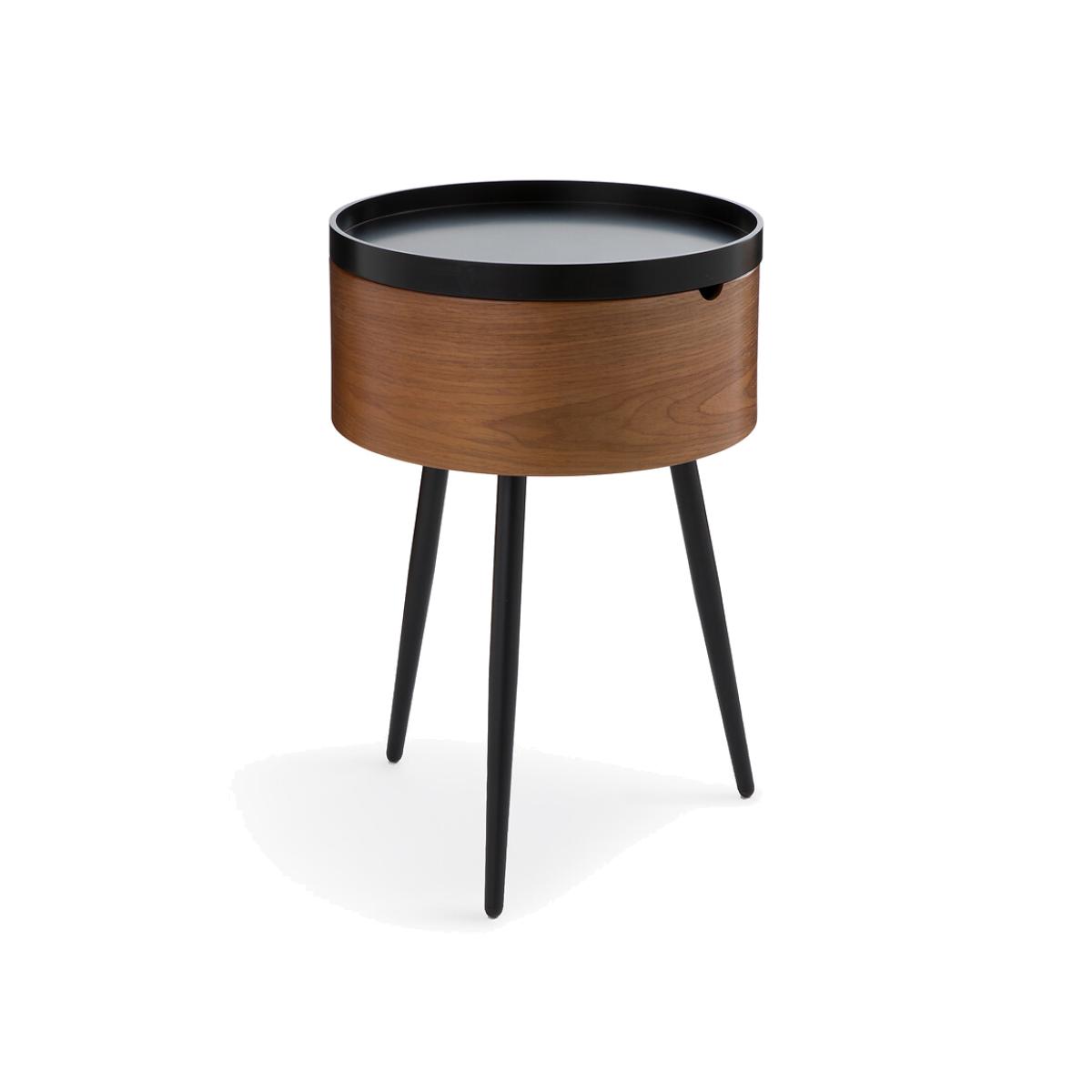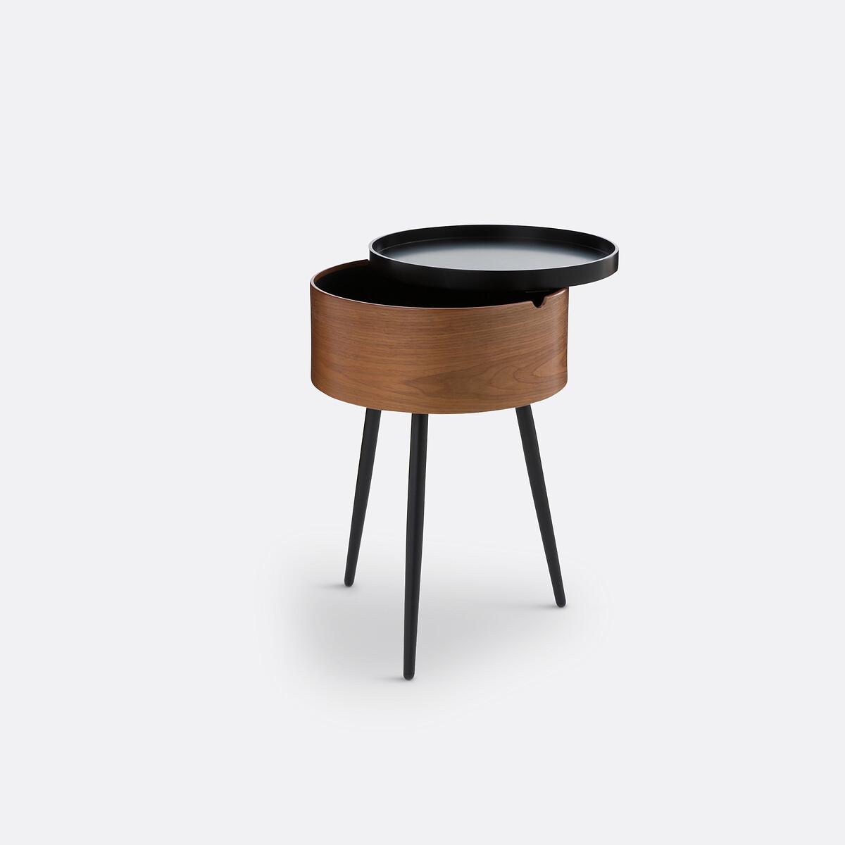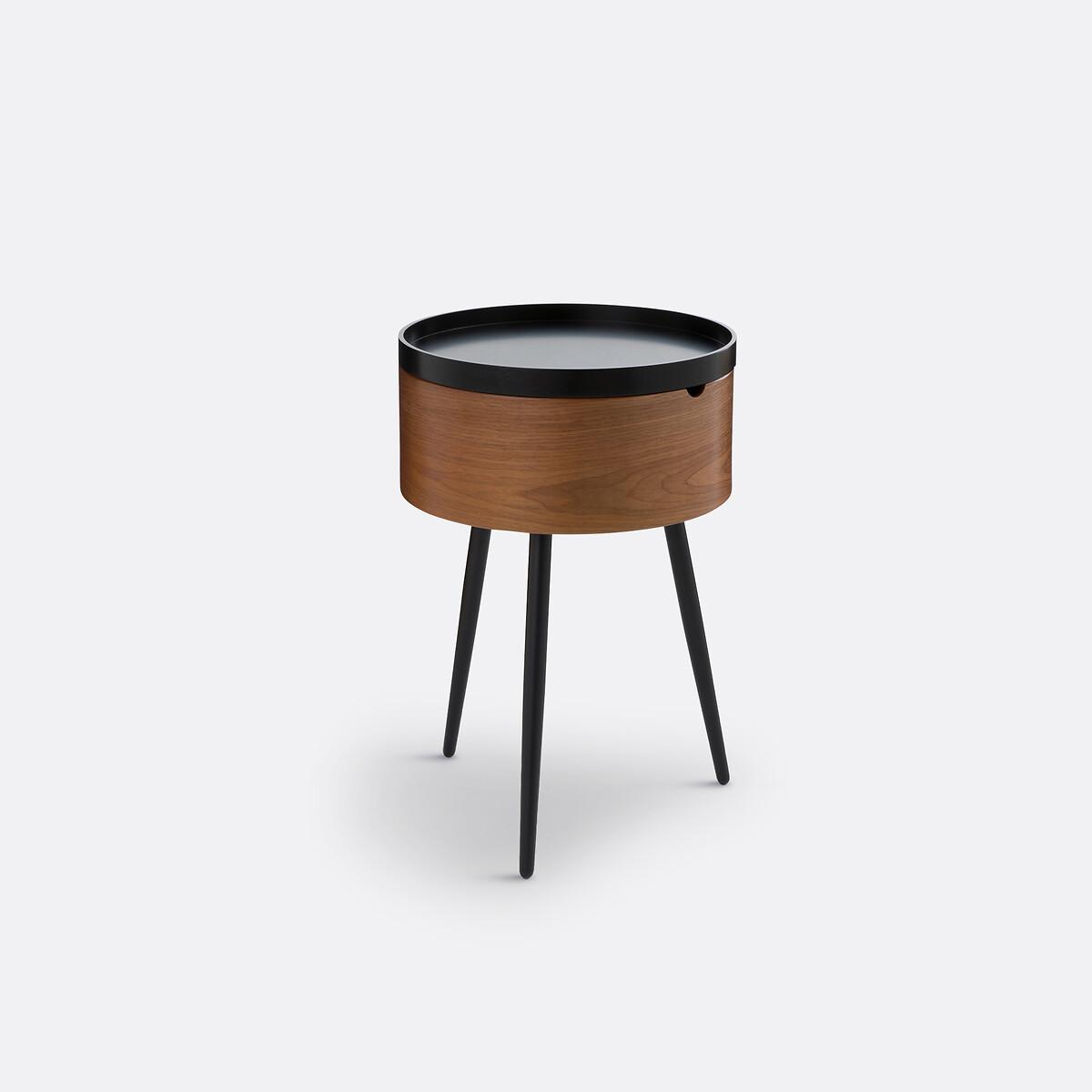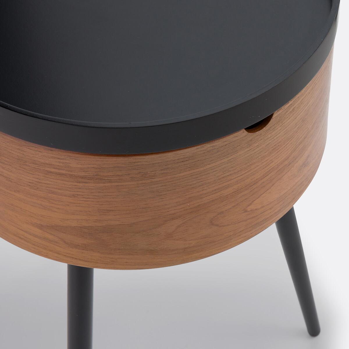 The perfect marriage of 1920s style and contemporary purity, here is the Orteo bedside table. Its walnut-veneered MDF unit and metal legs display a refined and timeless design. Practical for breakfasts in bed, its upper levwl is removable and offers storage space. Product Details • Walnut veneered MDF unit, acrylic finish • Lacquered MDF tray/lid, acrylic finish • Epoxy finish steel legs • Storage under the completely removable lid, can be used as a breakfast trayDimensions. Total • Diameter: 38cm • Height: 57.2cm • Weight: 3.2kg. Usable dimensions • Storage under the lid:L36.7 x H14 x D36.7cm • Height of legs: 39.2cmDelivery:. This product is sold ready to assemble (feet to attach). It will be delivered to your door. Note! Please check that all access points are large enough to accommodate your delivery (doors, stairs, lifts).Parcel dimensions and weight • 1 parcel • L48.5 x H26.3 x D46.5cm. 6kg
