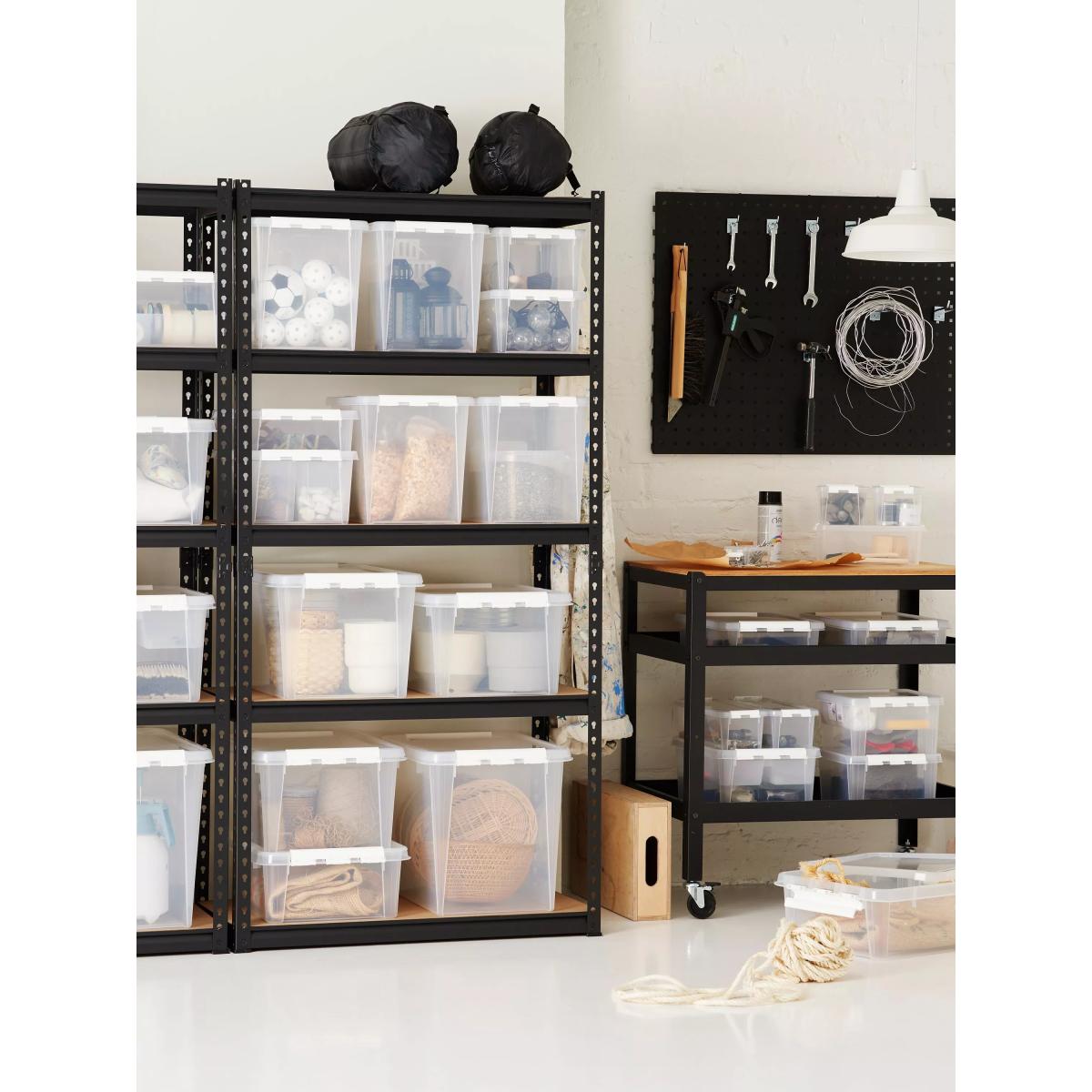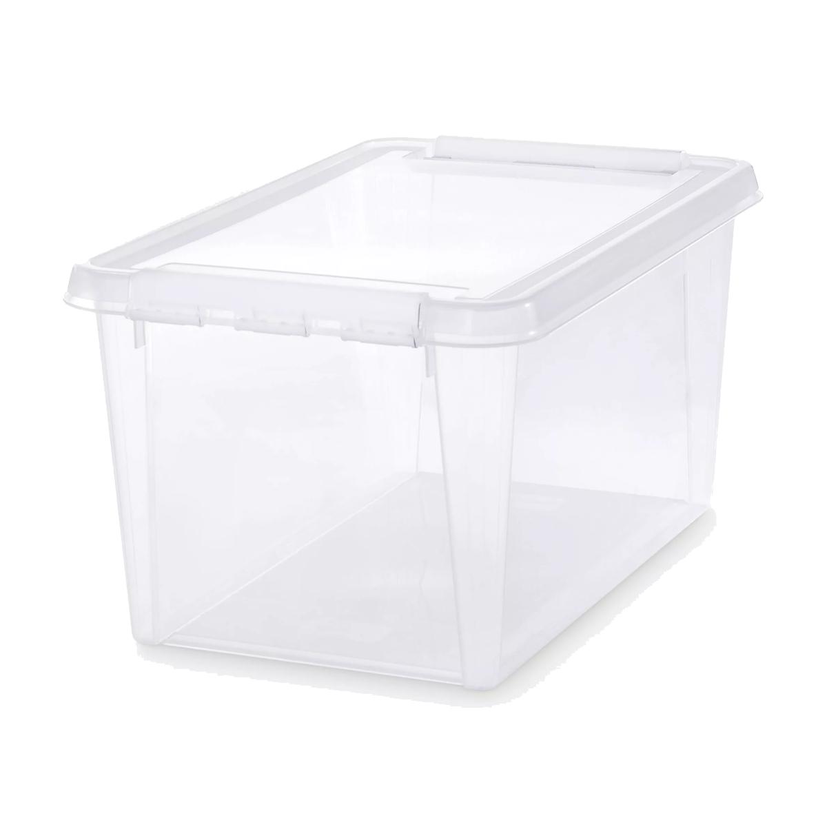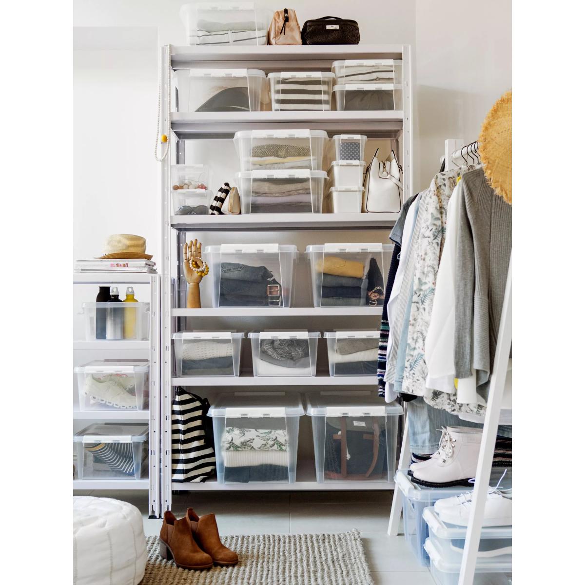 This spacious storage box is great for all round storage in hallways, bedrooms or utility rooms and is an ideal size for storing seasonal clothes, shoes, blankets and pillows. It's a'so food approved. Boxes nest without lids and stack with them on. Sturdy clips made from recycled plastic keep the lid securely in place.