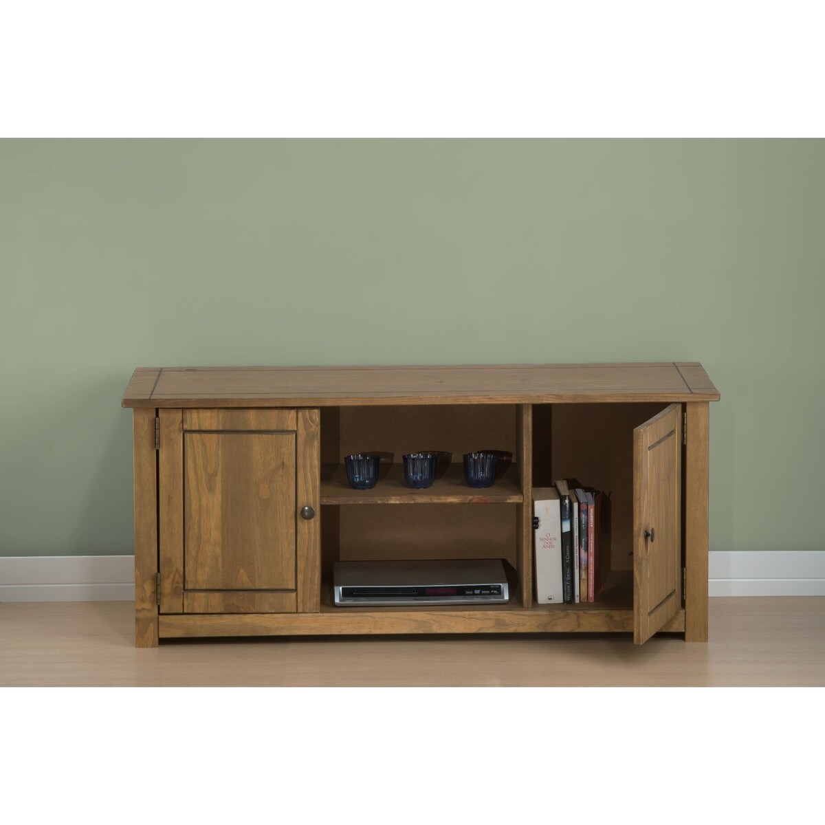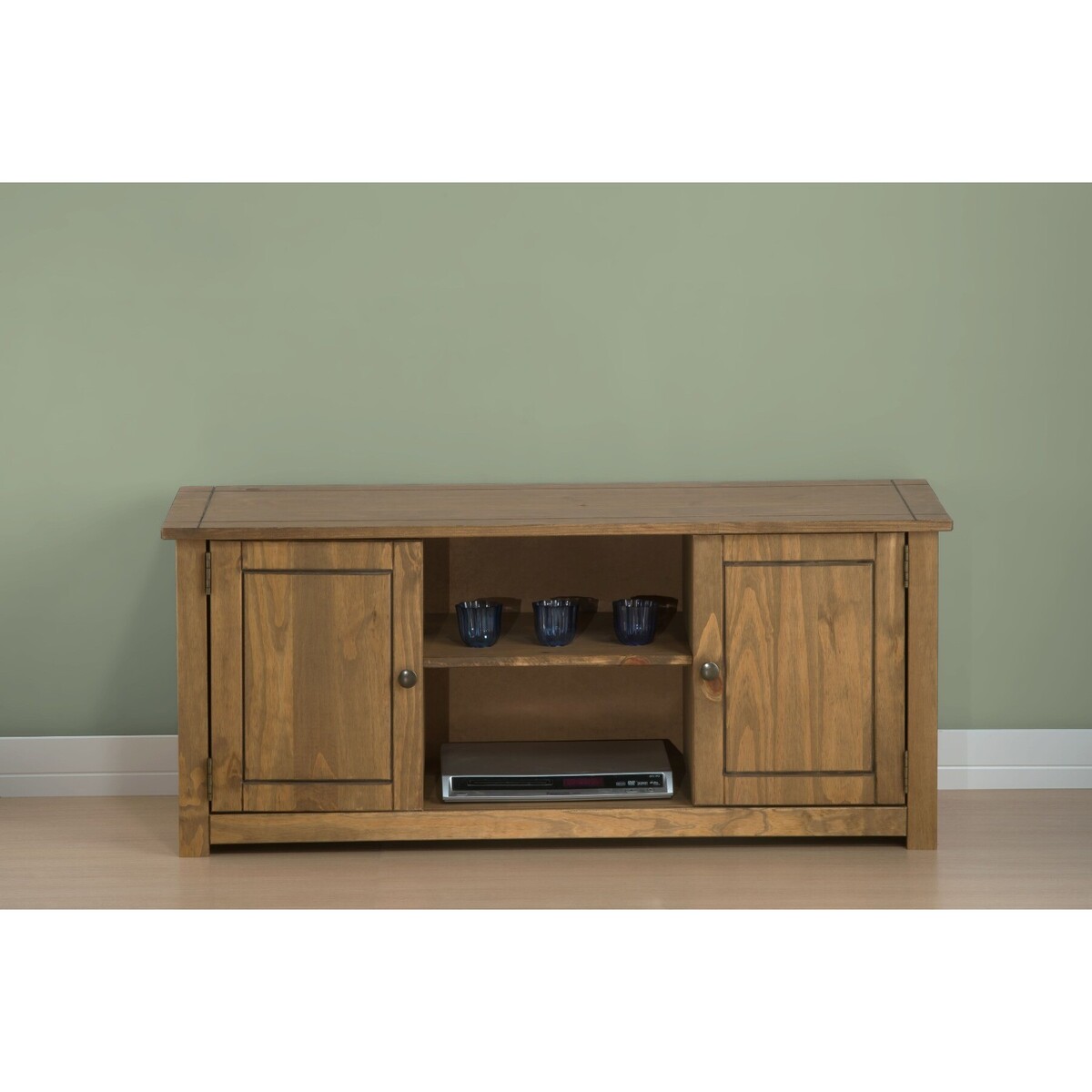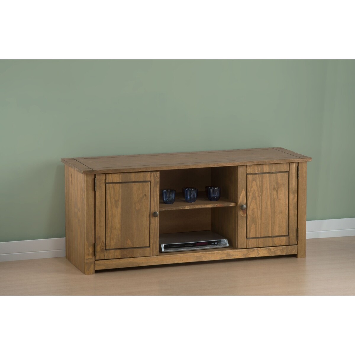 The Ortis range is crafted from stunning solid pine. Each item is finished with wax to create a modern distressed look and is adorned with simple zinc alloy handles, allowing it to match with decor of any style. This TV unit is perfect for a modern or traditional living space - with storage space hidden behind two doors, and a shelf which is an ideal spot for a set top box. Hidden storage space behind two doors. Space for set top box. High quality solid pine construction. Modern distressed waxed finish.
