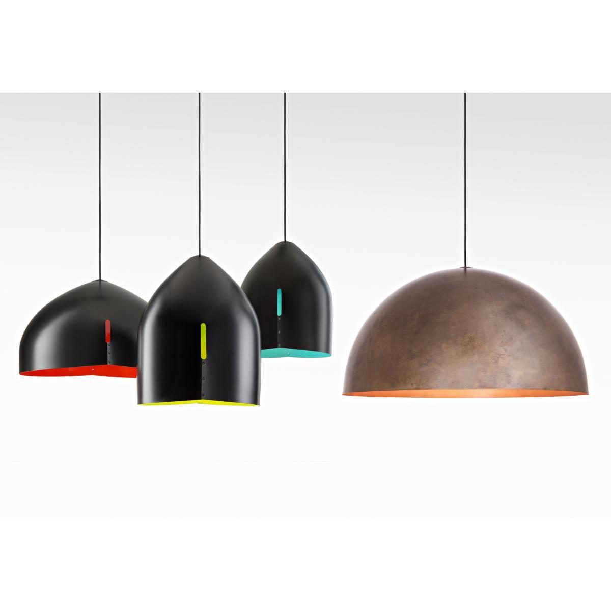 The Oru collection stands out for its original asymmetrical shape: notice the particular hole and thin organic form of the lampshade - a tribute to the art of metal-bending. Oru is available in various colours to evoke a sense of fun and mystery with contrasting interiors: the two-colour painted aluminium is black on the outside and bright red, bright green and teal blue on the inside. There is also a luxury version made completely of precious copper, burnished outside and polished internally.