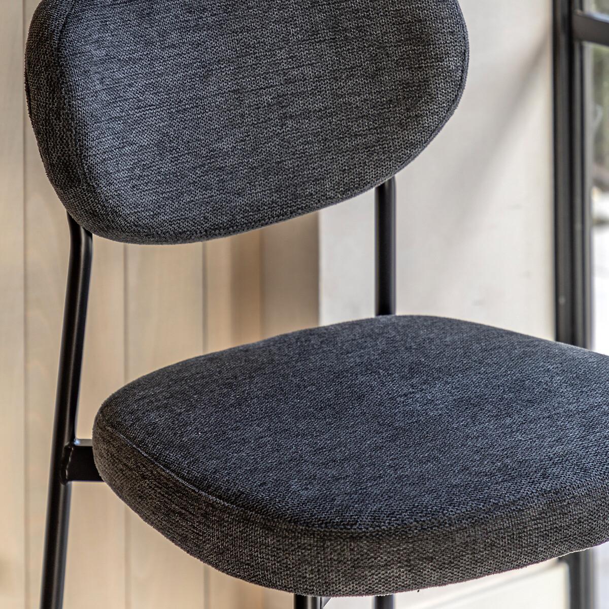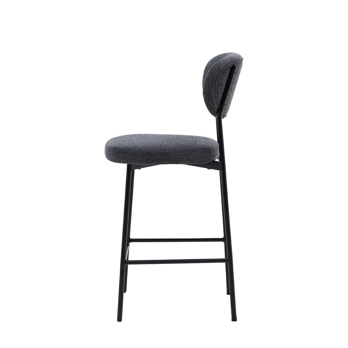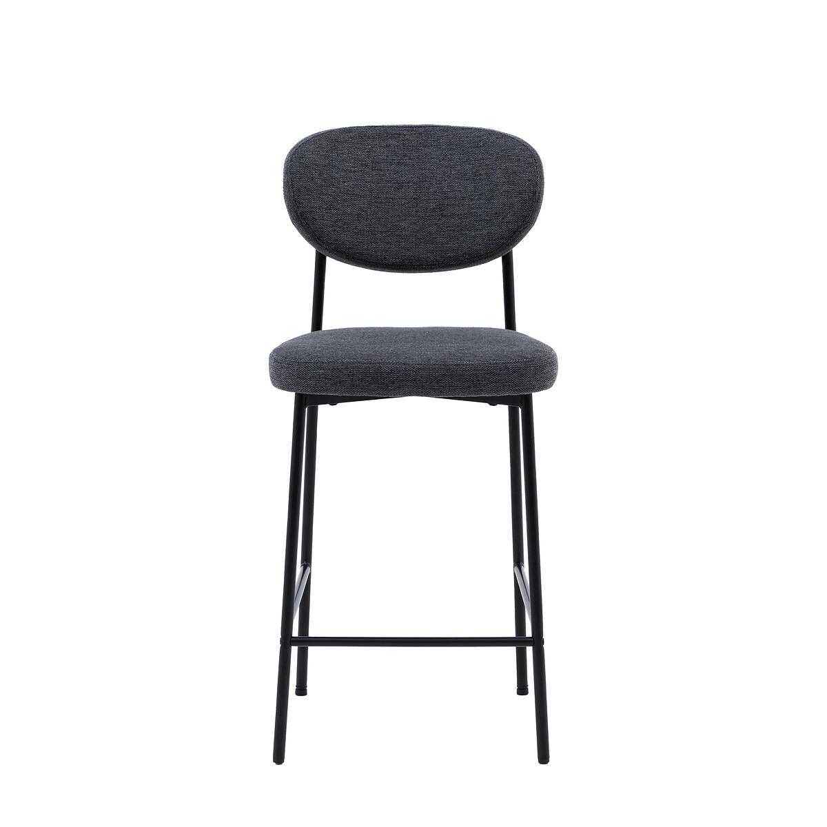 This bar stool chair is a stylish and comfortable addition to any bar counter or kitchen island. Its unique oval-shaped backrest and sleek black metal legs create a modern and eye-catching look. The soft, upholstered seat provides comfort and style, while the dark grey fabric adds a touch of sophistication. Product Details• Set of 2• Upholstered seat• Soft woven fabric• Metal frame• No assembly required• Care advice - Wipe clean with a cloth• 12 months manufacturers warranty. Product Composition - Foam / Iron / Polyester Product Dimensions - 44 cm x 52 cm x 97 cm, Weight - 11.4 KG Seat Height from floor - 65cm Seat Width - 44 cm. Seat Depth - 43 cm Clearance to floor - 59 cm Package Dimensions - 101 cm x 48 cm x 32 cm, Weight 13.3 KG This product will be dispatched by one of our trusted suppliers. You’ll be contacted by their selected courier about your delivery. Please note: this product cannot be delivered to all Offshore Islands, Northern Ireland or Republic of Ireland.