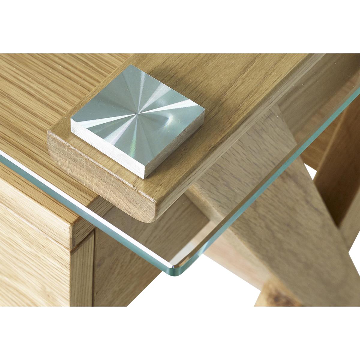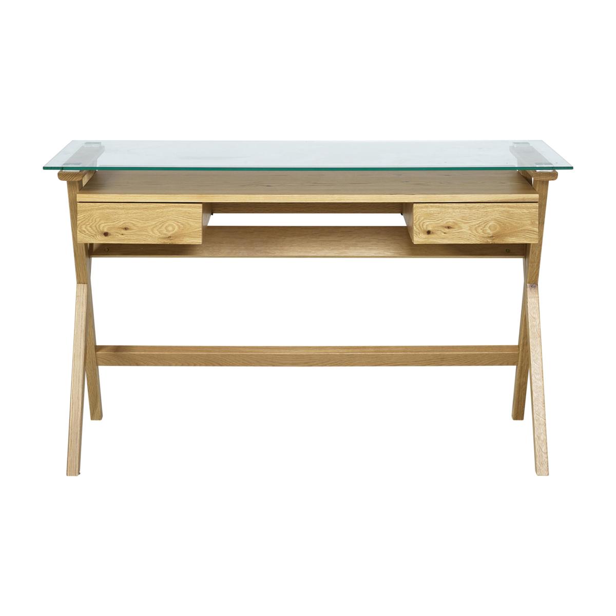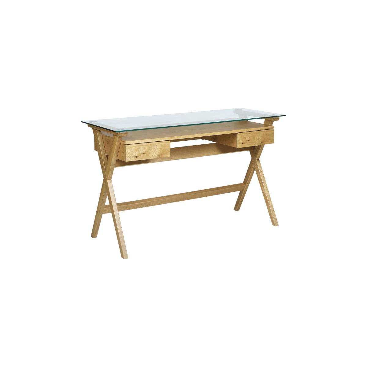 Fresh, relaxed and contemporary, the Osaka range of dining and occasional furniture pairs natural pale oak with black powder coated steel. The 8 seater dining table with its Industrial style crossed metal base is perfect paired with the elegantly curved dining chairs and a dining bench in quilted faux leather. The dining table has distinctive chamfered edges, with pale oak veneers showing off the natural grain of the wood. Complete the look with stylish occasional and storage pieces finished with slim black linear handles. Osaka is a Furniture Village exclusive at a fantastic value price. The Osaka desk is the perfect home office desk – compact, stylish and sturdy, plus it features two drawers to store chargers and notebooks. *This is a self-assembly item*. Why you'll love it. We love the cool glass top on this desk. On-trend contemporary industrial style. Space-saving design to suit all homes. Two handy drawers for storage. Exclusive to Furniture Village. Love this industrial-style desk? Browse the rest of the Osaka collection. What you need to know. Natural oak veneers have unique markings and some colour variation. The colour and tone of wood improves with age. Glass surfaces under direct light can reveal the polishing process in the form of small scratches. Take extra care when moving the glass top. Damaged glass is unsafe, so replace as soon as possible. Coasters and placemats are recommended. This item will require self-assembly. This desk pairs perfectly with the Osaka office chair.