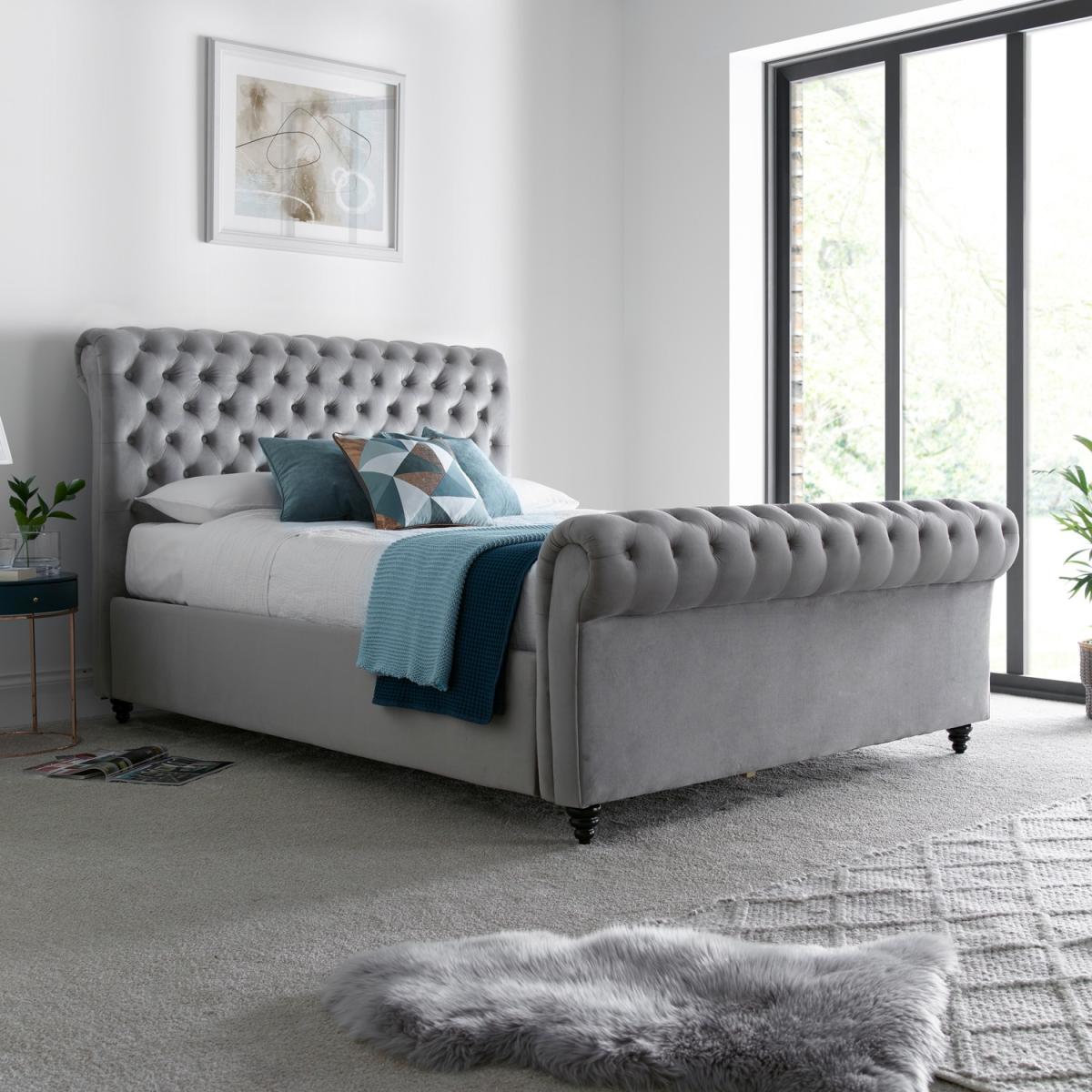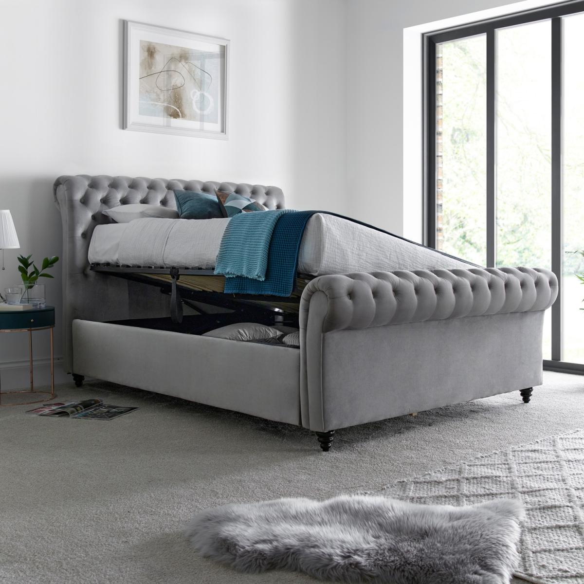 The Osbourne is a truly opulent bedframe finished with a beautiful velvet fabric. The solid frame features a stunning rolled and diamond quilted headboard with matching foot end and buttoned details. The sleigh bed is complimented with a side opening ottoman storage for the perfect balance of style and substance. The gas lift arms can be fitted to open from either side of the bed, giving you extra flexibility to fit into any room setting. The frame itself is constructed from high quality materials and uses sprung slats for mattress support. This construction, along with the wooden feet ensures the bed not only looks good but offers great strength and stability.