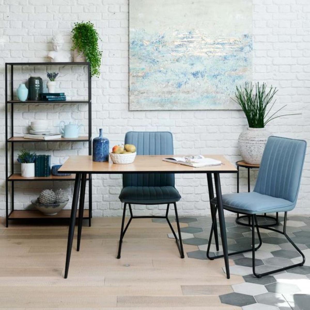The Oscar 120 x 180cm dining table is a refined and lightly proportioned table in the Industrial style, with tapered powder coated matt black metal legs and a wood-effect top, trimmed with a black edge. This 180cm dining table is perfect for sitting up to four diners, and works perfectly with our range of dining chairs.