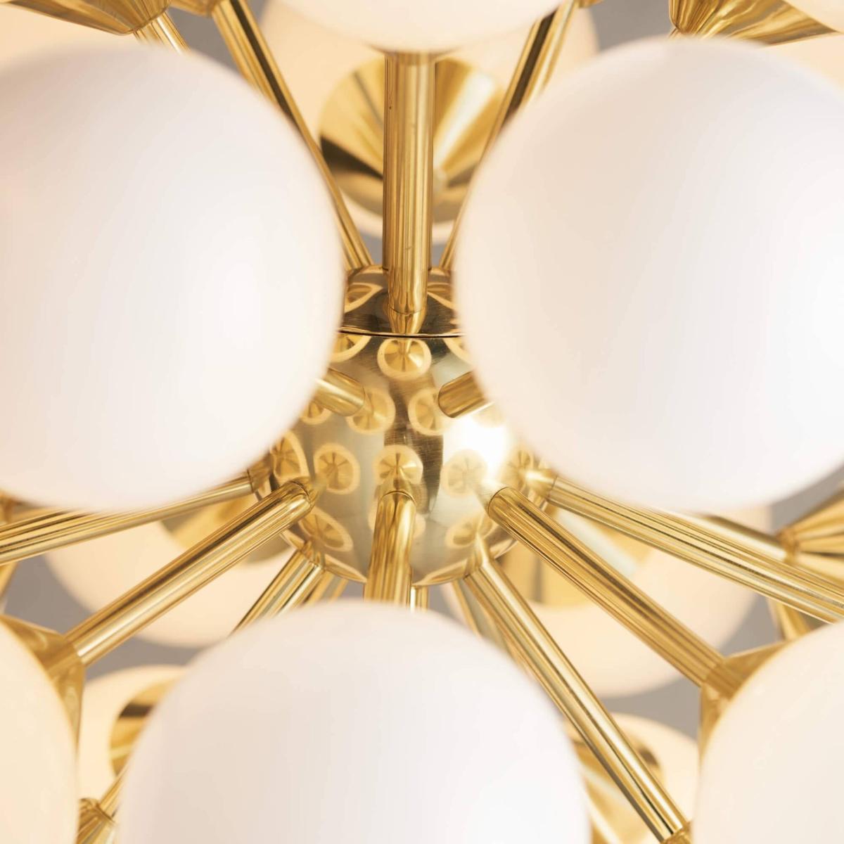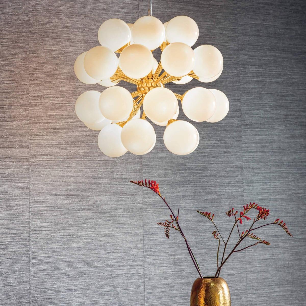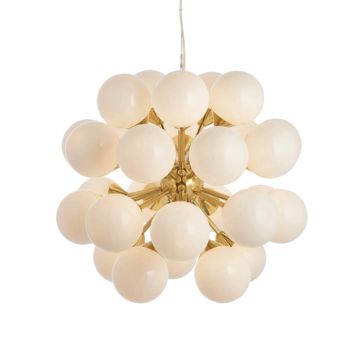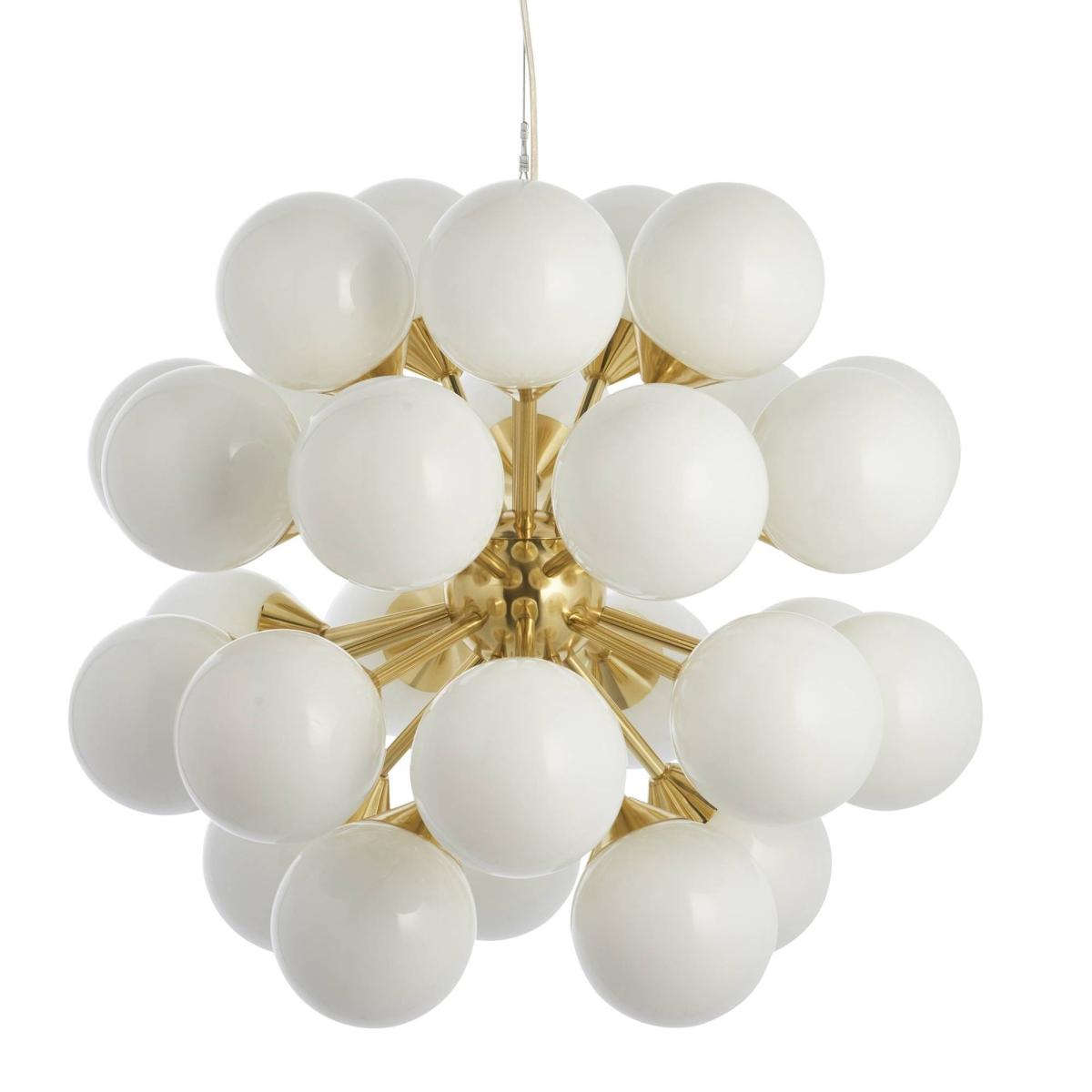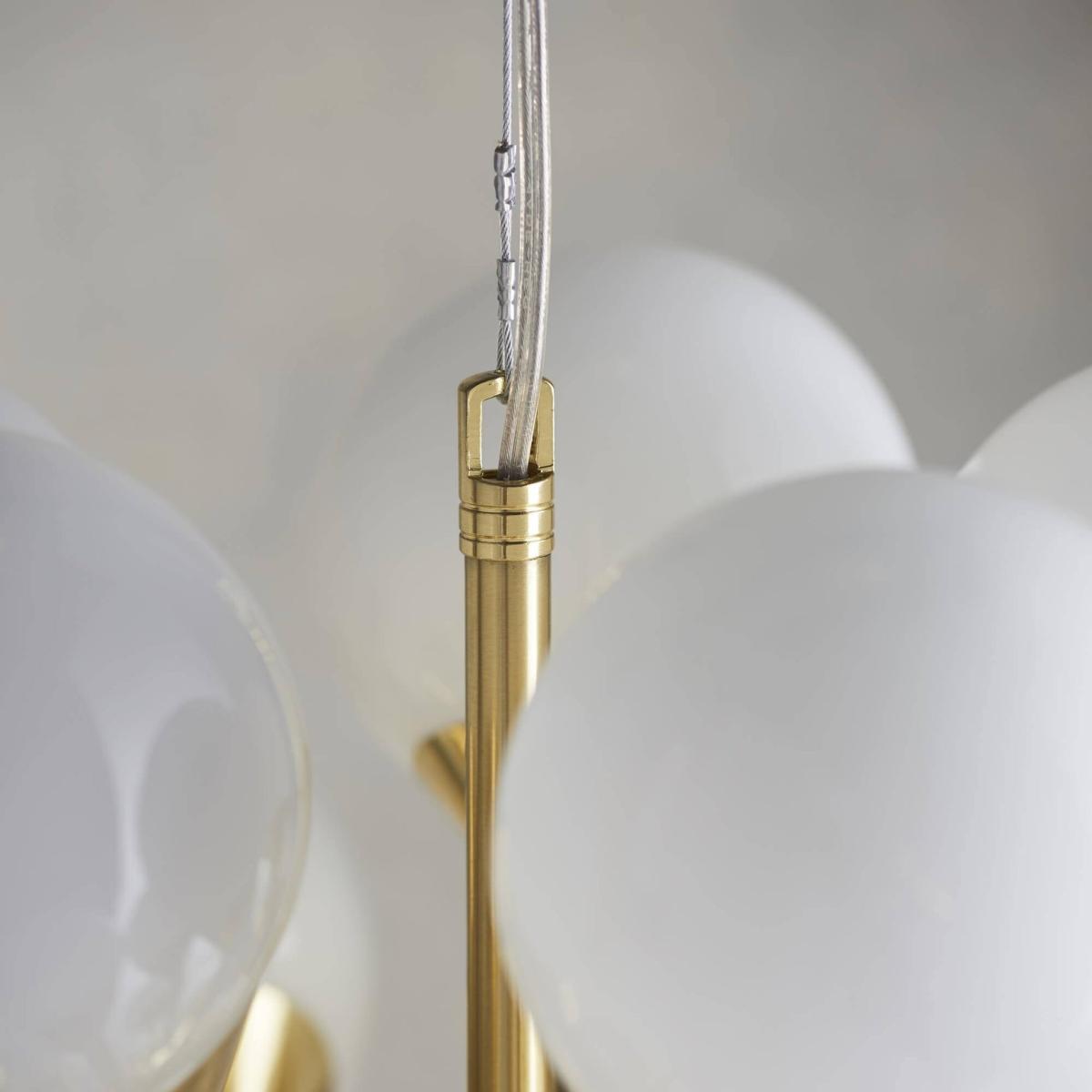 Modern 'Mid Century' pendant ceiling light with brushed gold finish. A timeless and modern design with a 'mid-century' feel, this impressive pendant light is at home in modern or classic interiors. Finished in an 'on-trend' brushed gold finish with gloss white glass shades and suspended from height adjustable thin wire cable with clear flex. Modern 'Mid Century' pendant ceiling light with brushed gold finish. A timeless and modern design with a 'mid-century' feel, this impressive pendant light is at home in modern or classic interiors. Finished in an 'on-trend' brushed gold finish with gloss white glass shades and suspended from height adjustable thin wire cable with clear flex.