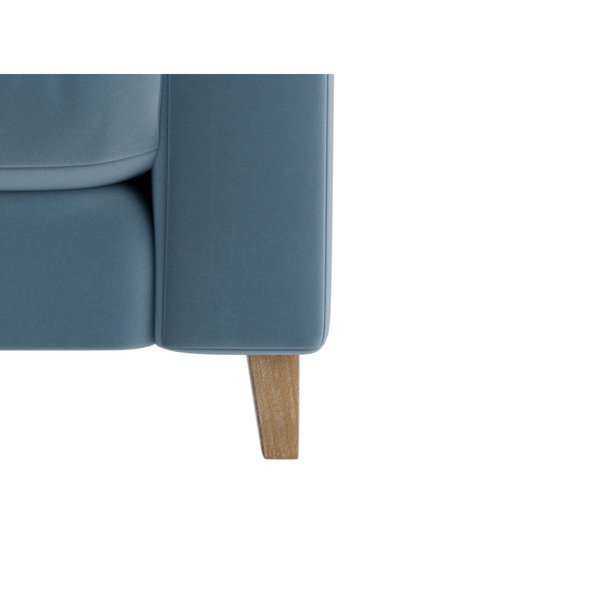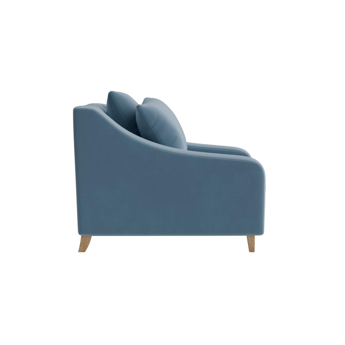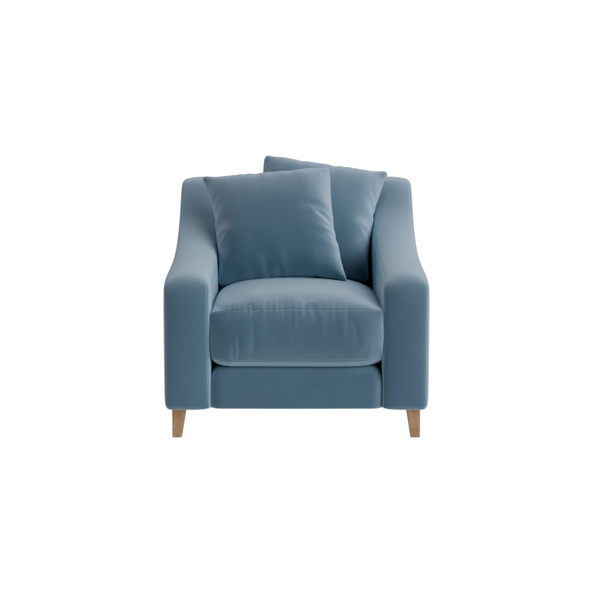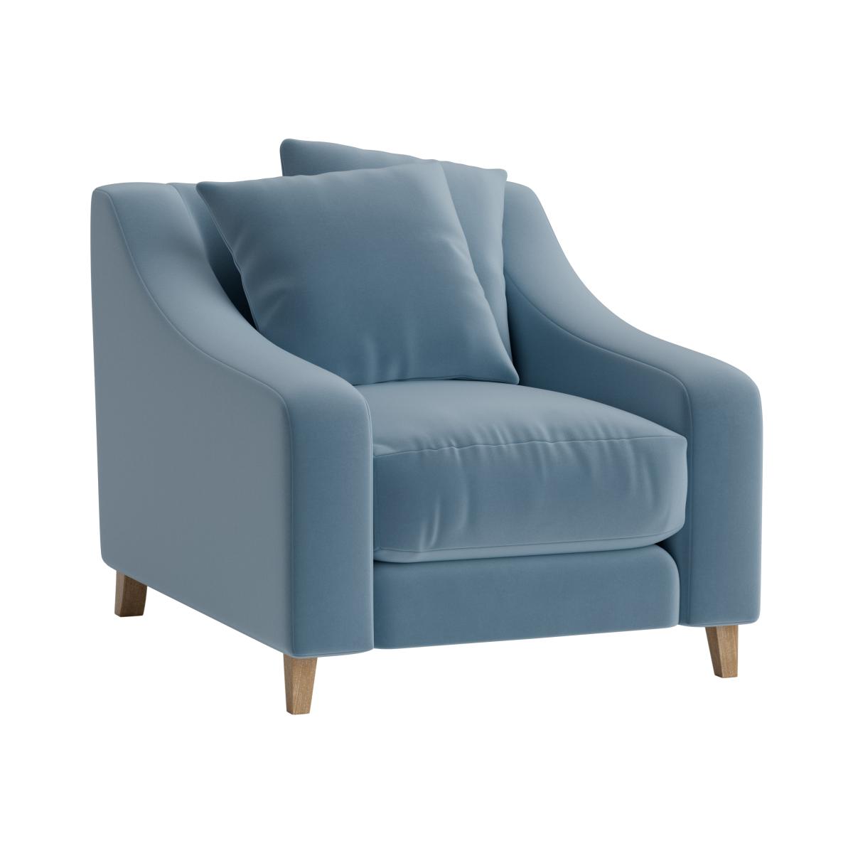 I love this armchair - it's a versatile piece that blends comfort with style effortlessly. Its soft blue hue makes it a great addition to both contemporary and classic interiors, especially when paired with neutral tones or bolder accent colours. The rounded arms and plush cushioning invite relaxation, while the wooden legs add a subtle touch of warmth and texture. Practical styling tips include layering with textured cushions or throws for added visual interest and comfort. It's perfect for living rooms, reading corners, or even a bedroom nook where a cosy seating option is needed. The size and shape make it adaptable for smaller spaces as well, without compromising on comfort or aesthetic appeal.