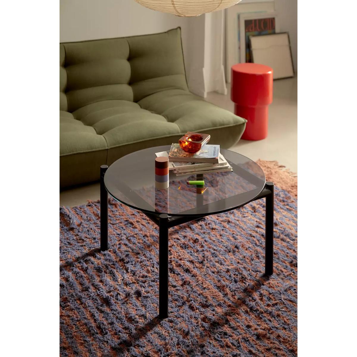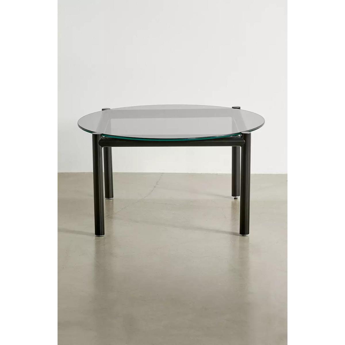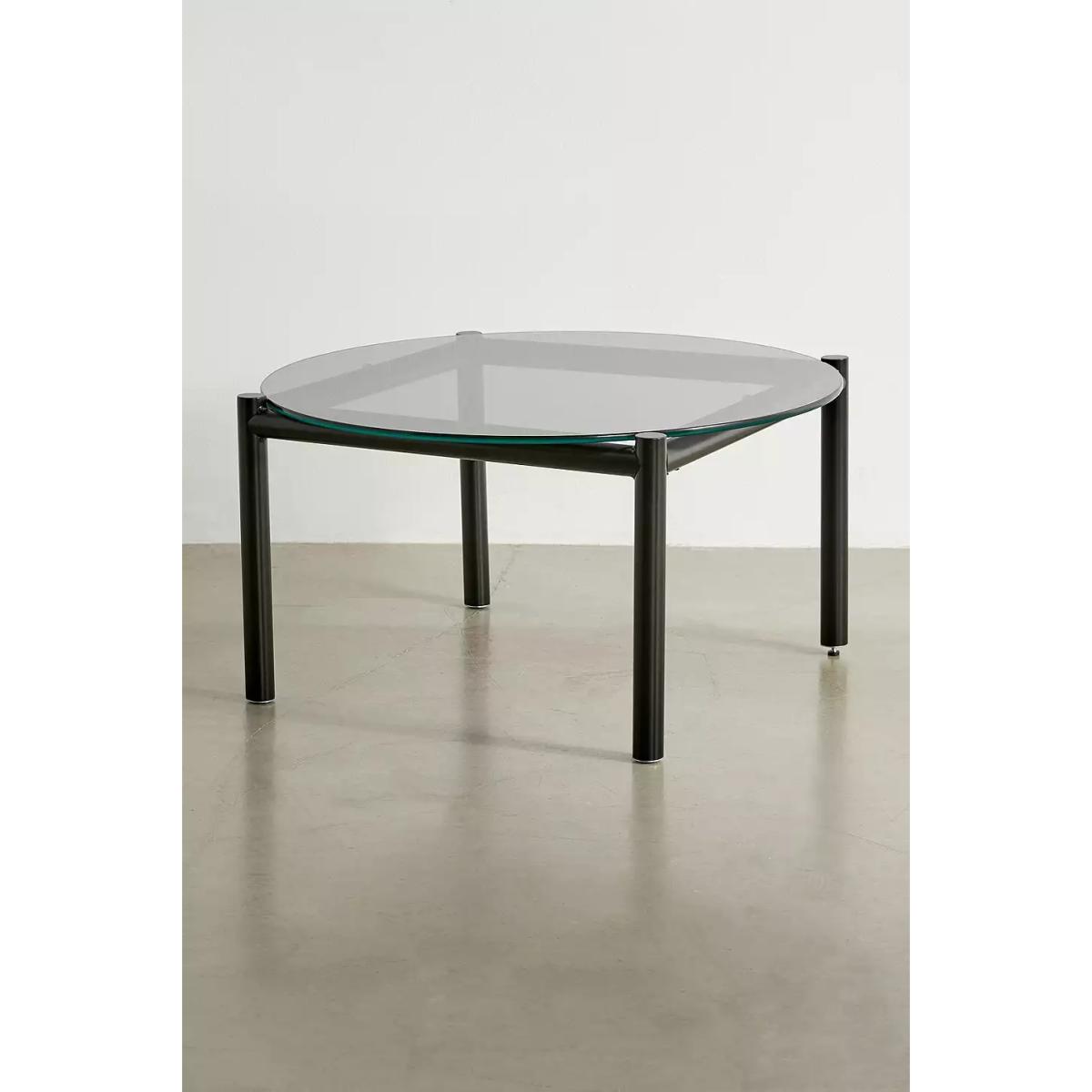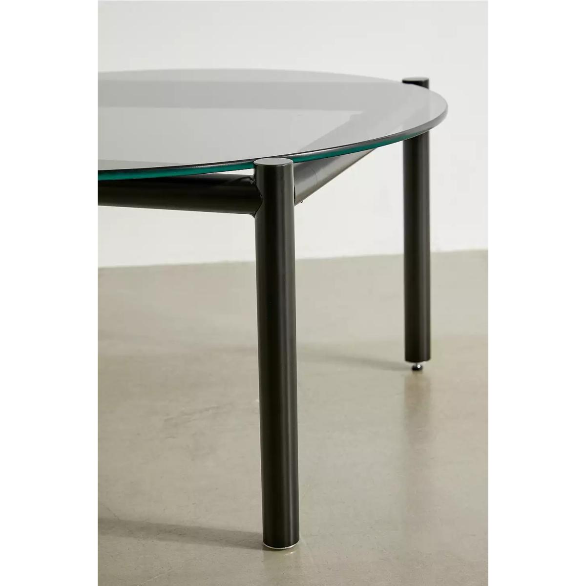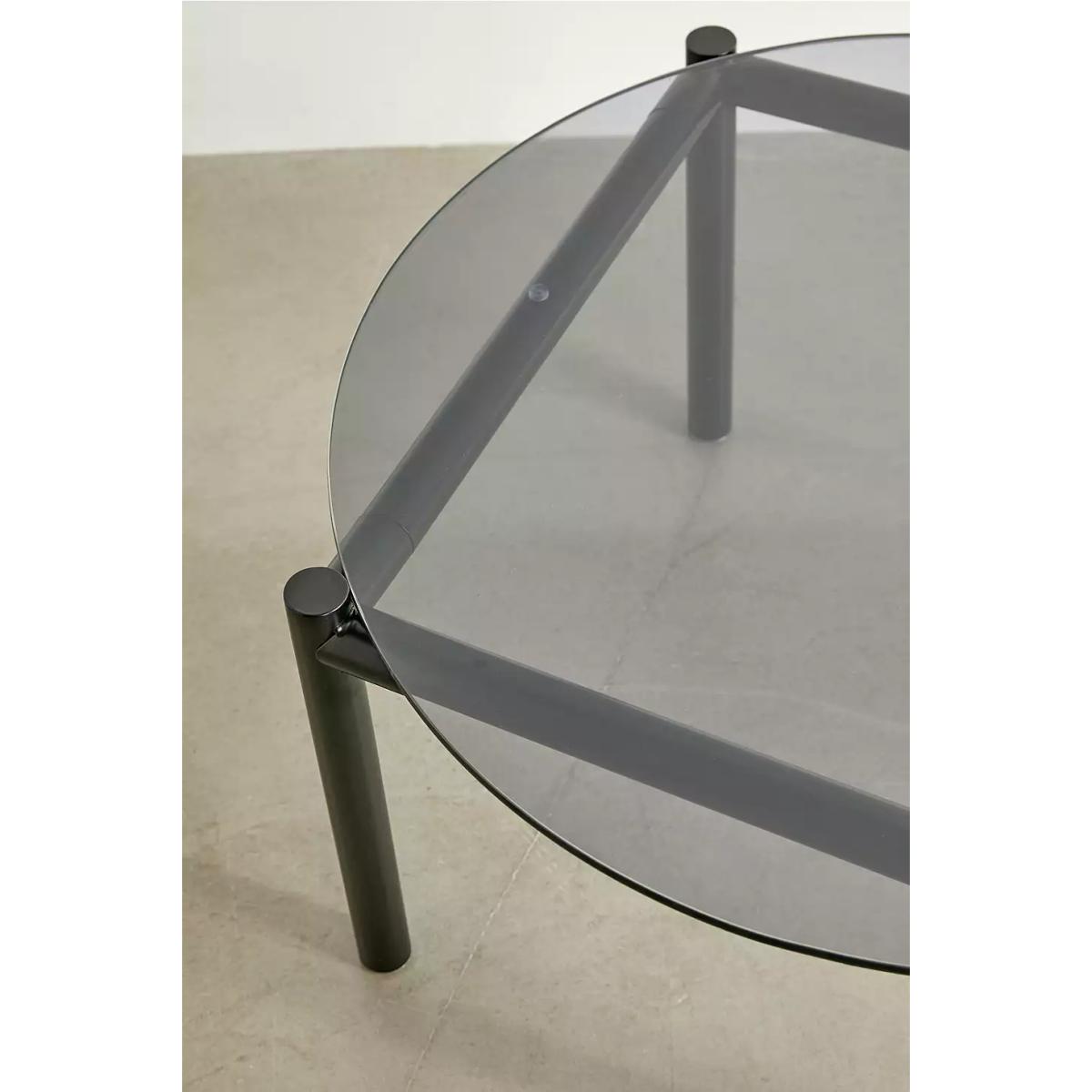 Sleek and sophisticated glass-topped coffee table for your living space. The coffee table features a round smoked glass disc atop a square metal frame in powder-coated iron, a simple yet effective solution to suit any interior aesthetic. *Online return only. This item cannot be returned instore. Please note furniture items currently cannot be shipped to Northern Ireland or The Republic of Ireland. Delivery of large furniture items may take 2-3 weeks and are therefore not eligible for Next Day Delivery.* **Content + Care** \- Glass, Iron \- Wipe clean **Size** \- 76.2cm x 40.6cm \- Leg height: 39.6cm \- Weight limit: 99 lbs \- Weight: 34.8 lbs \- Shipping package dimensions: 85cm x 17.8cm x 85cm \- Shipping package weight: 46.3 lbs