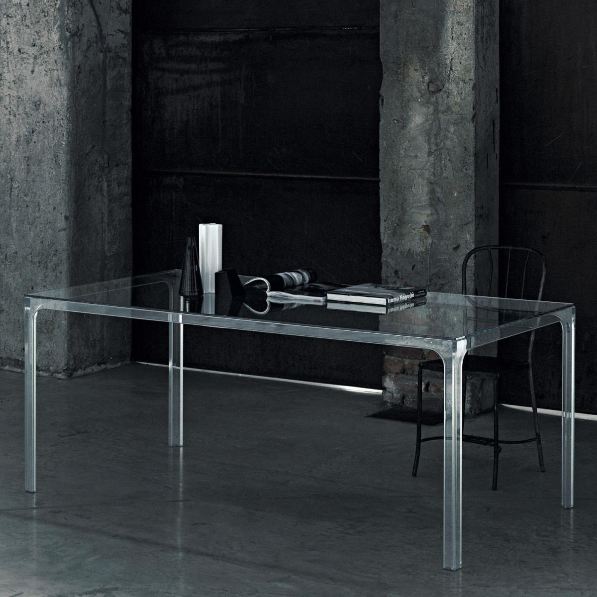Table in transparent extra-light glass characterised by extreme lightness and formal cleanness. The very slender base, despite of an apparent fragility and fineness, is solid and resistant thanks to a special chemical tempering treatment of the glass.
