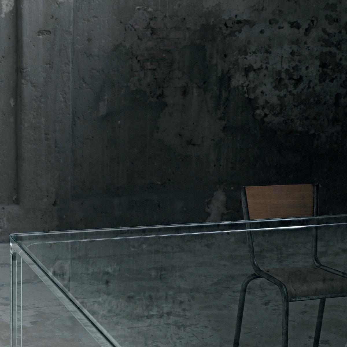 Table in transparent extra-light glass characterised by extreme lightness and formal cleanness. The very slender base, despite of an apparent fragility and fineness, is solid and resistant thanks to a special chemical tempering treatment of the glass.