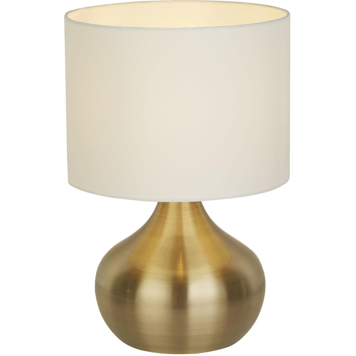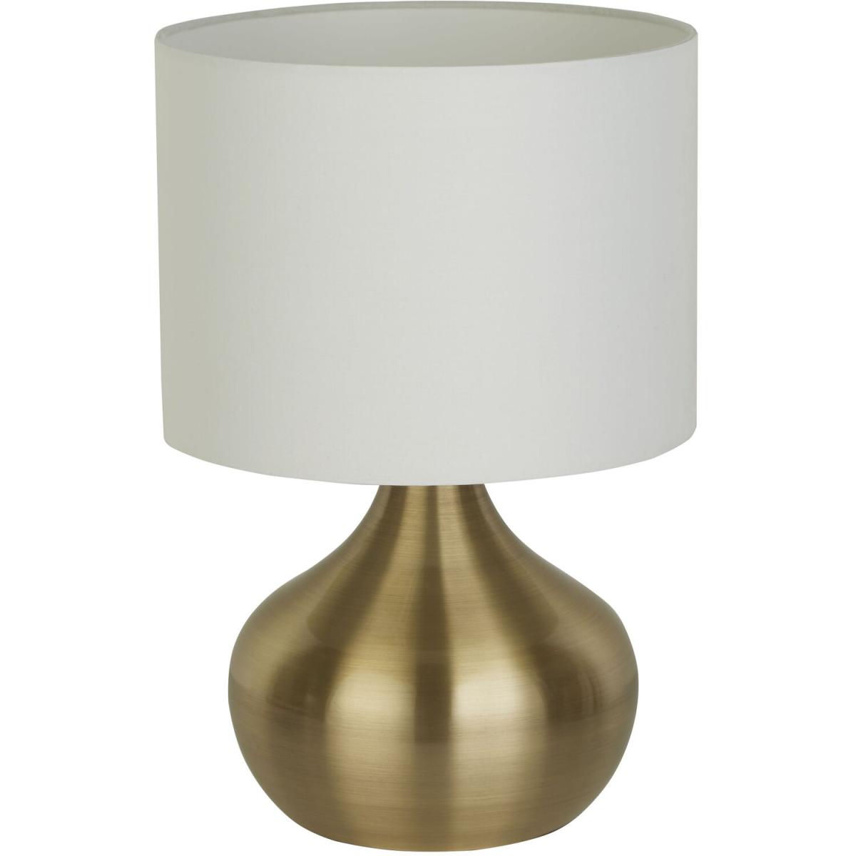 Stylish contemporary cream and antique brass table lamp, perfect portable addition to any corner needing additional evening light.