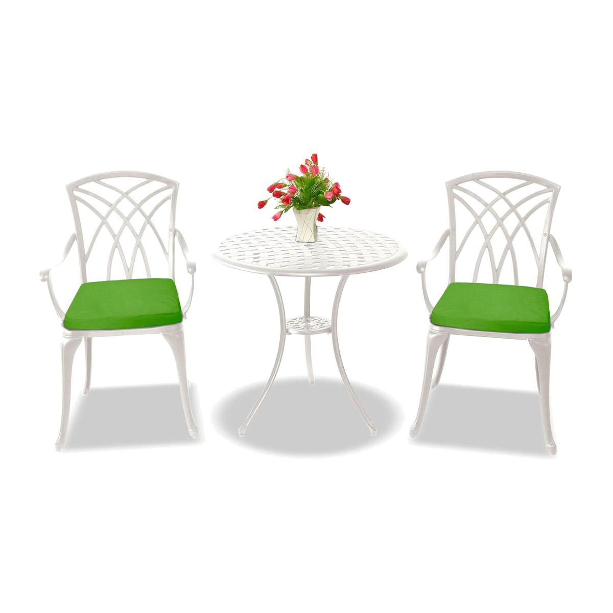 With its deluxe design, the Oshowa bistro set is both practical and convenient, and perfect for maximising any space. It is perfect for any garden, patio, terrace, decking, balcony, lawn, yard or similar areas, and adds a touch of elegance wherever it sits. The Oshowa is a 3-piece bistro set featuring 2-high backed large chairs with armrests and a matching table. It promotes a French influenced design, with weave pattern chairs, detailed weave pattern table top, and stylish legs. The table comes complete with a central hole for the placement of an umbrella or parasol with a diameter of 3.5cm. Made from no-rust cast aluminium, the Oshowa outdoor bistro set is strong yet lighter and easier to move than the traditional cast iron predecessor. It is low maintenance and easy to keep clean, it has been powder coated for durability and comes complete with rubber pads for steadiness. The Oshowa garden bistro set comes complete with Water Resistant cushions, which are purpose-designed for outdoor use and made of high quality soft polyester. They have removable zipped covers and ties to secure to the chair. Each cushion measures as follows:Length: 40cm x Width: 42cm X Thickness: 5cm. The Oshowa metal bistro set comes flat-packed with simple and easy-to-follow home assembly instructions. Each Chair measures as follows: Width: 52cm x Depth: 48.5cm x Height: 89cm / Weight capacity: 130kg. The Table measures as follows: Diameter: 70cm x Height: 68.5cm, Parasol Diameter: 3.5cm / Weight Capacity: 50kg. The Oshowa comes complete with a 1-Year Manufacturers Warranty Included.