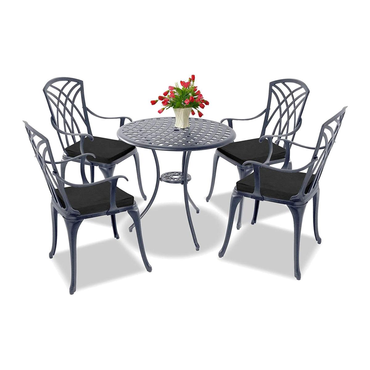 The Oshowa is a 5-piece bistro set featuring 4-high backed large chairs with armrests and a matching table. It promotes a French influenced design, with weave pattern chairs, detailed weave pattern table top, and stylish legs. The table comes complete with a central hole for the placement of an umbrella or parasol with a diameter of 3.5cm. With its deluxe design, the Oshowa outdoor bistro set is both practical and convenient, and perfect for maximising any space. It is perfect for any garden, patio, terrace, decking, balcony, lawn, yard or similar areas, and adds a touch of elegance wherever it sits. Made from no-rust cast aluminium, the Oshowa garden bistro set is strong yet lighter and easier to move than the traditional cast iron predecessor. It is low maintenance and easy to keep clean, it has been powder coated for durability and comes complete with rubber pads for steadiness. The Oshowa 5-piece bistro set comes complete with Water Resistant cushions, which are purpose-designed for outdoor use and made of high quality soft polyester. They have removable zipped covers and ties to secure to the chair. Each cushion measures as follows:Length: 40cm x Width: 42cm x Thickness: 5cm. The Oshowa metal bistro set comes flat-packed with simple and easy-to-follow home assembly instructions. Each Chair measures as follows: Width: 52cm x Depth: 48.5cm x Height: 89cm / Weight capacity: 130kg. The Table measures as follows: Diameter: 70cm x Height: 68.5cm / Parasol Diameter: 3.5cm / Weight Capacity: 50kg. The Oshowa comes complete with a 1-Year Manufacturers Warranty Included.