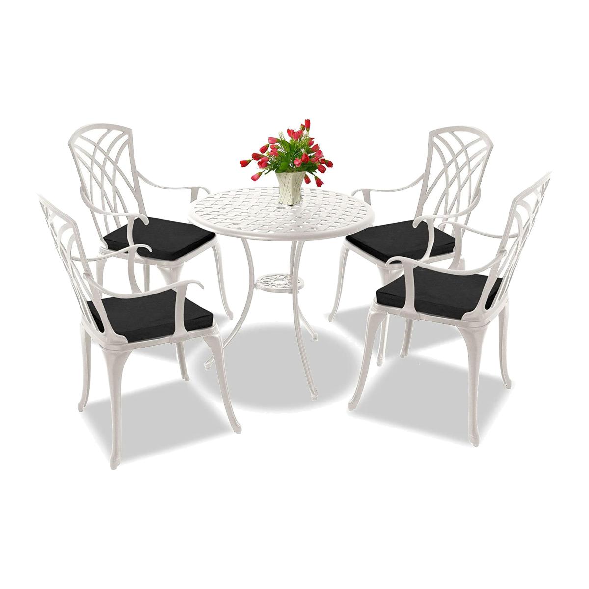 The Oshowa is a 5-piece bistro set featuring 4-high backed large chairs with armrests and a matching table. It promotes a French influenced design, with weave pattern chairs, detailed weave pattern table top, and stylish legs. The table comes complete with a central hole for the placement of an umbrella or parasol with a diameter of 3.5cm. With its deluxe design, the Oshowa outdoor bistro set is both practical and convenient, and perfect for maximising any space. It is perfect for any garden, patio, terrace, decking, balcony, lawn, yard or similar areas, and adds a touch of elegance wherever it sits. Made from no-rust cast aluminium, the Oshowa garden bistro set is strong yet lighter and easier to move than the traditional cast iron predecessor. It is low maintenance and easy to keep clean, it has been powder coated for durability and comes complete with rubber pads for steadiness. The Oshowa 5-piece bistro set comes complete with Water Resistant cushions, which are purpose-designed for outdoor use and made of high quality soft polyester. They have removable zipped covers and ties to secure to the chair. Each cushion measures as follows:Length: 40cm x Width: 42cm x Thickness: 5cm. The Oshowa metal bistro set comes flat-packed with simple and easy-to-follow home assembly instructions. Each Chair measures as follows: Width: 52cm x Depth: 48.5cm x Height: 89cm / Weight capacity: 130kg. The Table measures as follows: Diameter: 70cm x Height: 68.5cm / Parasol Diameter: 3.5cm / Weight Capacity: 50kg. The Oshowa comes complete with a 1-Year Manufacturers Warranty Included.