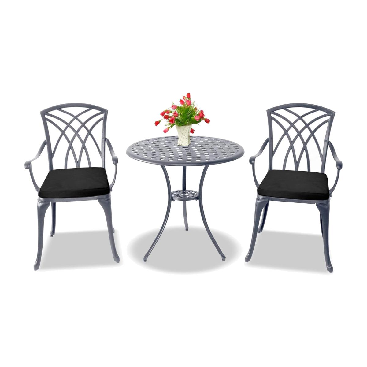 With its deluxe design, the Oshowa bistro set is both practical and convenient, and perfect for maximising any space. It is perfect for any garden, patio, terrace, decking, balcony, lawn, yard or similar areas, and adds a touch of elegance wherever it sits. The Oshowa is a 3-piece bistro set featuring 2-high backed large chairs with armrests and a matching table. It promotes a French influenced design, with weave pattern chairs, detailed weave pattern table top, and stylish legs. The table comes complete with a central hole for the placement of an umbrella or parasol with a diameter of 3.5cm. Made from no-rust cast aluminium, the Oshowa outdoor bistro set is strong yet lighter and easier to move than the traditional cast iron predecessor. It is low maintenance and easy to keep clean, it has been powder coated for durability and comes complete with rubber pads for steadiness. The Oshowa garden bistro set comes complete with Water Resistant cushions, which are purpose-designed for outdoor use and made of high quality soft polyester. They have removable zipped covers and ties to secure to the chair. Each cushion measures as follows:Length: 40cm x Width: 42cm x Thickness: 5cm. The Oshowa metal bistro set comes flat-packed with simple and easy-to-follow home assembly instructions. Each Chair measures as follows: Width: 52cm x Depth: 48.5cm x Height: 89cm / Weight capacity: 130kg. The Table measures as follows: Diameter: 70cm x Height: 68.5cm, Parasol Diameter: 3.5cm / Weight Capacity: 50kg. The Oshowa comes complete with a 1-Year Manufacturers Warranty Included.