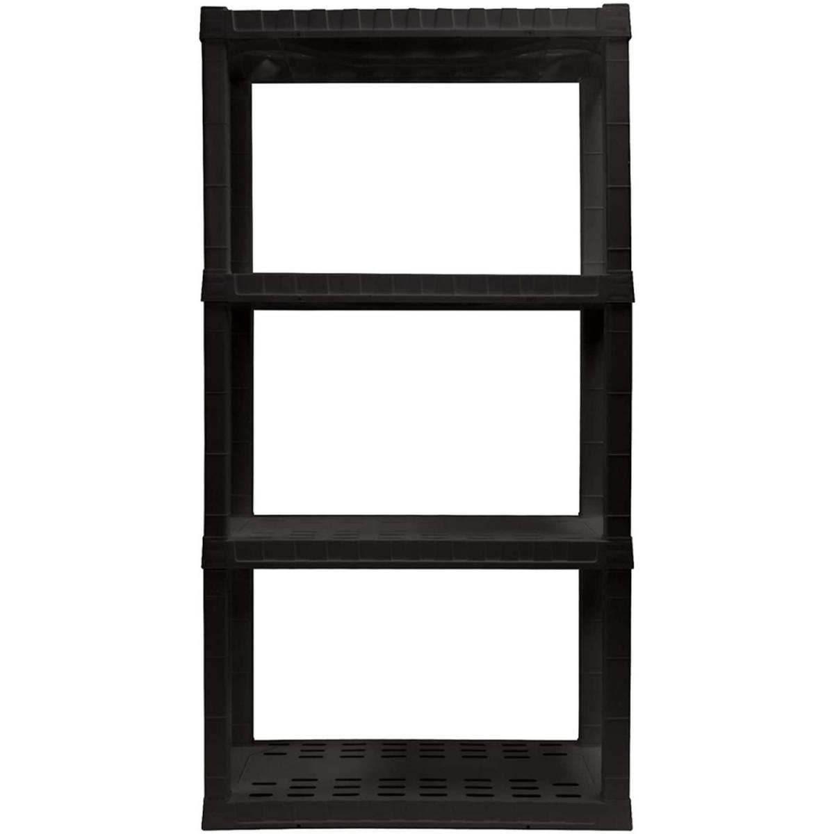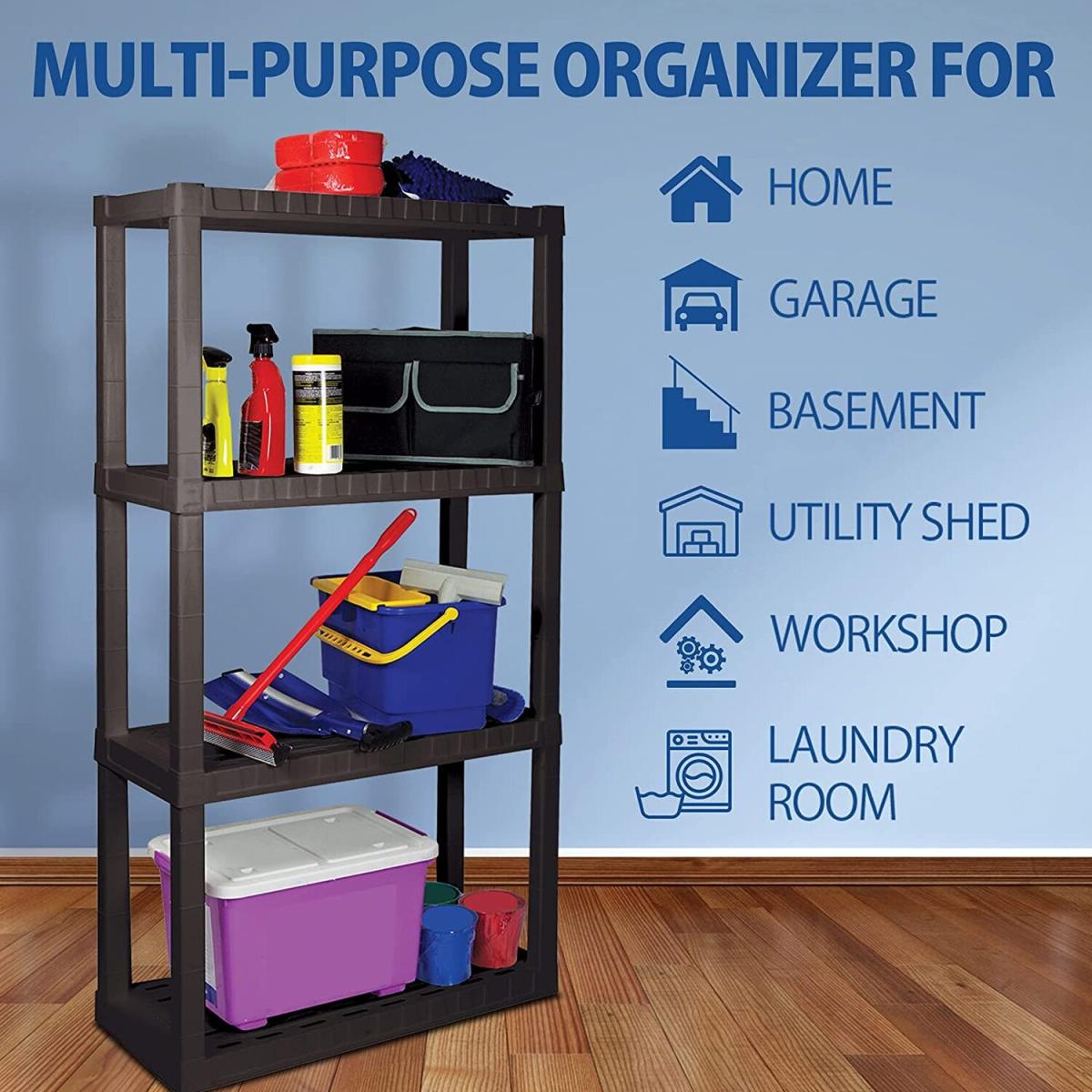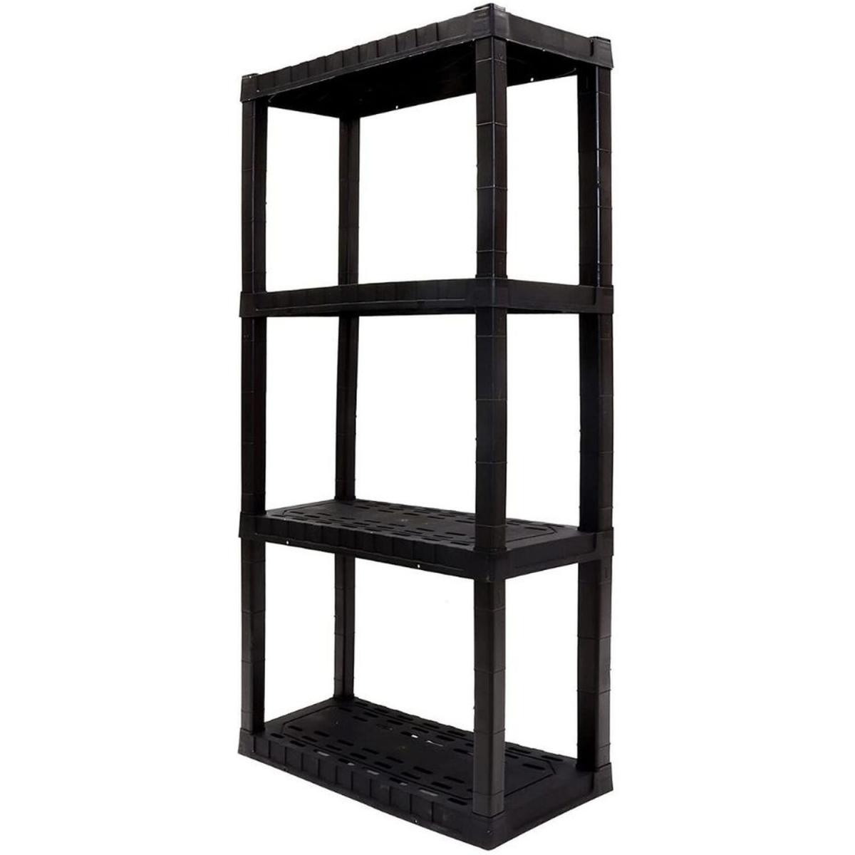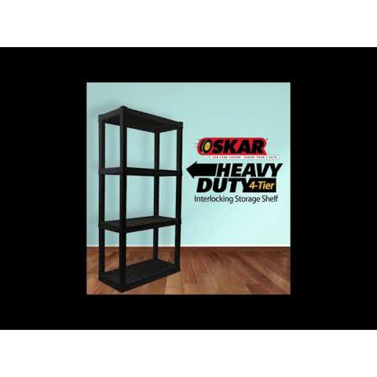 Organize your life with Oskar storage shelves: Adding shelving is one of the simplest ways to organize even the most limited spaces, protect your items from damp floors, and more. Maximize your storage space with this versatile 4-tier shelving unit, proudly manufactured in North America. This lightweight unit snaps together with no tools required and can be assembled and moved by just one person so you can get started on your home organization project right away. Heavy-duty molded plastic resin shelves hold up to 100 lbs (45 kg) each for a total storage capacity of 400 lbs and will not rust, dent, stain, or peel. Nested legs and anchor holes offer added support and security and ventilation holes in the shelves allow air to flow freely around your items for low-maintenance long-term storage. Whether you are decluttering your basement, organizing your craft room, or spring cleaning your garage, Oskar has the perfect shelving solution for you