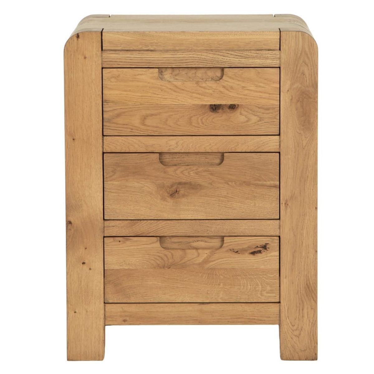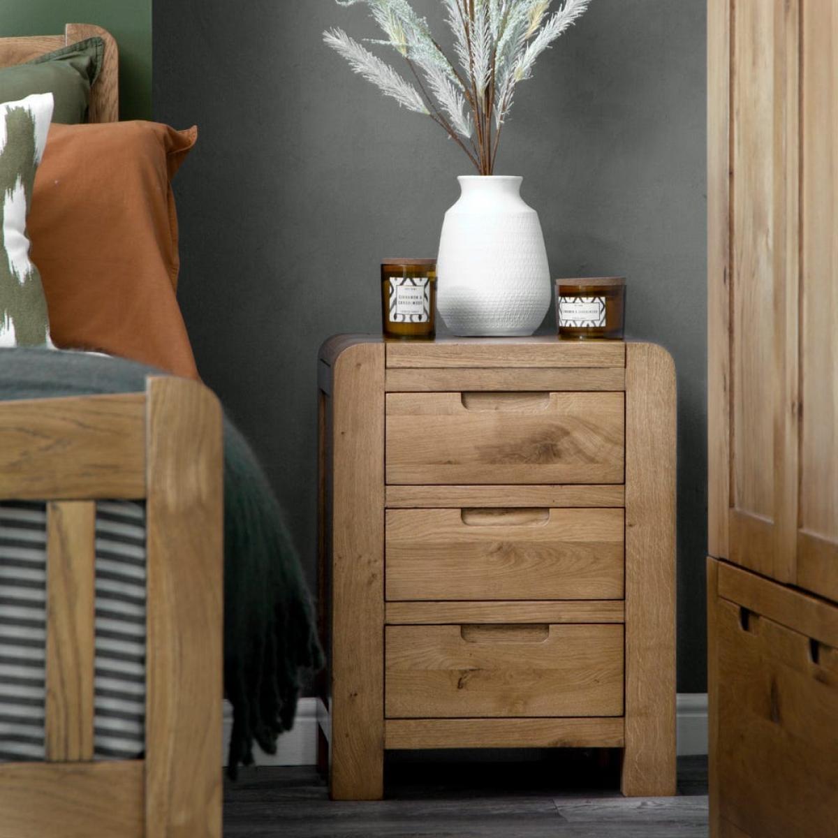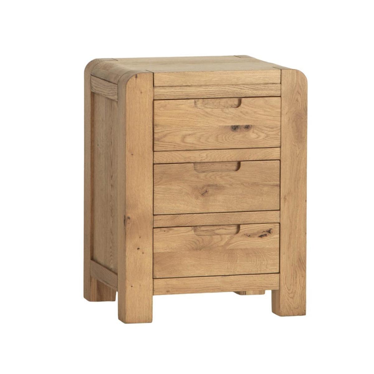 Invite cosy Scandi design into your bedroom with this eye-catching Oslo chunky oak 3-drawer bedside table. This stylish piece features all the homely touches that define our Oslo collection, and the appealing light oak finish will complement any style of bedroom. This table has rounded corners to soften the chunky frame, and the drawers feature inset handles that show off the grain in the oak. Use the top for a lamp and your pile of must-reads, and keep valuables in the spacious drawers. This bedside table comes ready assembled, so you can place it in situ without further ado.