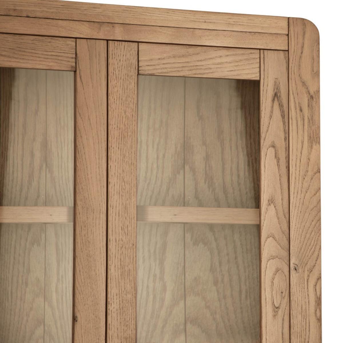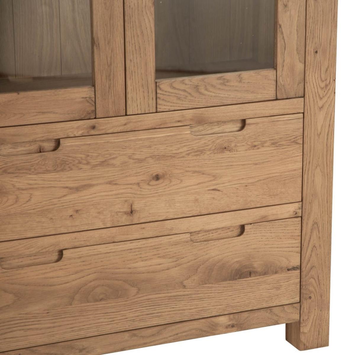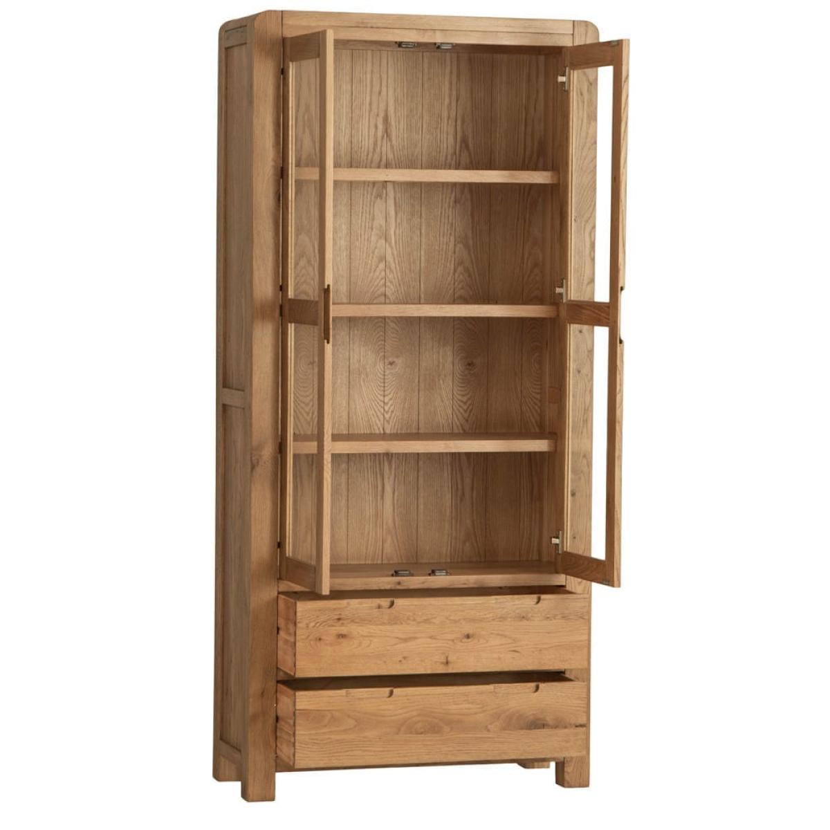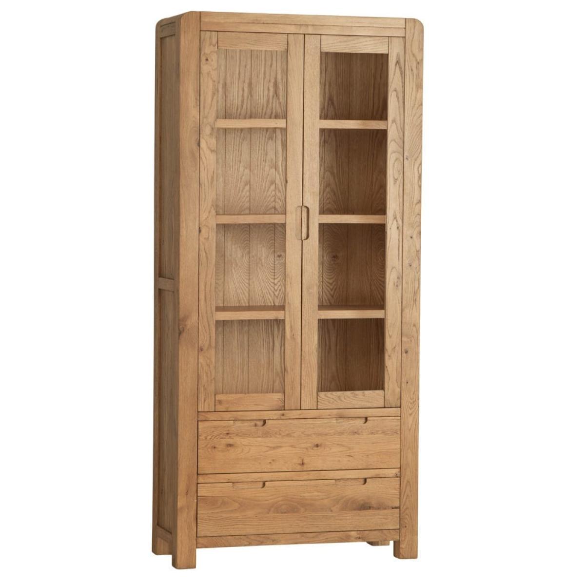 This Oslo chunky oak large display cabinet combines a stocky oak frame with elegant glass doors to show off your favourite tableware in style. There are four shelves for your prettiest plates, cups and glasses, and a pair of large drawers at the base for table linen and placemats. The sturdy golden oak frame showcases the natural features of the wood, while the rounded corners soften the silhouette. This fine balance of styles suits both traditional and modern homes. Keep this display cabinet in your kitchen for additional storage or show it off in your dining area for maximum impact.