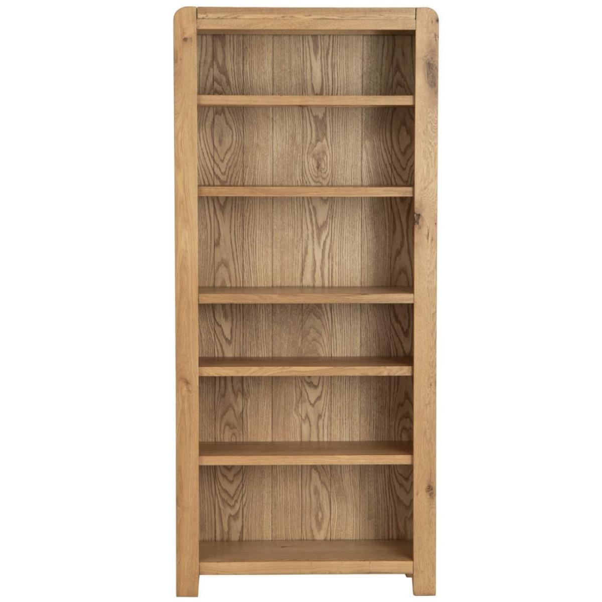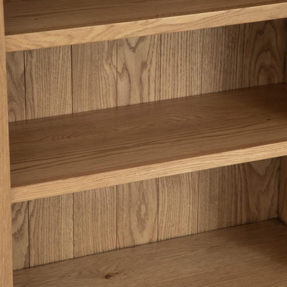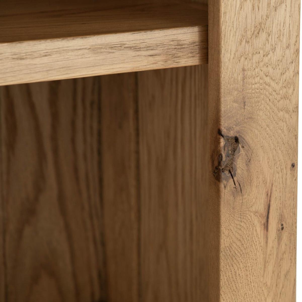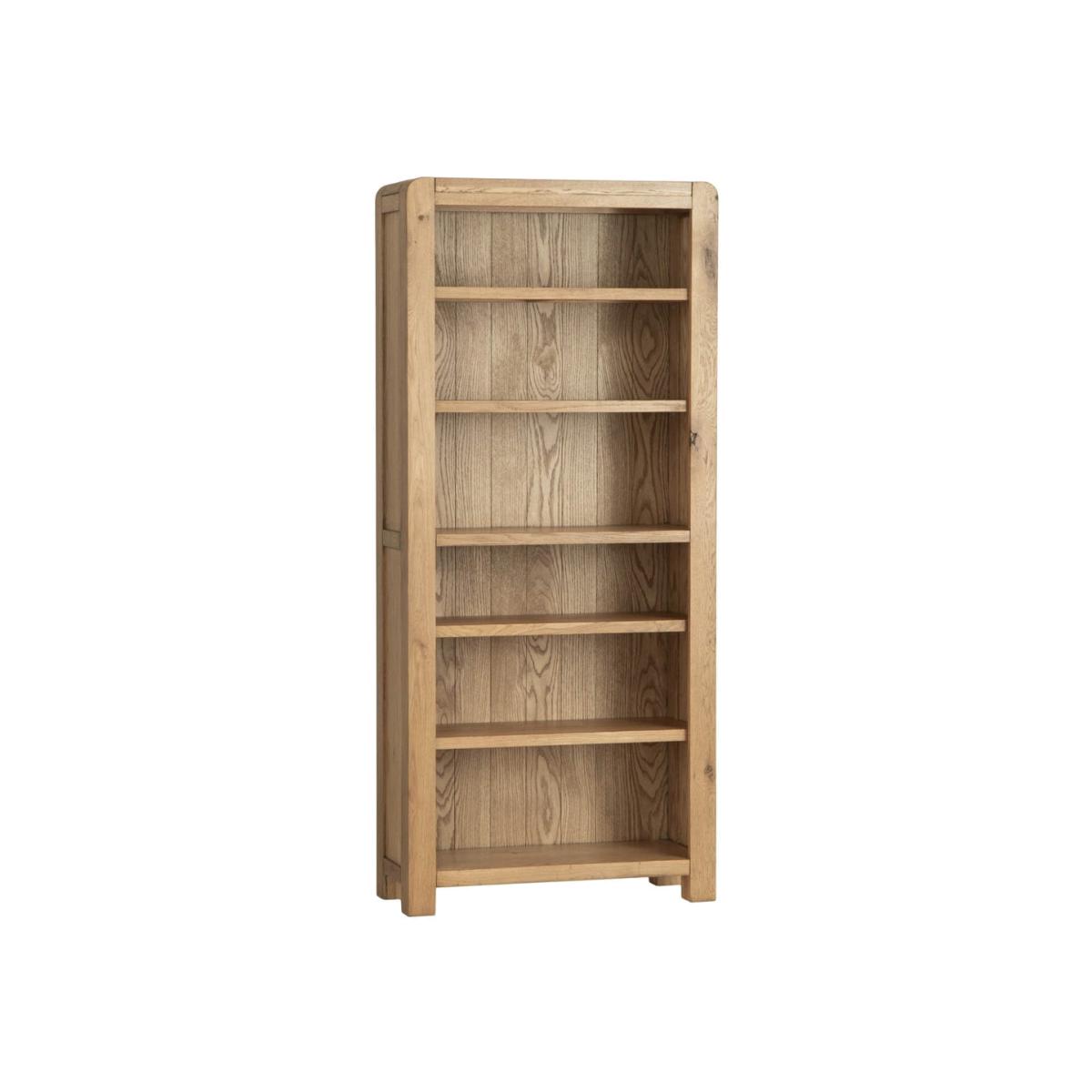 Display your favourite fiction and gain a stylish focal point in any space with this Oslo chunky oak large wide bookcase. Our golden oak sits elegantly against both light and dark backdrops, and the stocky frame and exaggerated grain lend a rustic feel to your living room or bedroom. This tall, slender unit contains six shelves of varying heights, so you can use it to display large ornaments, vases and framed photos as well as your books. The best part? It needs no assembly, so all you need to do is decide how to style it.