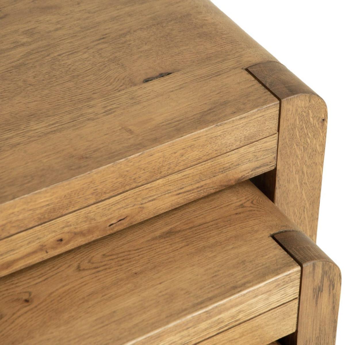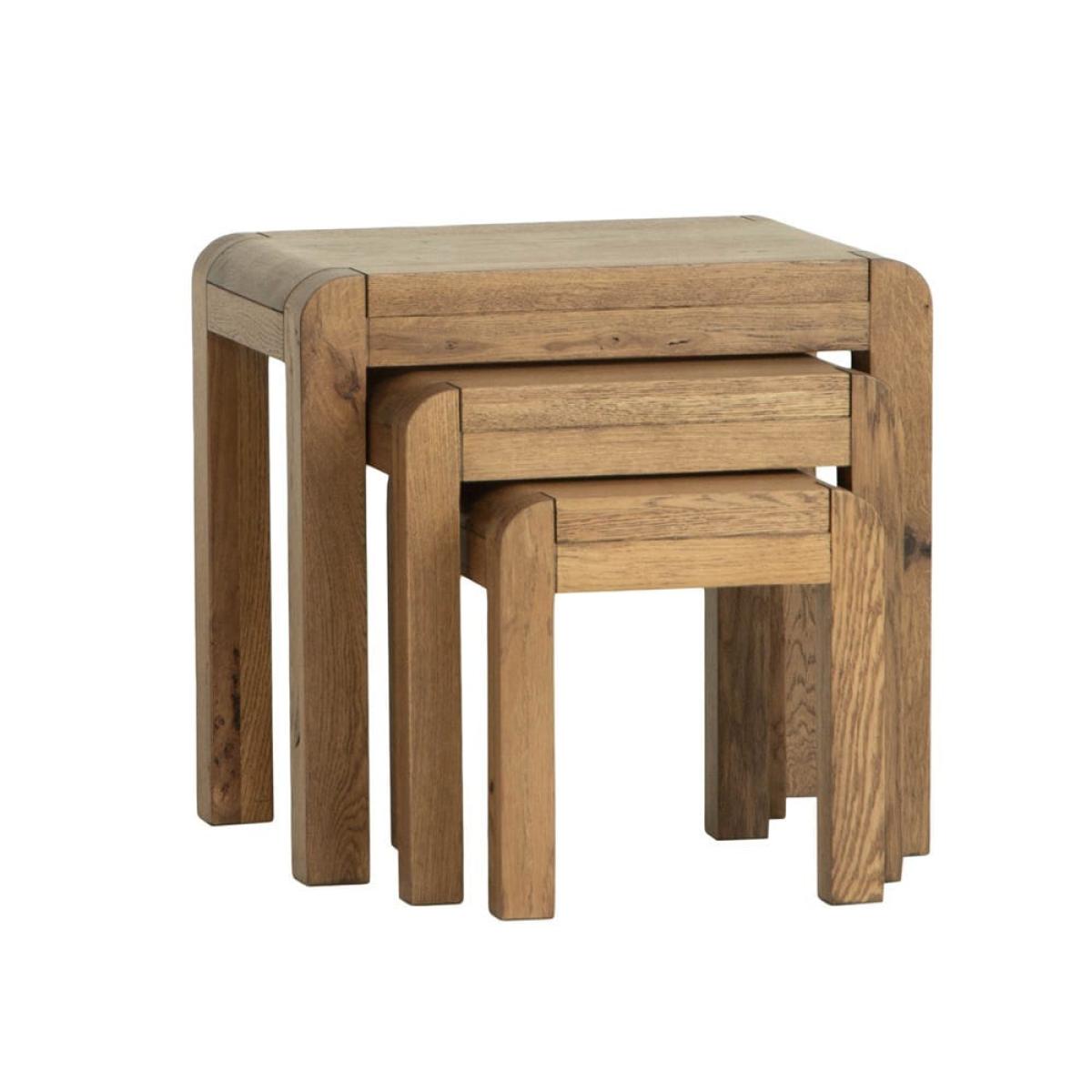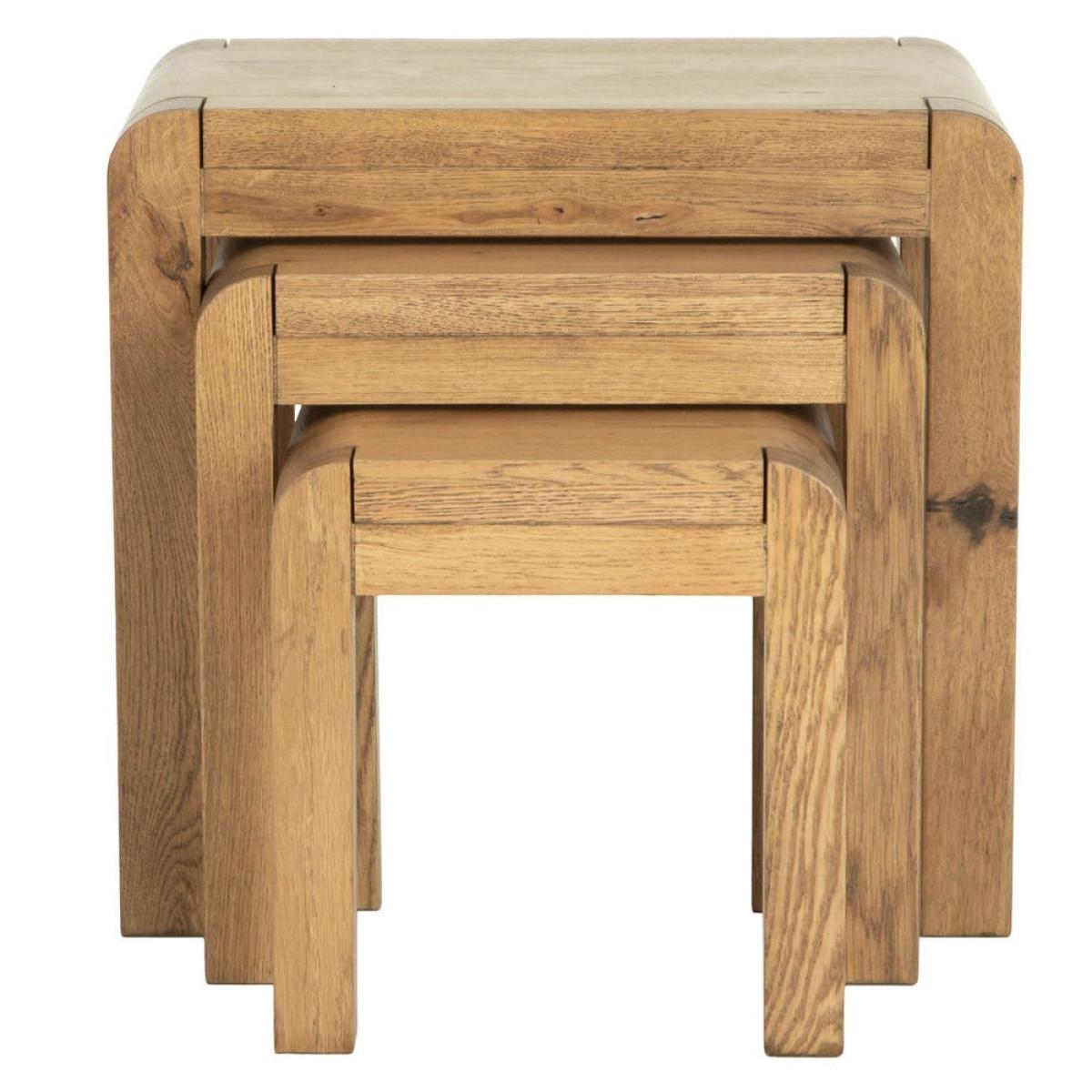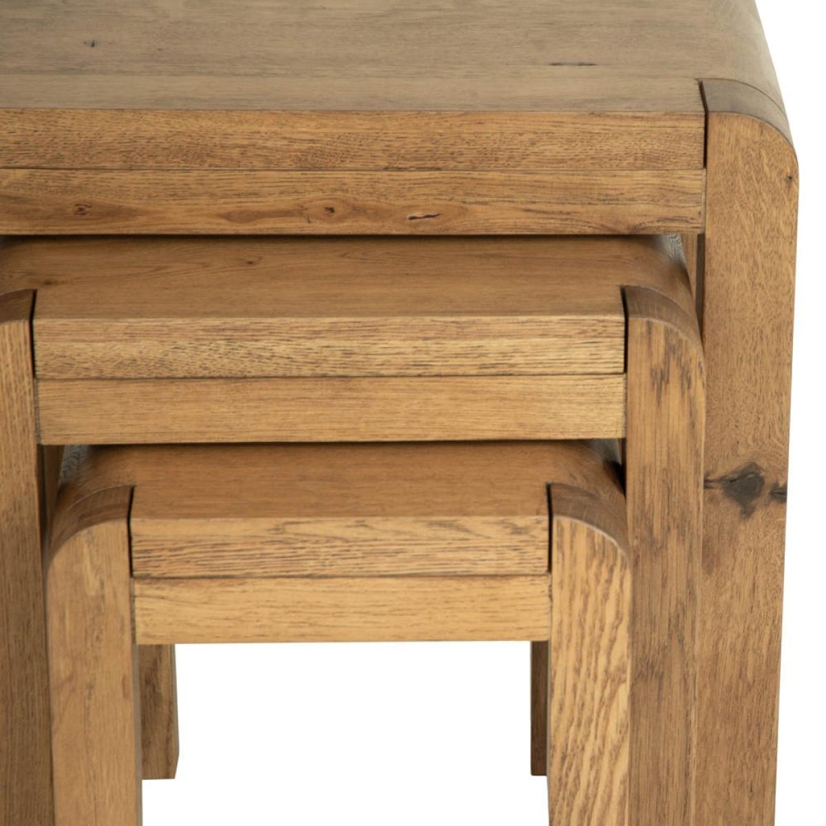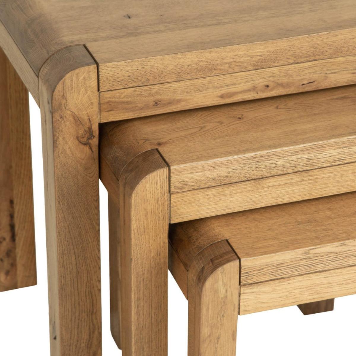 This Oslo chunky oak nest of tables shows off our gorgeous oak in triplicate. Pull out the smaller pair and use all three separately for drinks and snacks when friends pop round. You can slot them back together when you need some space back. Alternatively, maximise their impact by using them separately anywhere in your home to display your favourite photos or ornaments. This delightful trio features the Oslo collection’s distinctive rounded corners and exaggerated grain, which shows off the flaws and knots in the wood. The golden hue and square legs conjure up cosy log cabins to inspire your own nesting instincts.