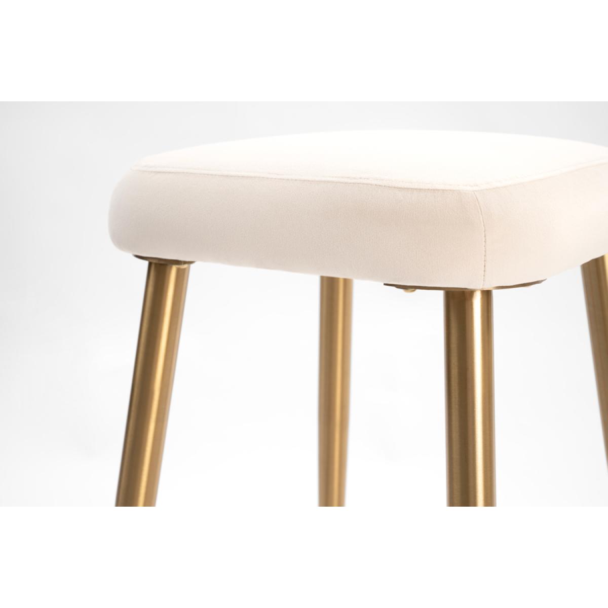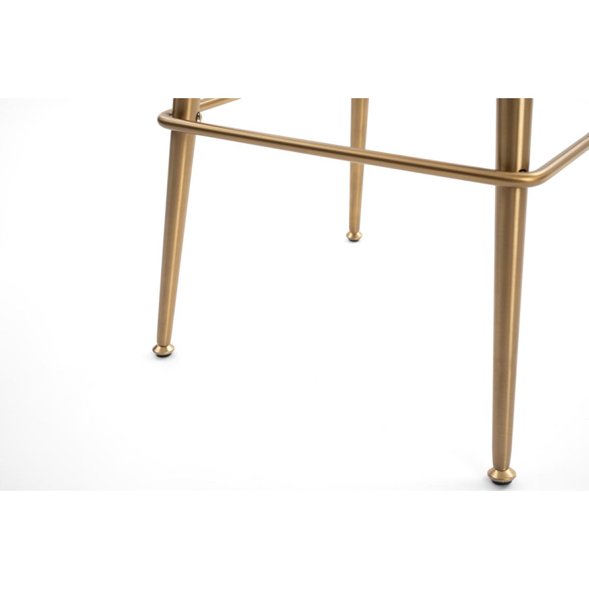 A timeless chic counter stool inspired by stylish mid-century designs. Ideal in height for use at standard breakfast bars. Comfortable deep-padded seat with velvet upholstery fabric. Brushed stainless steel base with brass finish. Adjustable glide feet. Simple assembly required approximately 10 minutes.