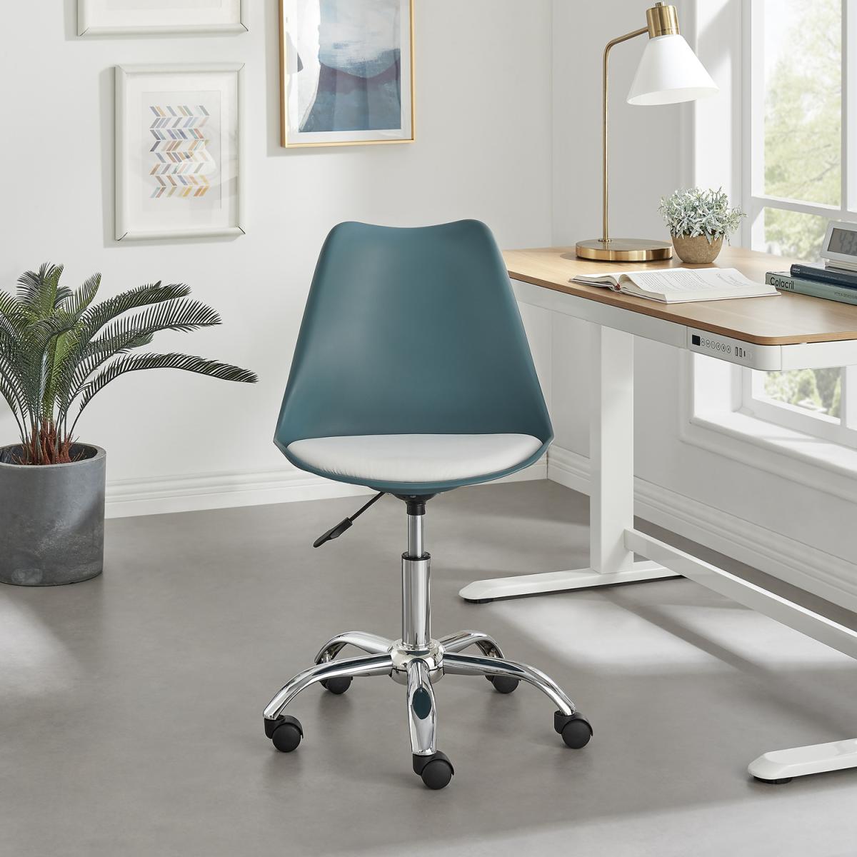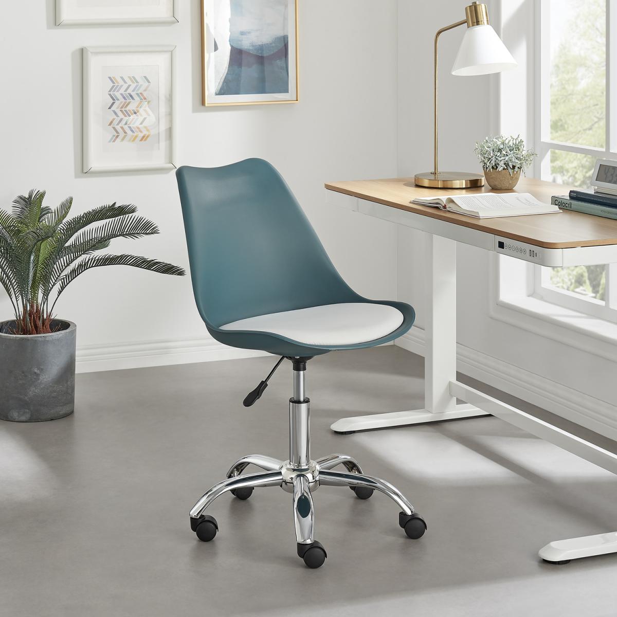 Our Oslo office chairs are all about that stripped-back chic Scandi vibe. The simple chrome adjustable riser and wheels look great when paired with the various colours and faux leather seat. The seat pad contrasts beautifully with each chair base colour option and will add a bold modern minimalist touch to your home office or gaming area. These chairs are the perfect combination of comfort and original style, suiting any contemporary home style. The ergonomically curved chair back perfectly adapts to the shape of your body providing brilliant comfort. The chrome metal riser and wheel legs not only add to the aesthetic but provide stability for use in a variety of environments. Height adjustable to make it the perfect fit for you. Complete your set up with our other home office furniture. Available in a range of colours so check out the full Oslo range today!