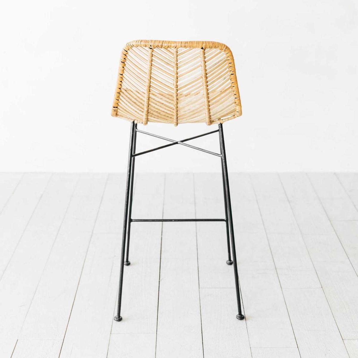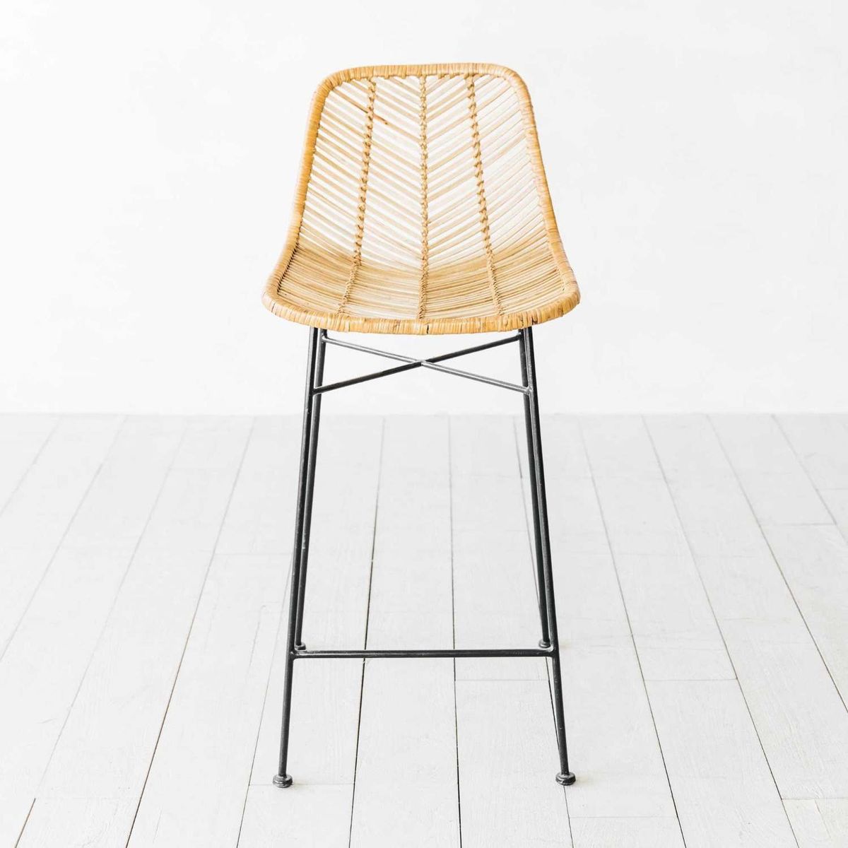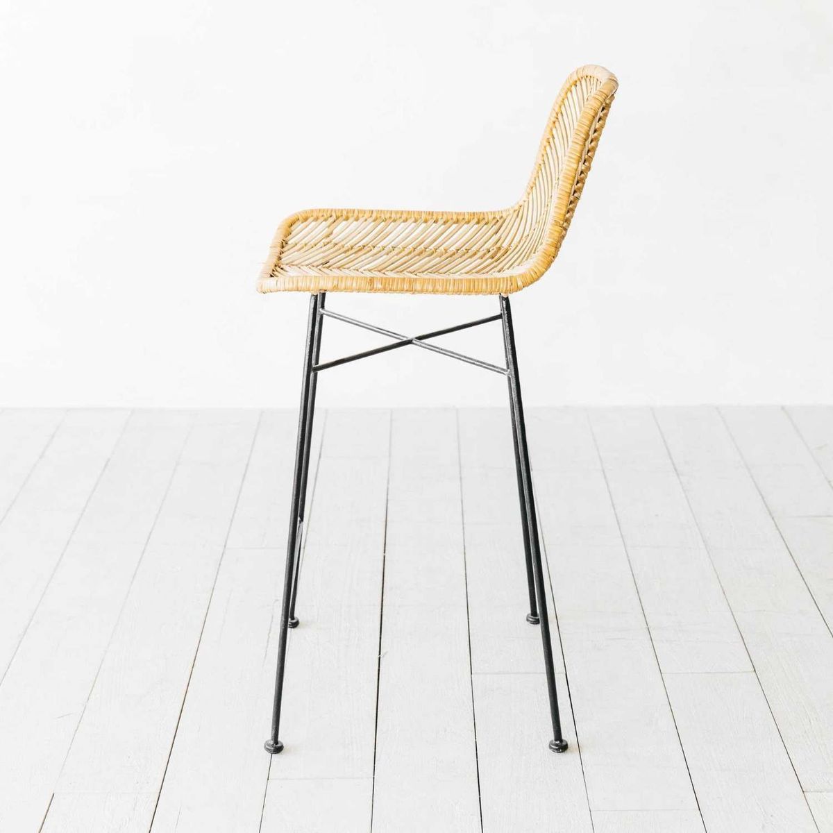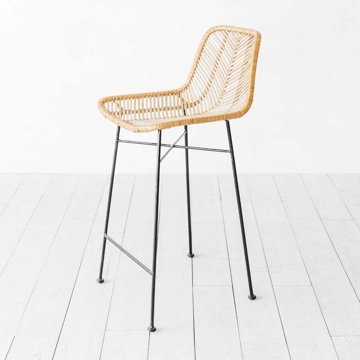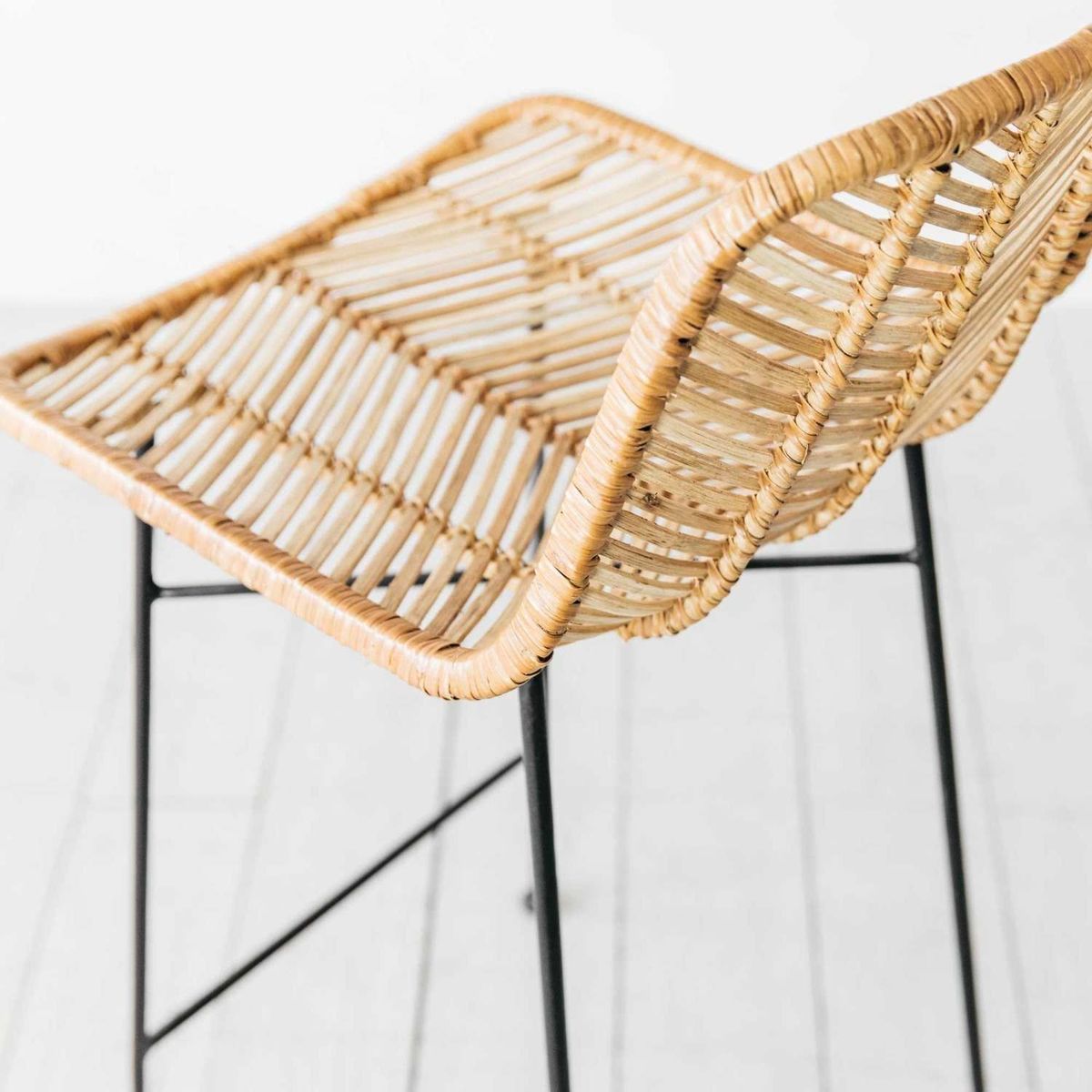 Crafted in natural woven rattan, this bar stool echoes both Scandi and bohemian elements. In a style which epitomises both comfort and design, this stool boasts a rustic finish, woven tie details, supportive black metal legs and a high back. H97 x W43 x D50cm. Seat height: 70cm. Made of rattan and wrought iron. Recommended indoor use only.