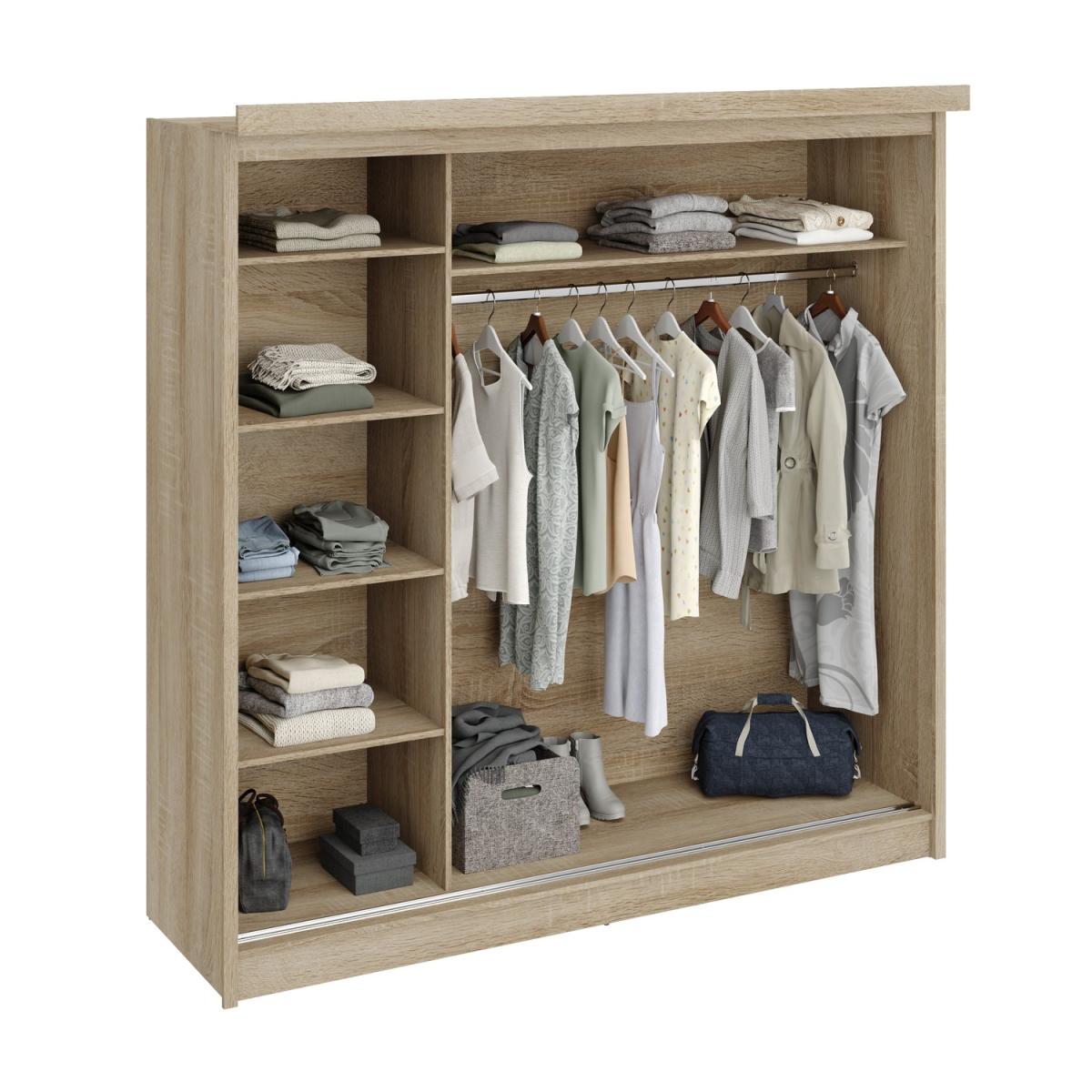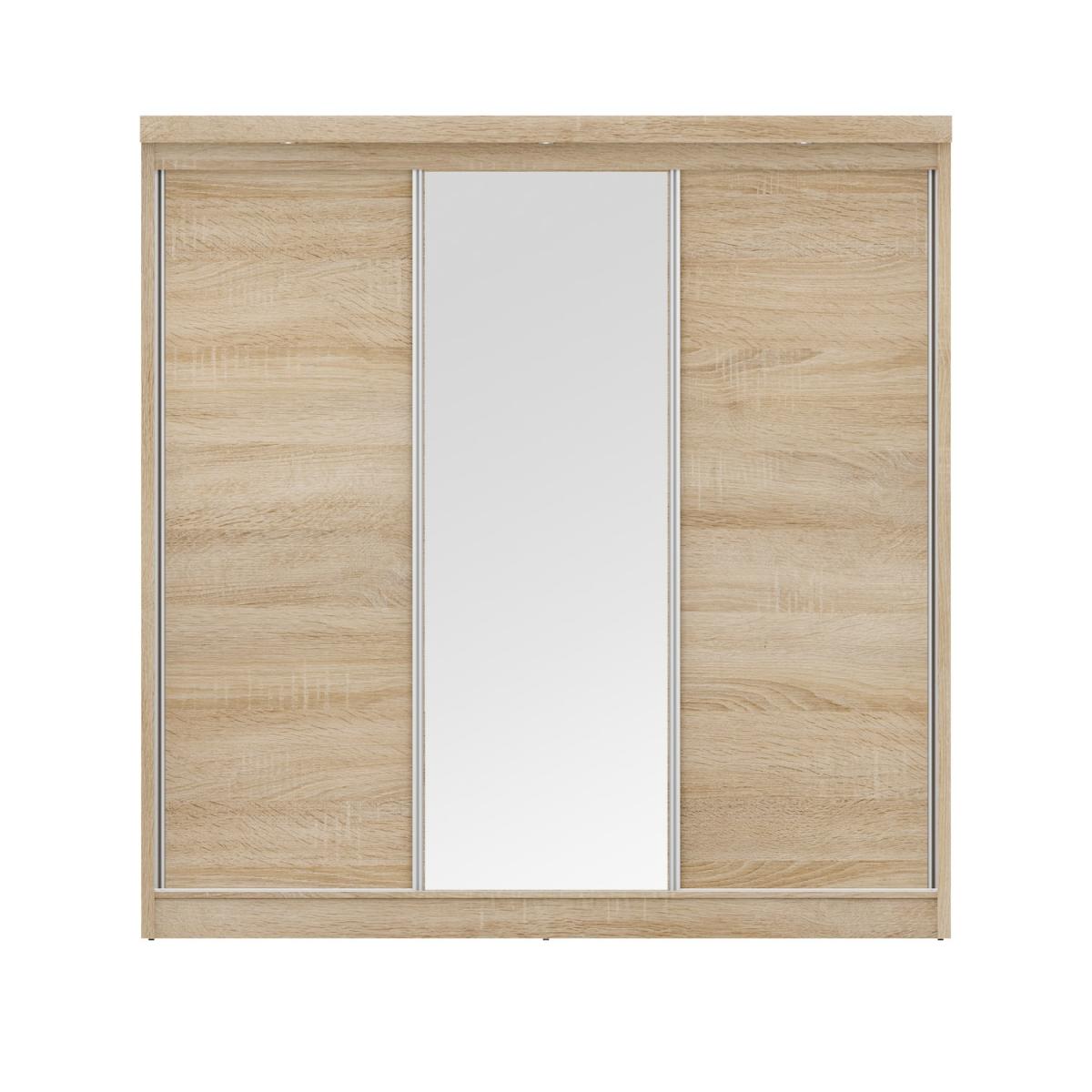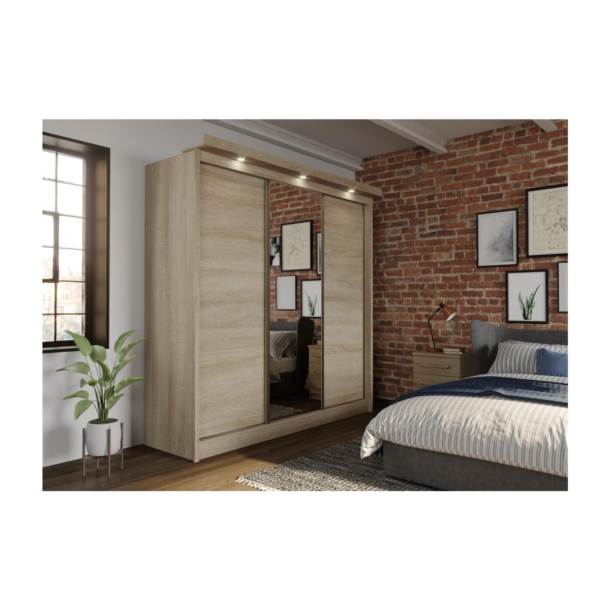 Dimensions H212cm x W210cm x D64cm. The Oslo Sliding Wardrobe brings a touch of glamour to your home with the integrated LED downlights. The Oslo Oak Slider offer a huge amount of storage behind its 3 large sliding doors. The Centre mirrored door further improves the function of this wardrobe. The curved top plinth houses 3 LED down lighters. Inside there are hanging rails and a hat shelf. Both the rail and hat shelf are adjustable to suit your needs. The doors are easy glide and are built on a German engineered track system. Features. Contemporary design Space saving sliding doors2 oak sliding doors and 1 mirrored door. Curved top plinth houses 3 LED down lighters5 Shelves2 Internal hanging rails. Strong wood combination construction Durable metal fixtures. Assembly required..