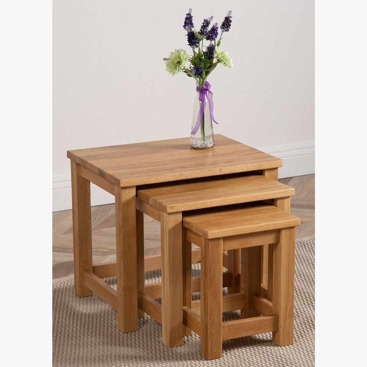 pWith its clean straight lines and square set legs, the Oslo oak nest of tables will happily make a statement in any living room. The space saving, uncluttered design is very much in keeping with the look of today but will work in perfect harmony with both modern and traditional interiors.pp Perfectly proportioned, measuring 58.5 x 46 cm, the Oslo oak nest of tables, offers sophisticated style, versatility and practicality in one compact solution. The Oslos solid oak construction offers minimal risk which makes this nest of tables a safe investment for your familys living room.pp. Handcrafted from 100 solid oak wood and built to last, using time honoured woodworking techniques, no veneer, chipboard or MDF is used anywhere in the construction of these tables. Each piece of wood goes through a process of seasoning and kiln drying until its ready to be crafted.pp. All our living room tables come with a 12 month manufacturers warranty and no quibble 30 day money back guarantee, so you can buy with confidence.p