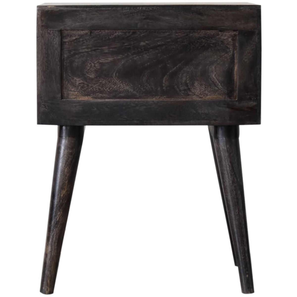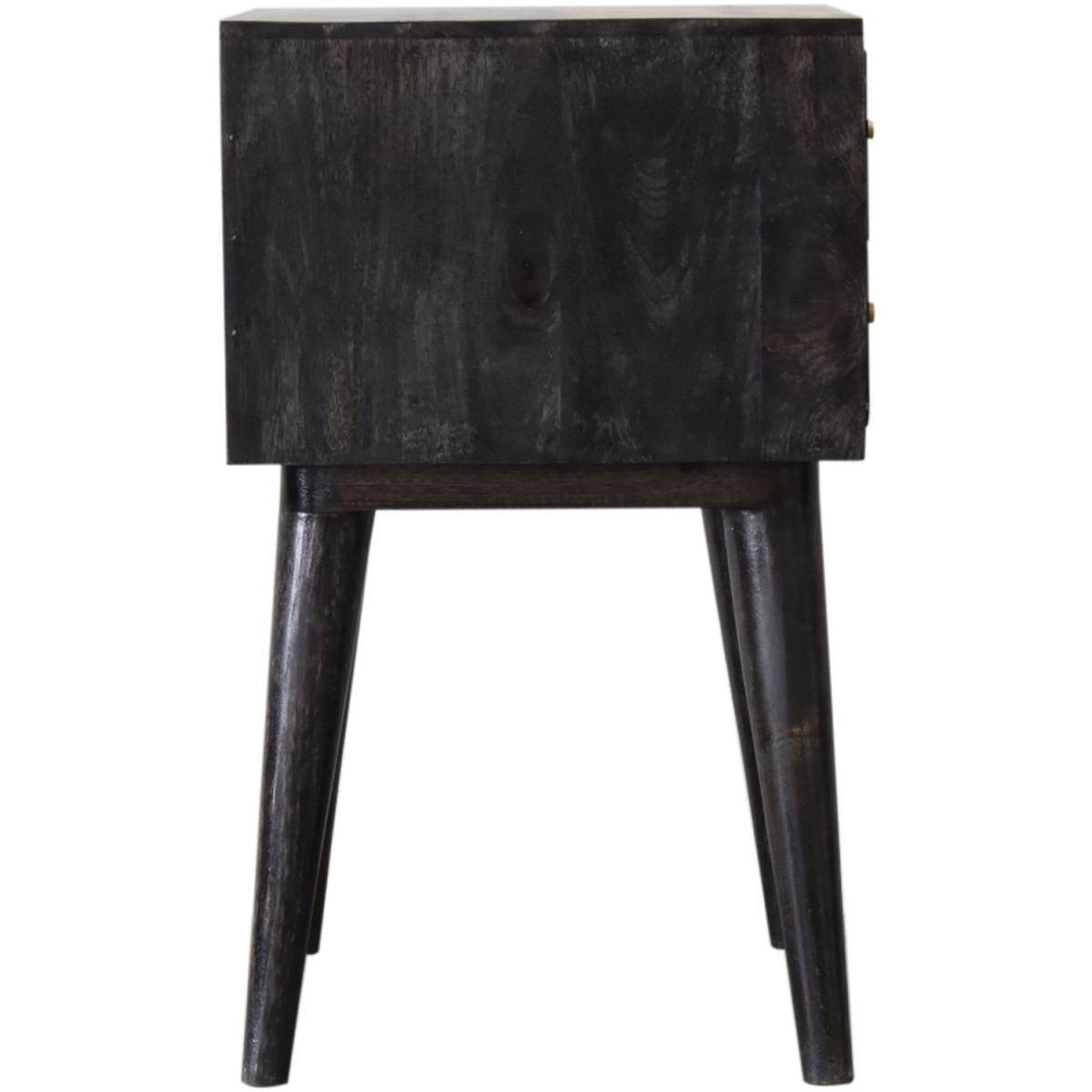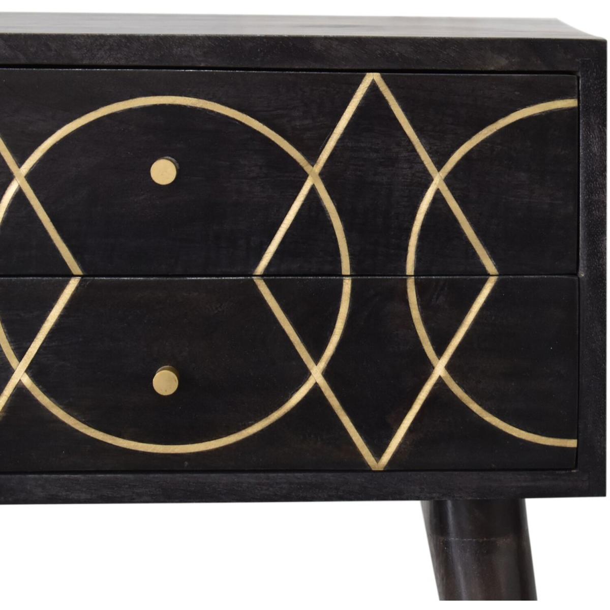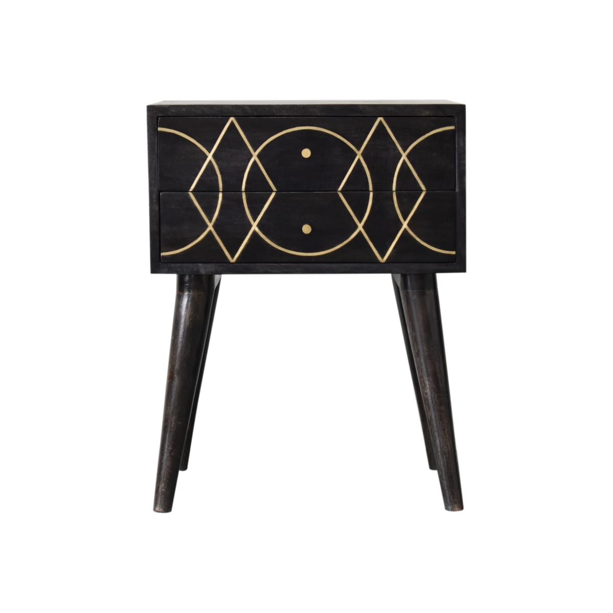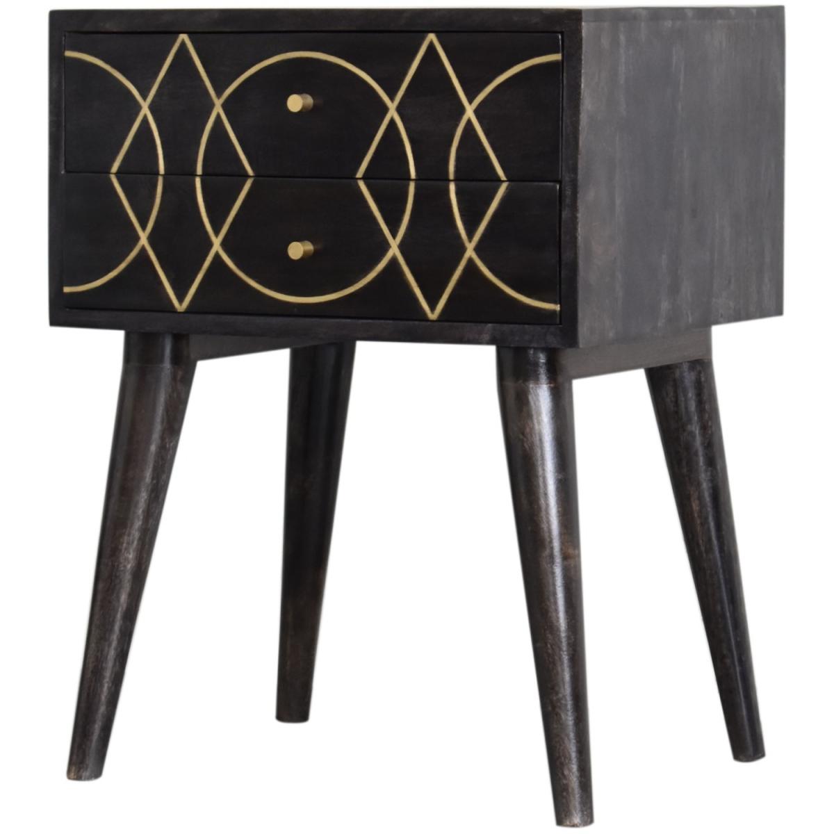 Wake up to a pleasant view every day by adding the Oslo bedside table to your bedroom. It comes complete with two drawers, decorated with a brass inlay pattern, that offer handy storage for your essentials. The bedside is constructed from 100% solid mango wood in an ash black finish and topped with a clear lacquer for maximum protection and durability of the product.