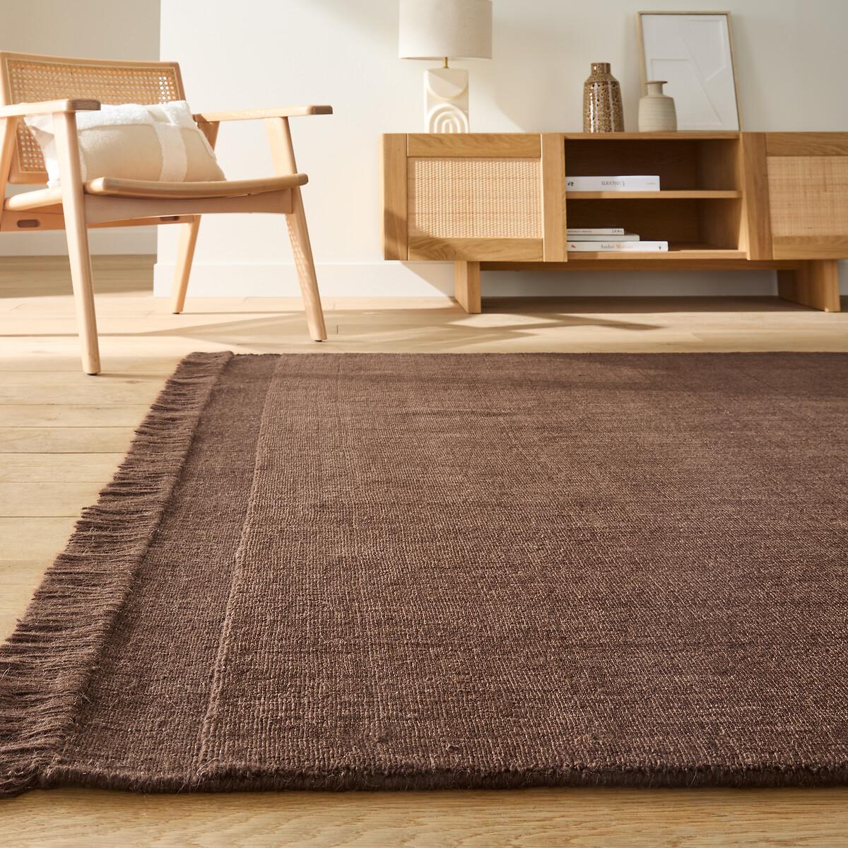 Sober, timeless design. The Osni rug's simplicity makes it suitable for any living space. Bordered on both sides by a side band and hand-woven fringes, created from wool and cotton for comfort and softness. Product Details • 80% wool, 20% cotton • 2600g/m2 • Thickness: 1.5cm/0.5" • Fringed edging • Weaving type: Handmade • Underfloor heating compatible: No • Interior Use: Yes • For outdoor use: No • Artisanal craftsmanship. Quality Info • Wool is a warm and comfortable fibre. A wool rug is also an excellent thermal and sound insulator. • Hand-braided, each piece is unique and may have small irregularities which make it authentic.. Colours and dimensions may vary slightly. Care advice • Once unrolled, you must wait a few days for the carpet to return to its initial shape.. • To keep the edges flat, roll your mat in the opposite direction. Leave it like this for an hour then put it back flat and place a heavy object on it for 2 days. • New, the carpet may give off an odour which dissipates over time. Remember to regularly ventilate your room to reduce it. • To preserve its appearance, rotate your rug regularly in one direction or the other to minimise localised wear in the same places (due to successive passages), and loss of colour due to regular light. Care Advice • Some materials are very fibrous (like wool) and you can actually observe pilling in the first weeks of use. : this is normal because the carpet "bursts" by rejecting its excess fibres. Remove lint as much as possible by hand and do not use the vacuum cleaner in brushing mode as this will pull the fibres and tear them out.. The pilling will improve over time. • For maintenance, we advise you to vacuum it very little the first month and then to vacuum it without rubbing too much always without using the brush. • Compatible with robot vacuum cleaners: No • Remove stains immediately with a clean, damp cloth. • Dry clean recommended. Dimensions • Width 120 x Length 170cm • Width 160 x Length 230cm • Width 200 x Length 290cm • OEKO-TEX® Standard 100. Standard 100 certification by OEKO-TEX® tests textile products for harmful substances via an independent, international label.