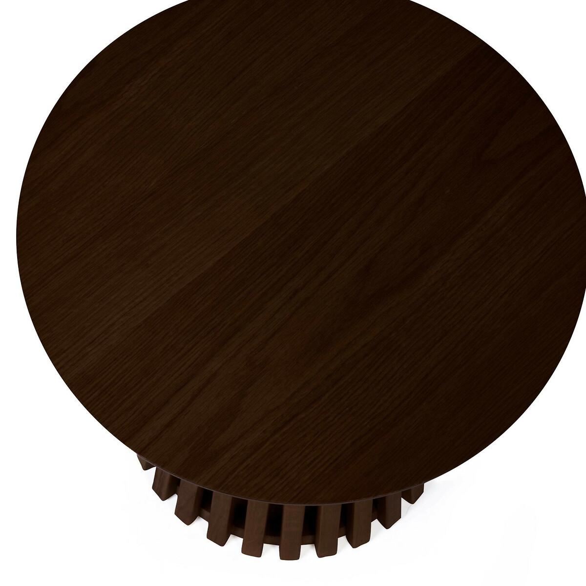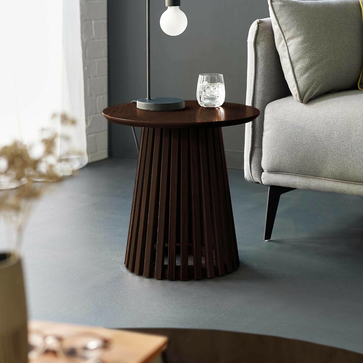 Dark, sleek, and full of character. This round slatted lamp table is finished in deep oak for a rich, moody look that instantly elevates your space. The smooth top is the perfect spot for a lamp, plant or evening read, while the cylindrical slatted base adds sculptural detail and texture. Compact but striking, it’s a versatile piece that makes just as much of a statement beside the sofa as it does at the bedside. Product Details• Slatted pedestal base• Round shape• Delivered fully assembled• 12 month manufacturers warranty• Care Advice:Wipe clean with a soft cloth. Product Composition - 99% Wood, 1% Metal. Product Dimensions - 45 cm x 45 cm x 45 cm , Weight - 6.6 KGPackage Dimensions - 51 cm x 51 cm x 51 cm, Weight 8.7 KGThis product will be dispatched by one of our trusted suppliers. You’ll be contacted by their selected courier about your delivery. Please note: this product cannot be delivered to all Offshore Islands, Northern Ireland or Republic of Ireland.