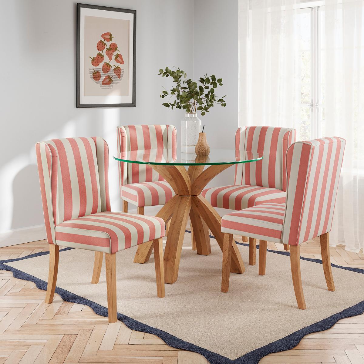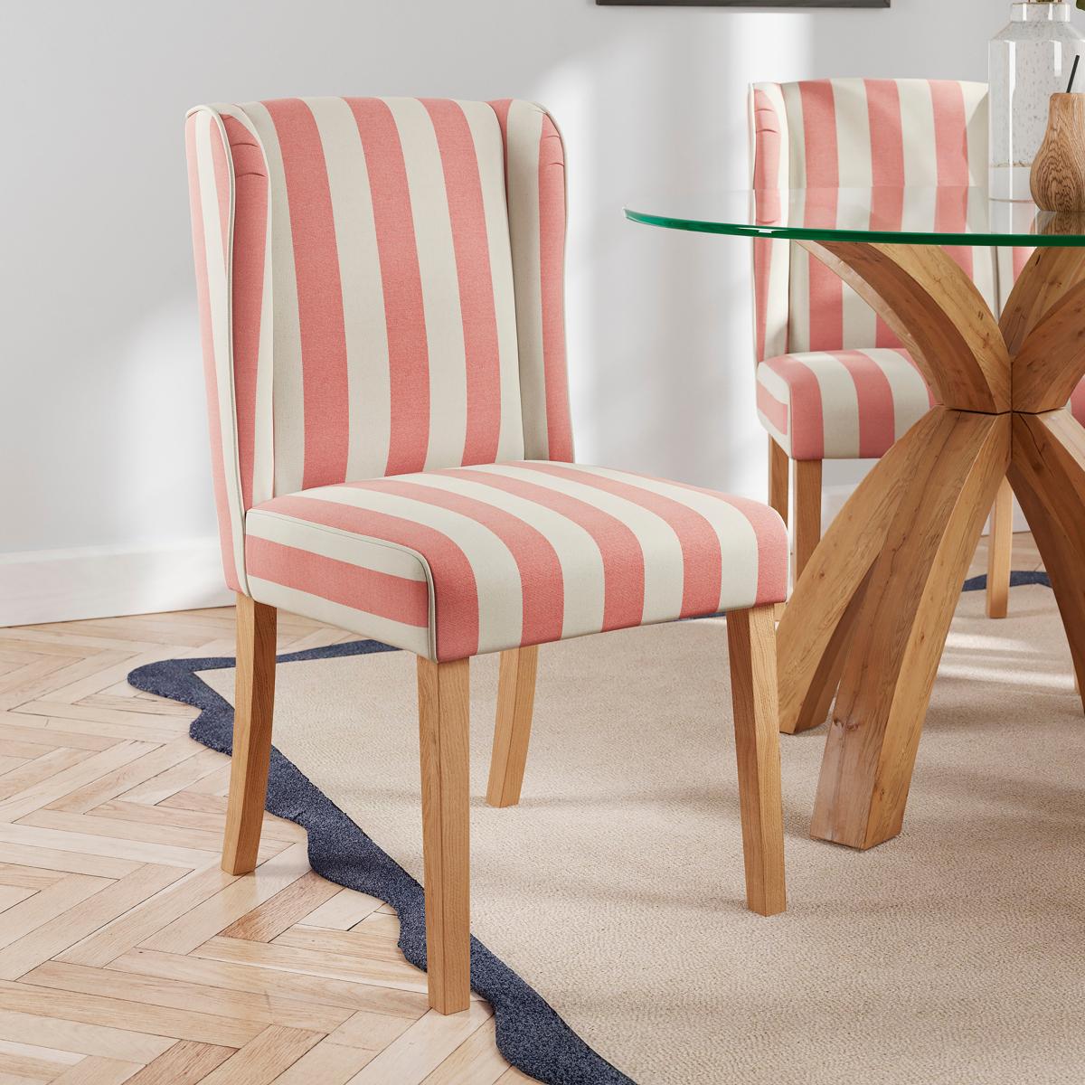I love the Oswald dining chair for adding a touch of colour and pattern to a dining space. Its striped coral print works well in both contemporary and traditional interiors, especially when paired with neutral tones to let the fabric stand out. It’s versatile enough to sit comfortably in a seaside-inspired scheme or a playful, eclectic setting. For styling tips, try combining these chairs with a natural wood or glass dining table to emphasise their timeless charm, and consider adding cushions in coordinating shades for extra comfort. These chairs are a smart choice for bringing personality into your dining room without overwhelming the overall aesthetic.