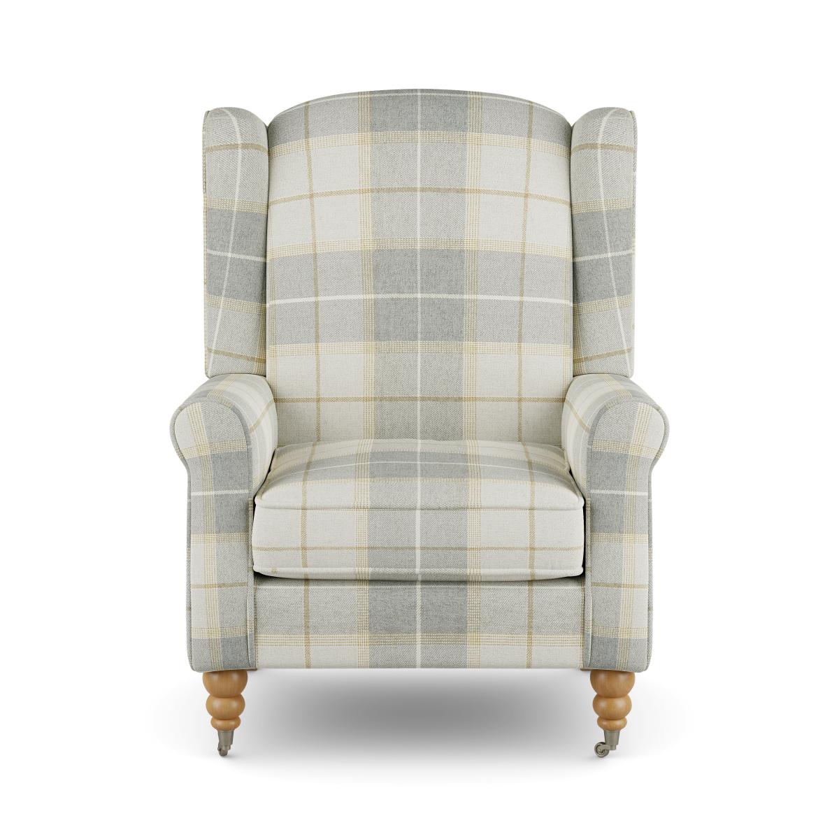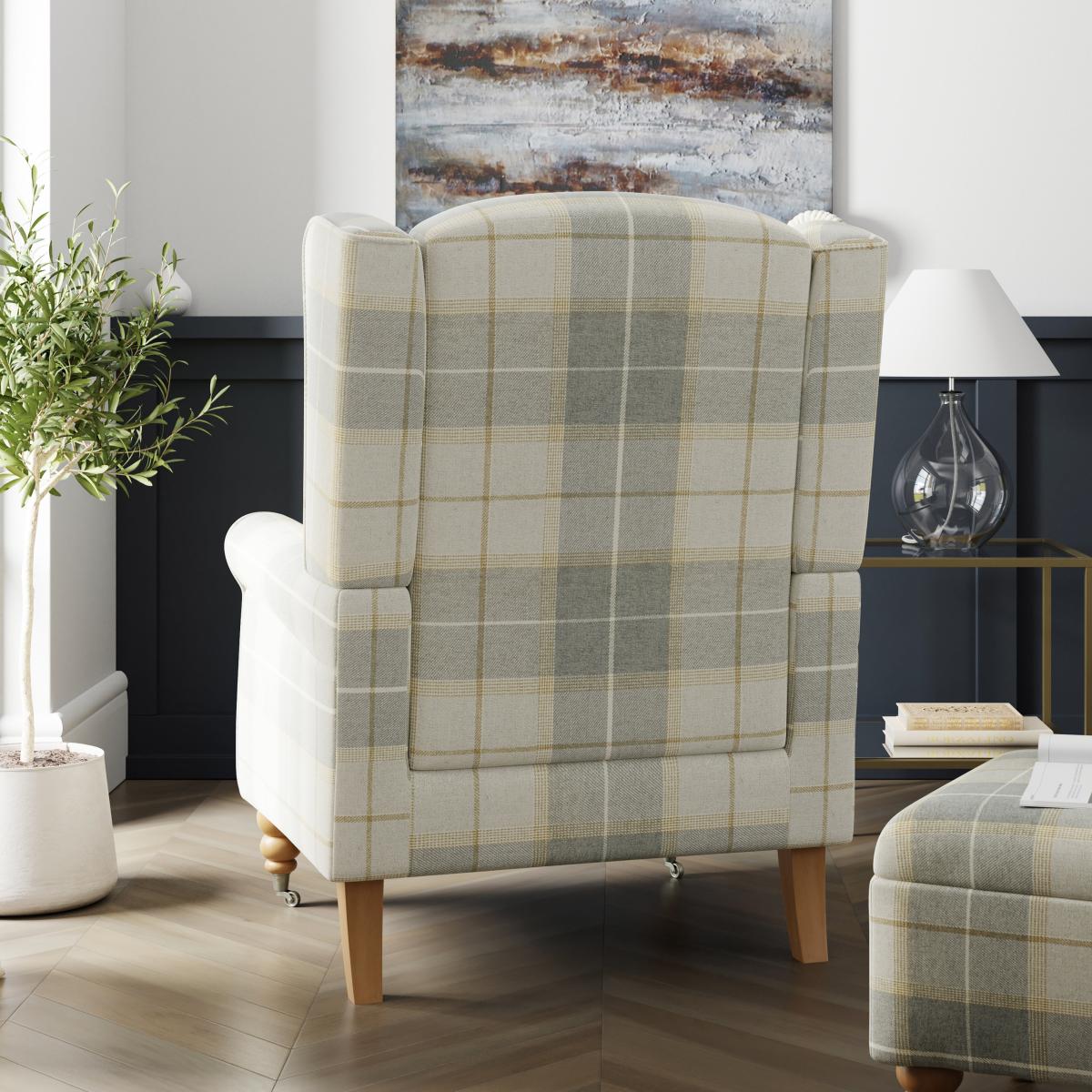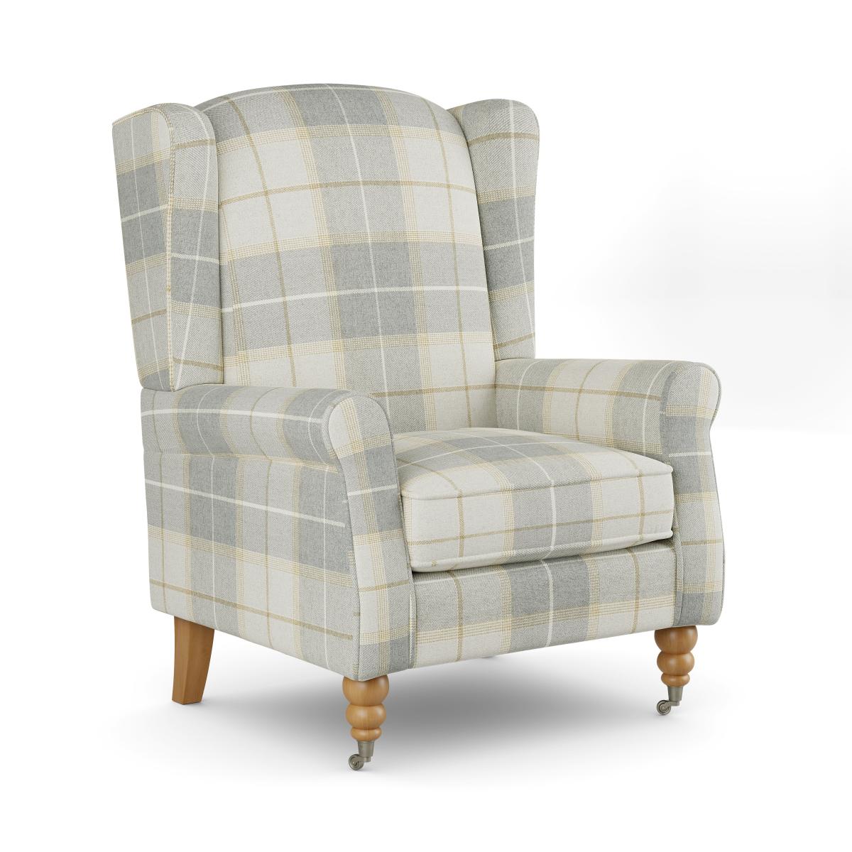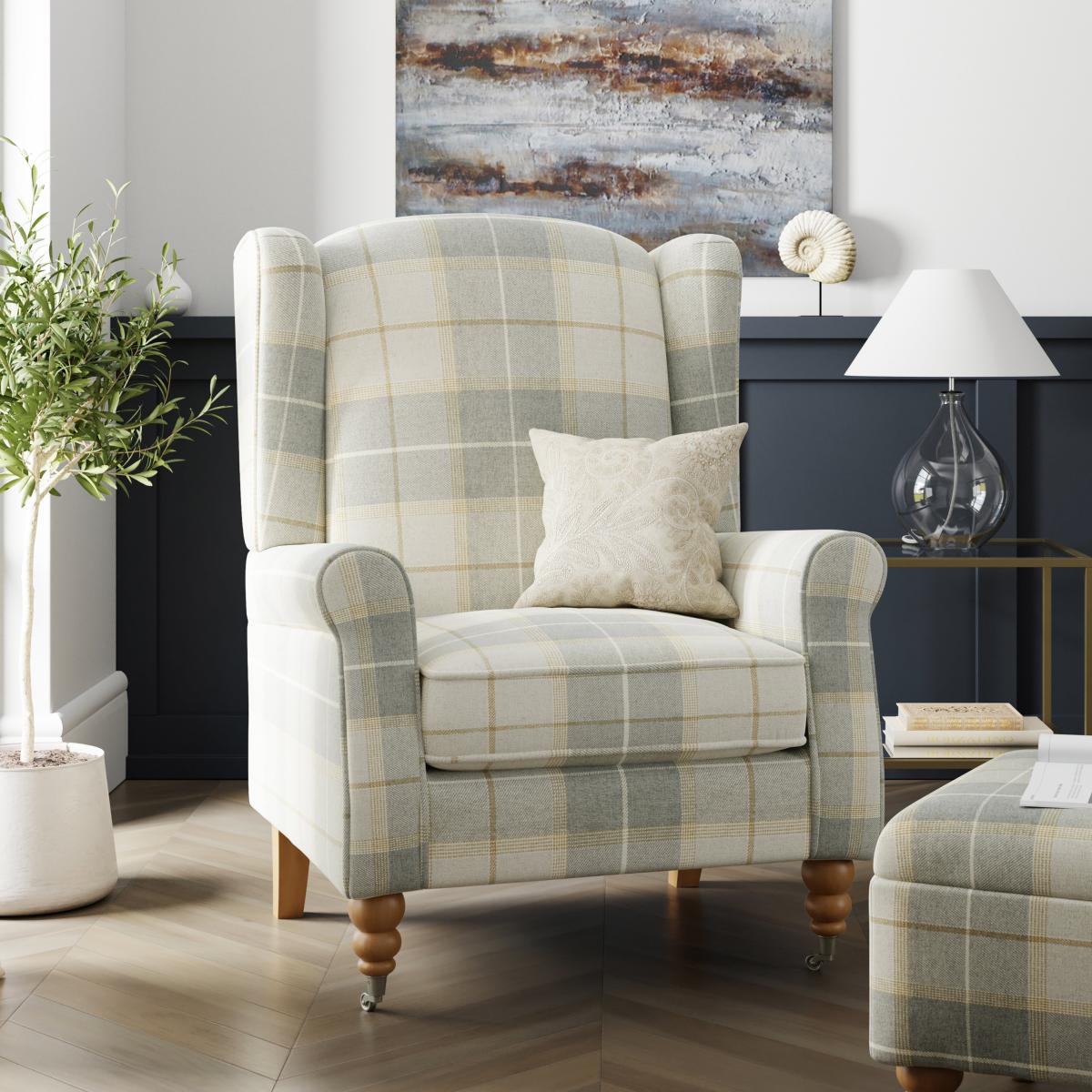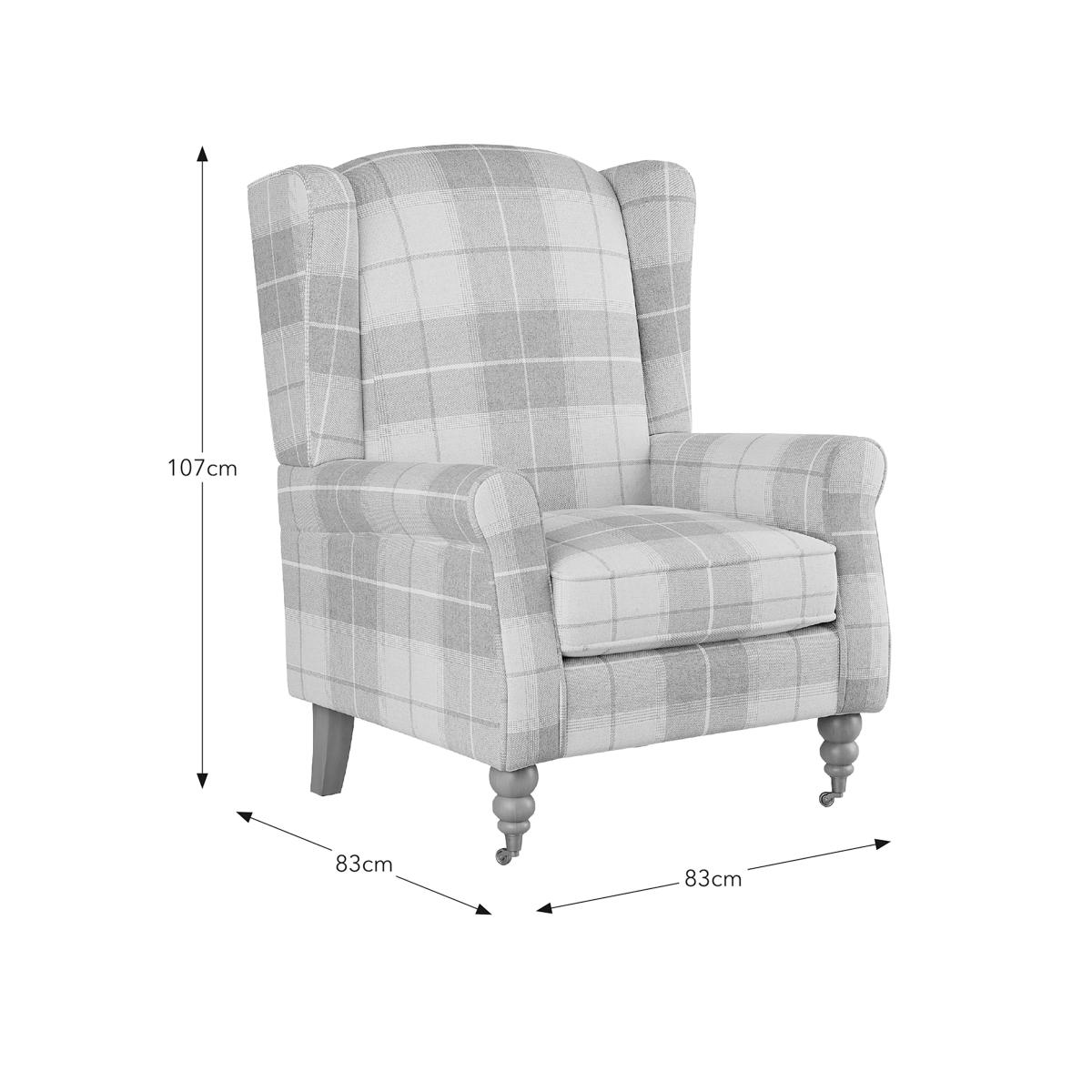Dunelm Exclusive - Designed and Developed by Dunelm Sit back and relax in the classically designed Oswald Grande armchair, crafted with foam and fibre filled cushions, pocket sprung seats and a high back for additional support. With its timeless wingback design, scrolled arms and oak finished wooden legs, this armchair would suit a range of rooms and styles. Complete with brass castors on the two front legs to allow for easy positioning, this generously proportioned armchair has been upholstered in a smooth, checked woven fabric with a stunning piped edged detailing. The Oswald armchair is also available in a range of different colours, fabrics and sizes. dunelm. com/search? f_attributes. product Descriptive Attributes. dunelm. com/infodocs/downloads/Furniture-Sizing-Guide. pdf) to check out our handy sizing guide to help you find out if you’ll be able to get your new furniture into your home.