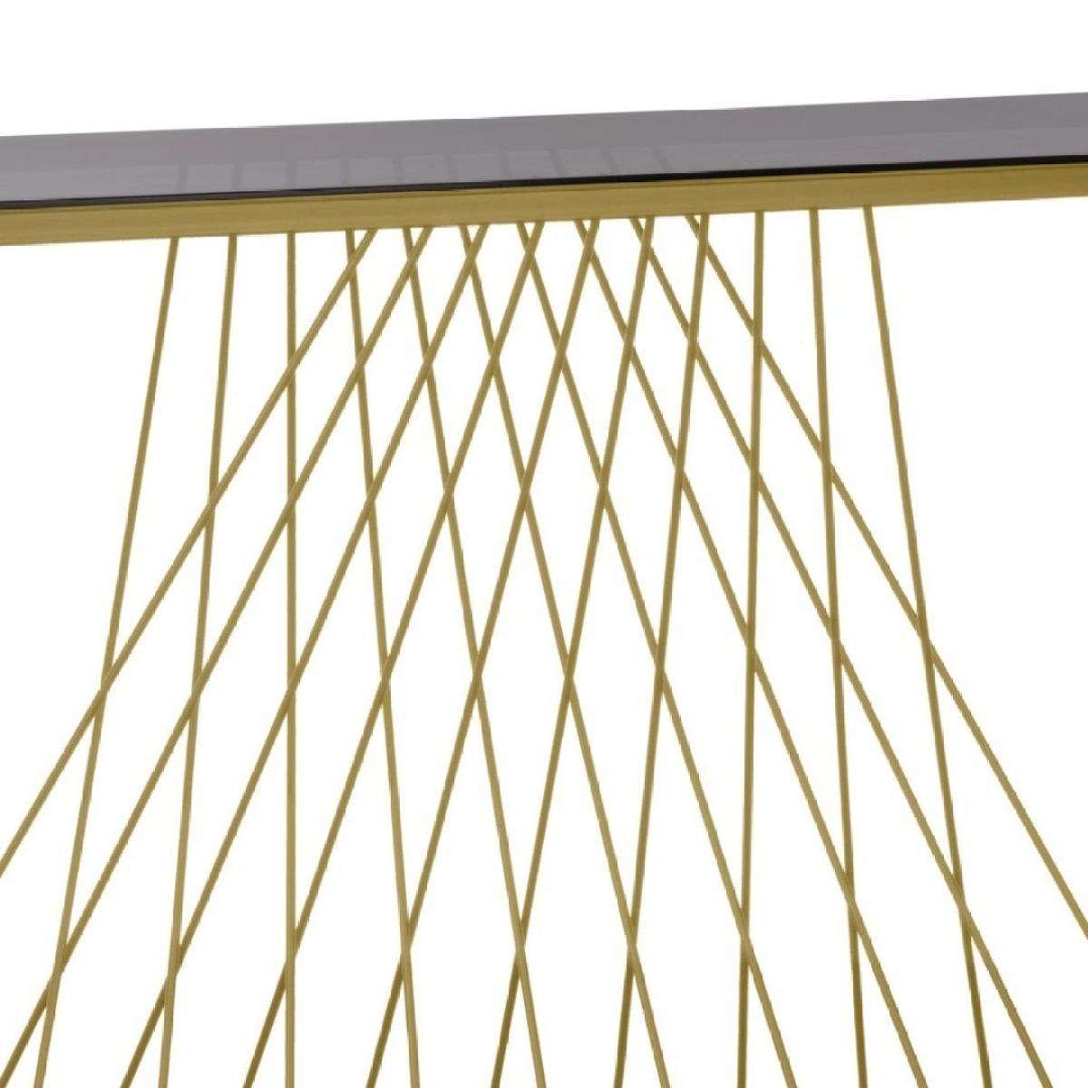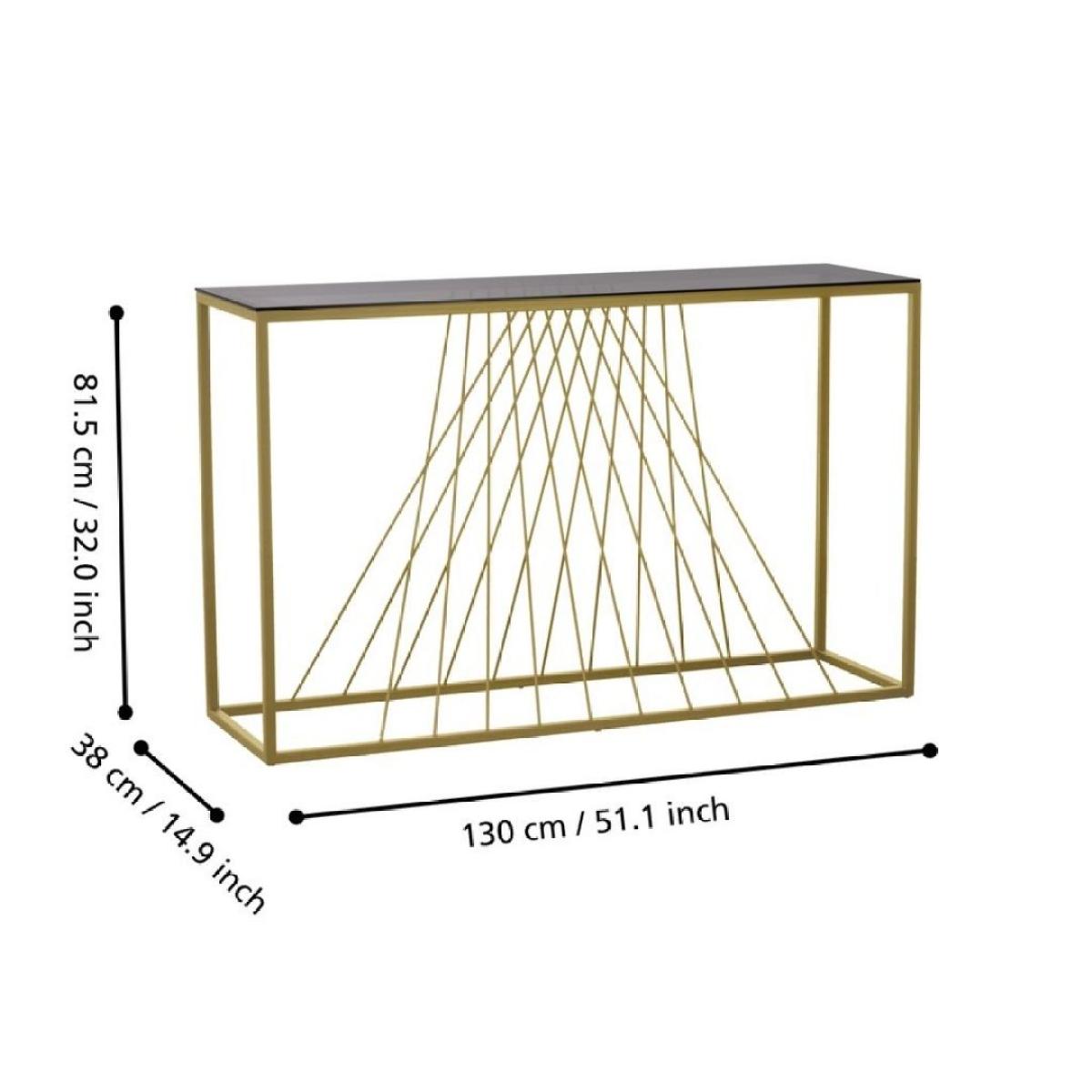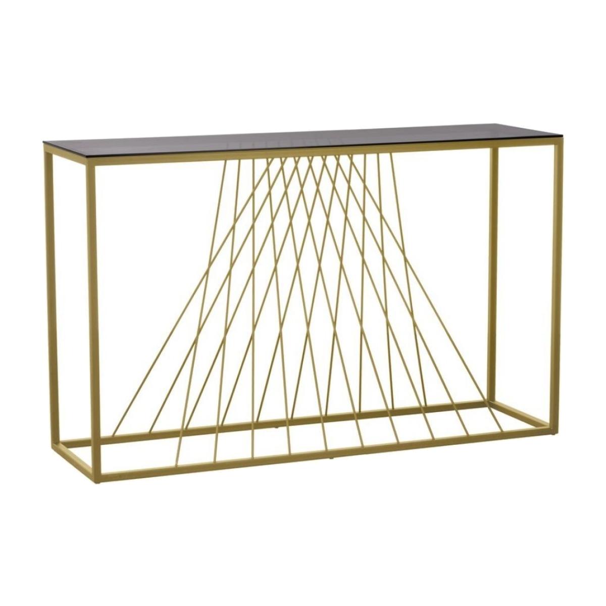 Otawara gold console table, made from metal and glass. The Otawara gold console table brings a modern elegance to any interior. Its slim rectangular frame is finished in a rich gold tone, with angled metal rods creating an eye-catching geometric pattern beneath the top. The sleek glass surface offers a perfect spot for displaying décor, making it a stylish addition to hallways, living rooms or entryways.