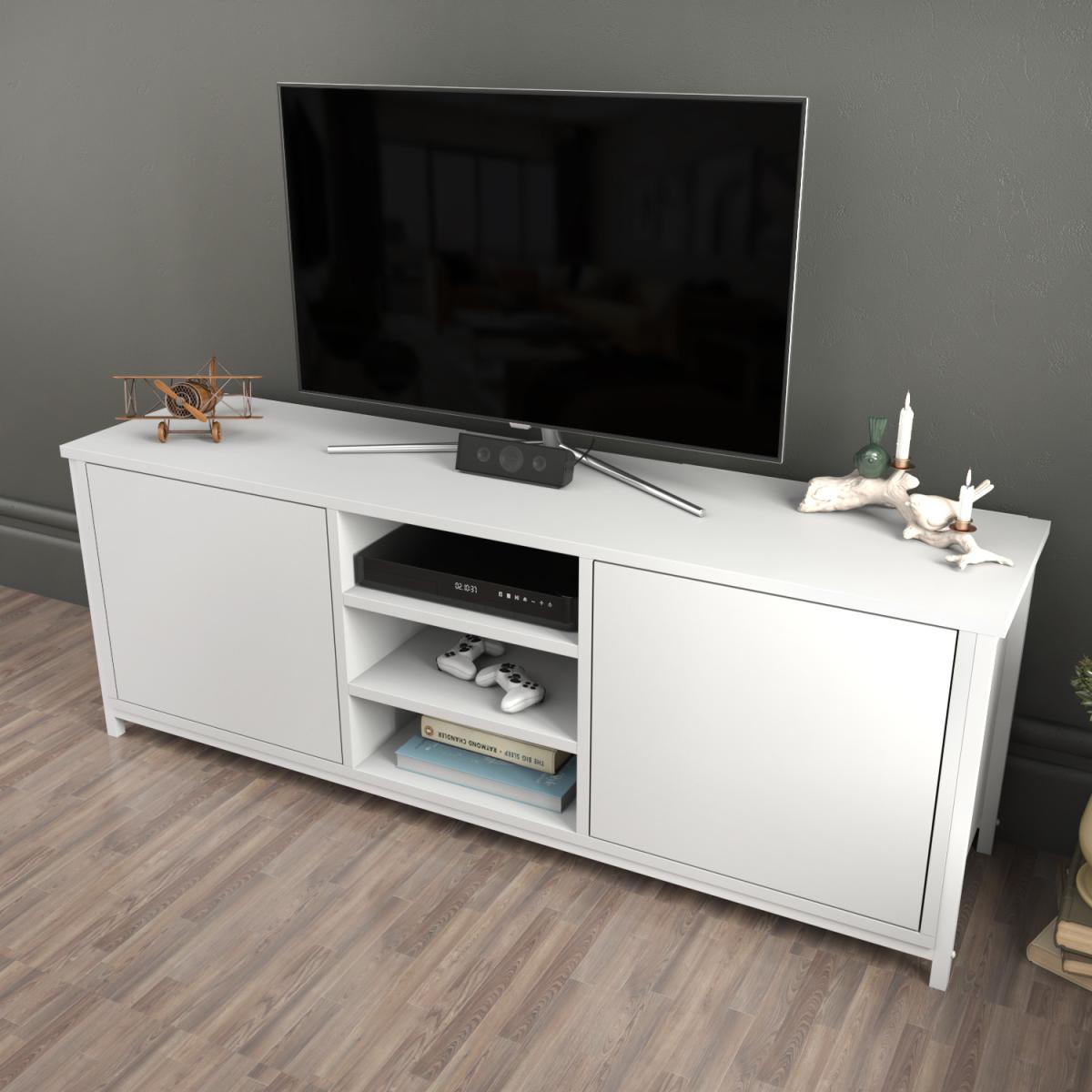 Otis 140 cm wide simple and minimalist media stand for TVs up to 63'' is defined by practical functionality and streamlined design. With three open shelves and two cabinets, this design offers huge storage space for your books, magazines, TV tuner, remote controller, or other media devices/collections. Top this design with a sleek flat-screen TV, then deck out vertical open shelves with your favorite books and DVDs, framed family photos, while using horizontal open shelves for your new video game console, tuner, and cable box. The cabinet is opened without a handle through a simple but innovative solution. The media stand is made of 18mm thick quality melamine coated particle board and banded with first-class PVC edge banding tape. The stand is also enhanced and strengthened with metal legs which makes it sturdy and durable. Metal legs are coated with scratch and impact-resistant industrial static paint. It is manufactured using eco-friendly and health-friendly TSE-certified materials. The product will be delivered to the customer in the original package as disassembled. It is designed to be assembled by the customer easily using simple household tools like a power drill or screwdriver. Assembly instruction and installation hardware are included in the package. For fast and error-free installation, product parts are numbered with stickers in accordance with the assembly guide.
