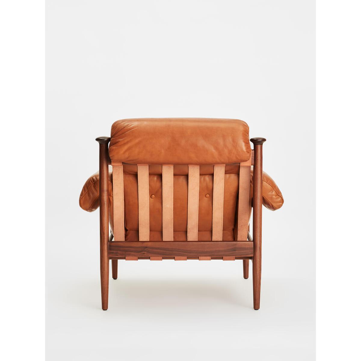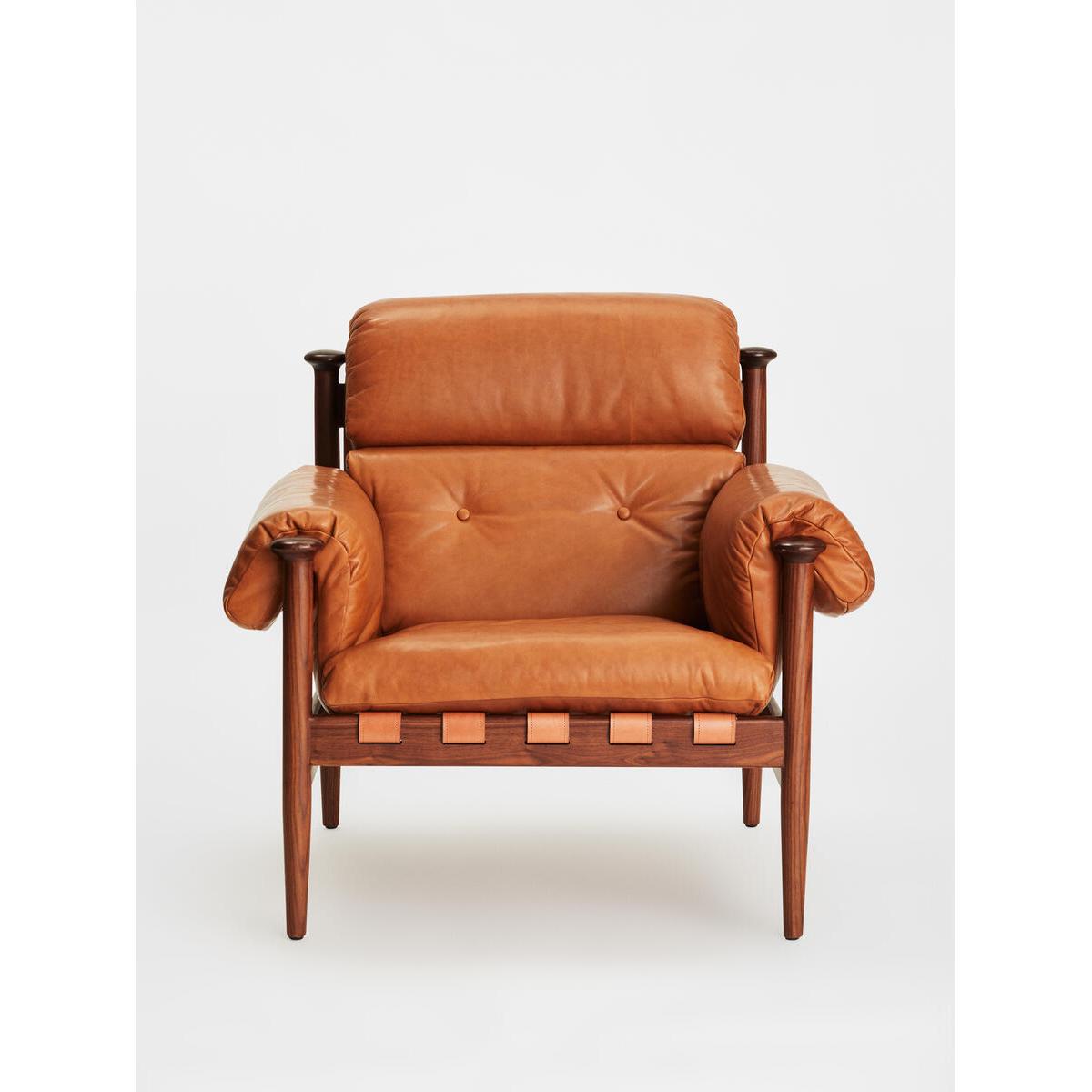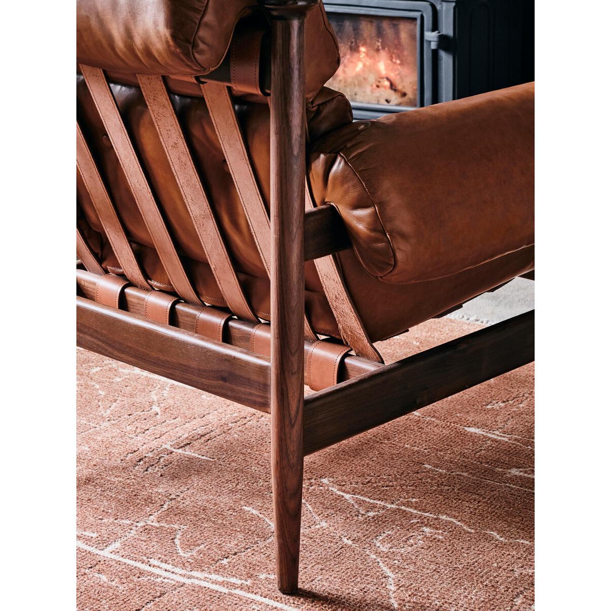 This retro-inspired chair is crafted from solid walnut withthick-cut leather support straps for a unique design touch. Upholstered in chestnut leather, the chair is complete with classicbuttoned detail and shaped arms, which curve around the walnutframe. Use it to break up an open-plan space and reference theseating styles seen throughout Soho House Rome. Chestnut leather chair. Solid walnut frame. Thick-cut support straps. Pulled buttoned detailing. Shaped arms. Inspired by Soho House Rome.