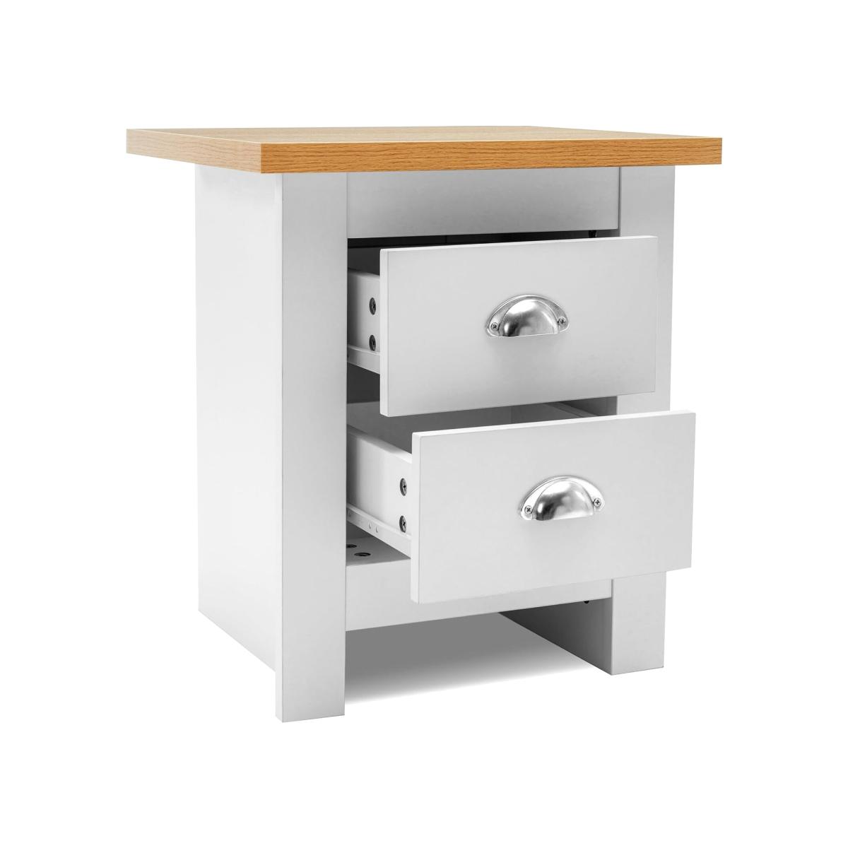 Enhance your bedroom with this elegant two-drawer bedside table. It features a timeless two-tone design combining a natural wooden top with a crisp white base for a stylish and versatile look. The two spacious drawers offer smooth gliding storage for all your bedside essentials, while the brushed metal cup handles add a refined touch. Compact yet practical, this nightstand is perfect for small spaces, providing ample storage without overwhelming your room. It is a functional and sophisticated addition to any bedroom decor.