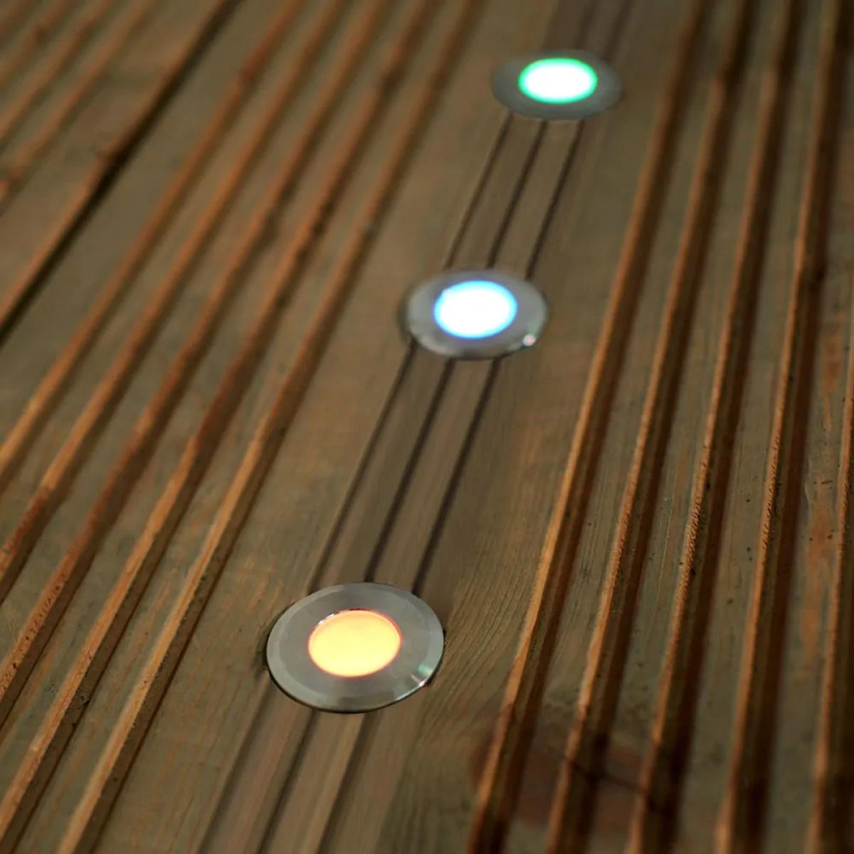 Illuminate your external areas without invading your visual space, with the Otis RGB LED Outdoor Solar Recessed Deck Light Kit. These practical lights come in a pack of 4 and sit back into the ground or your decking, projecting the light upwards. These handy solar lights come with a handy remote control too, allowing you to customise the colours and switch the lights on and off as required. The solar panel of these lights comes separately and simply needs to be fitted where gets sunlight to power the LED bulbs in the deck lights. IP44 is rated ensuring these lights will last the test of time in the outdoors. Once these lights are fully charged they will provide 8-10 hours of lighting.
