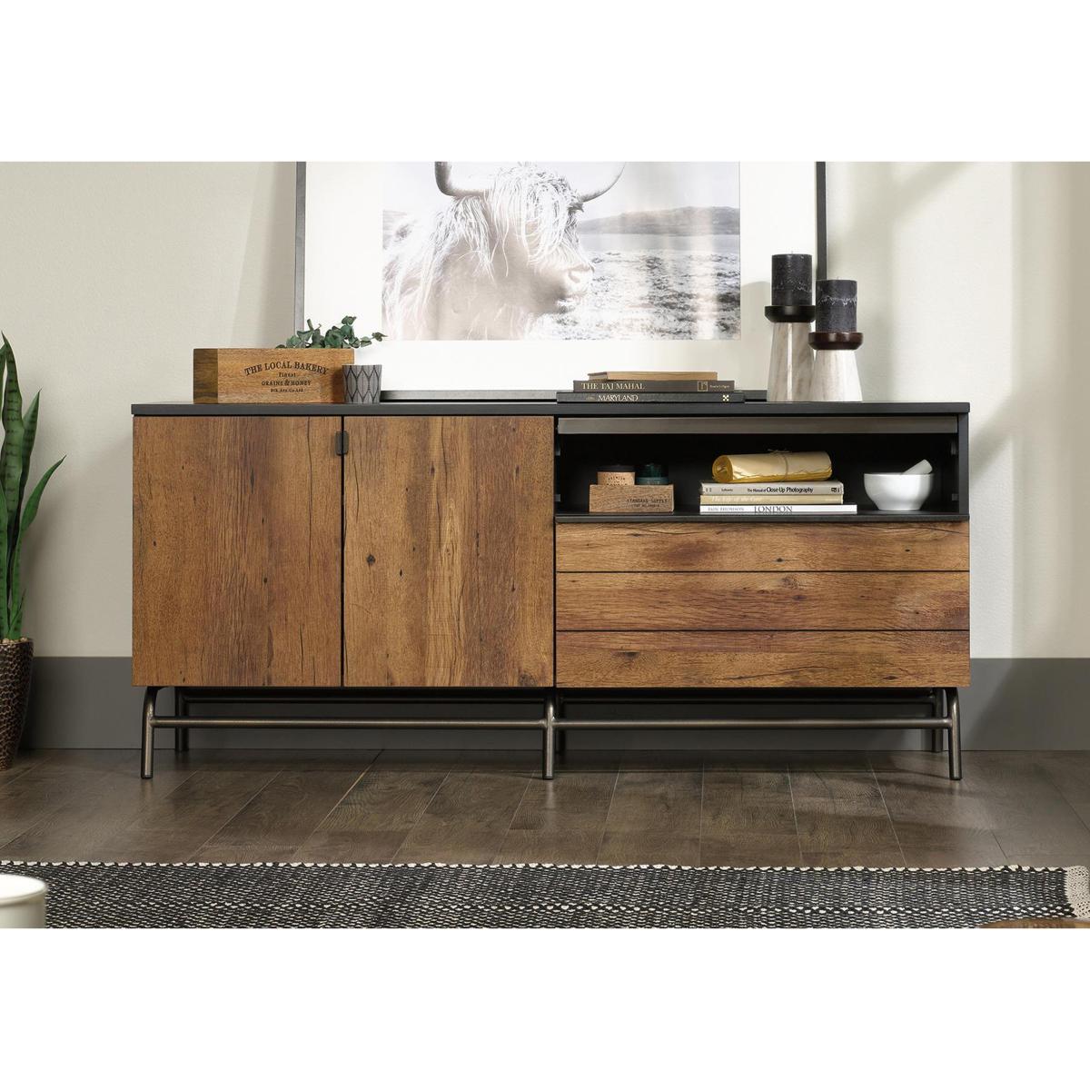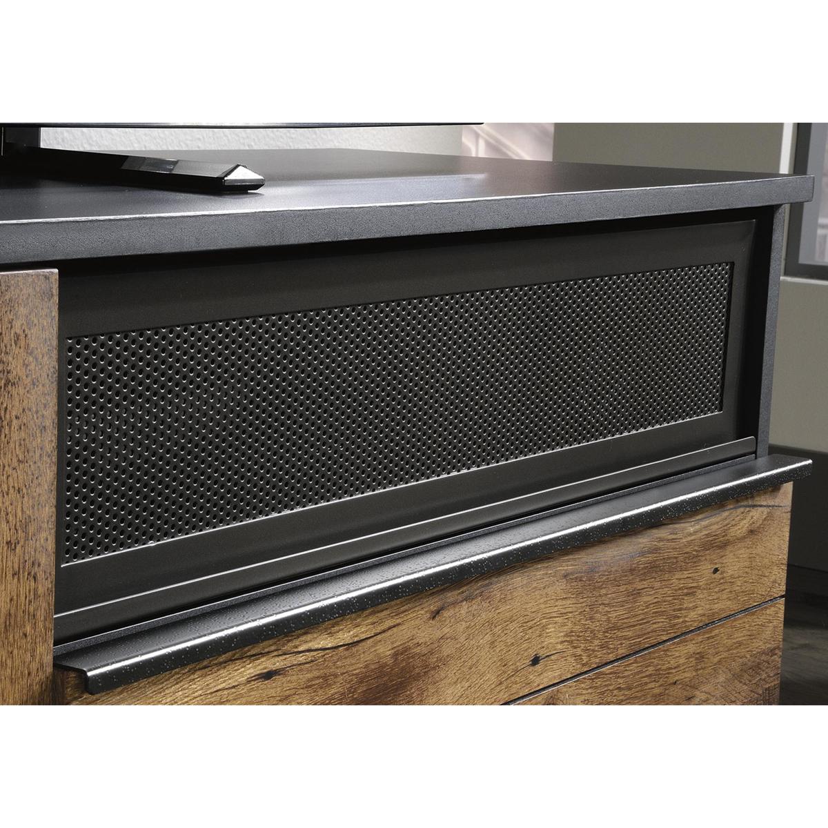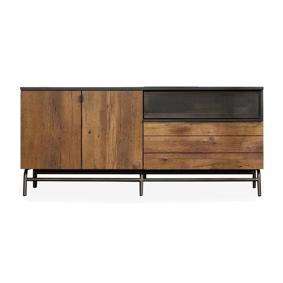 Create a modern, on-trend workspace with the superbly functional and stylish Otis range. It’s packed with useful storage features, from spacious shelving and A4 hanging file drawers to cable management ports and hidden cubbyholes to ensure your workspace stays distraction-free. These clever, well thought out desks have everything you could need to work and organise in style. They promise to transform your office space too thanks to the stunning industrial contrast of vintage oak tabletops, black, powder-coated metal frames and mesh detailing. This is industrial design with storage built in. Cleverly designed storage meets on-trend urban style in this tall TV cabinet. Designed for versatility – it makes an equally stylish sideboard – it’s crafted with care in the US.Why you'll love it Versatile and spacious TV cabinet for your urban-cool home. On-trend modern industrial style. Generous cupboard and drawer space. Storage cubby has a metal door that flips up and retracts. Enclosed back with cable management aperture. A multi-purpose piece, it can be used as a sideboard or storage cabinet. Made in the US. This TV cabinet is part of the Otis range. What you need to know 2 adjustable shelves. Black powder-coated metal frame. Can accommodate TVs weighing up to 31.5kg. WARNING! Item code: OTI-TVST--001