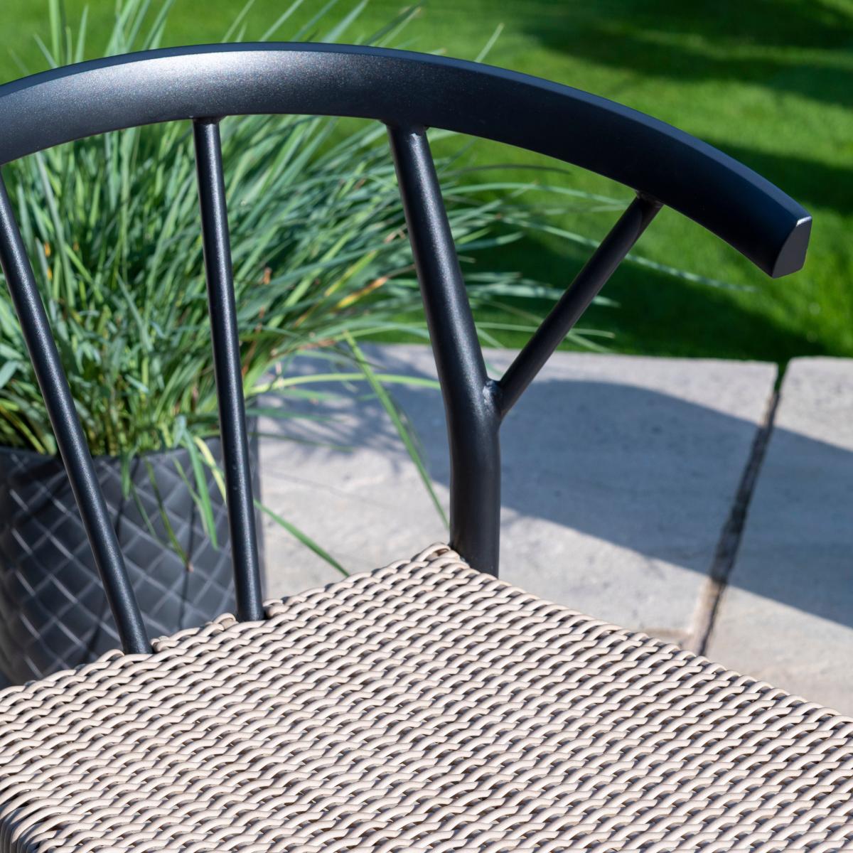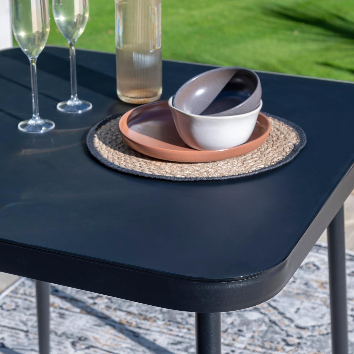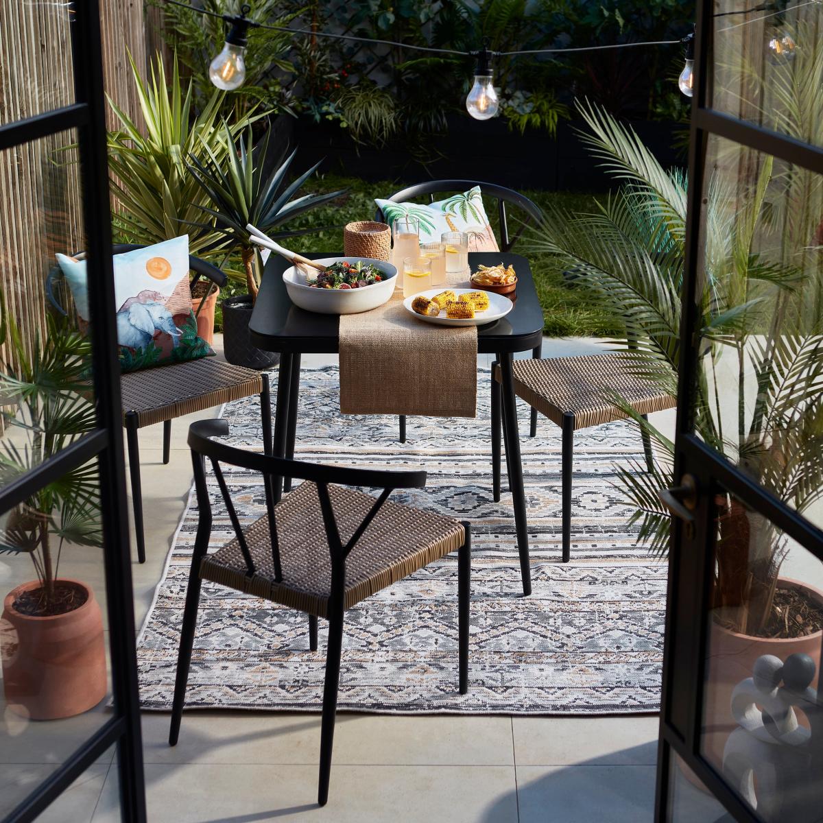 This Otta Dining Set is a sleek choice for adding contemporary appeal to garden or patio areas. The all-black finish makes it versatile and easy to integrate into various outdoor styles, from minimalist to modern boho. It's particularly effective paired with natural textures like rattan or wicker chairs, or even vibrant cushions to introduce colour and comfort. Practical styling tips include layering with outdoor rugs for added definition and comfort, and accessorising with potted plants or outdoor lanterns to create a welcoming dining vibe. This set works well in both structured garden spaces and more relaxed, informal patios, making it a flexible addition for stylish outdoor entertaining.