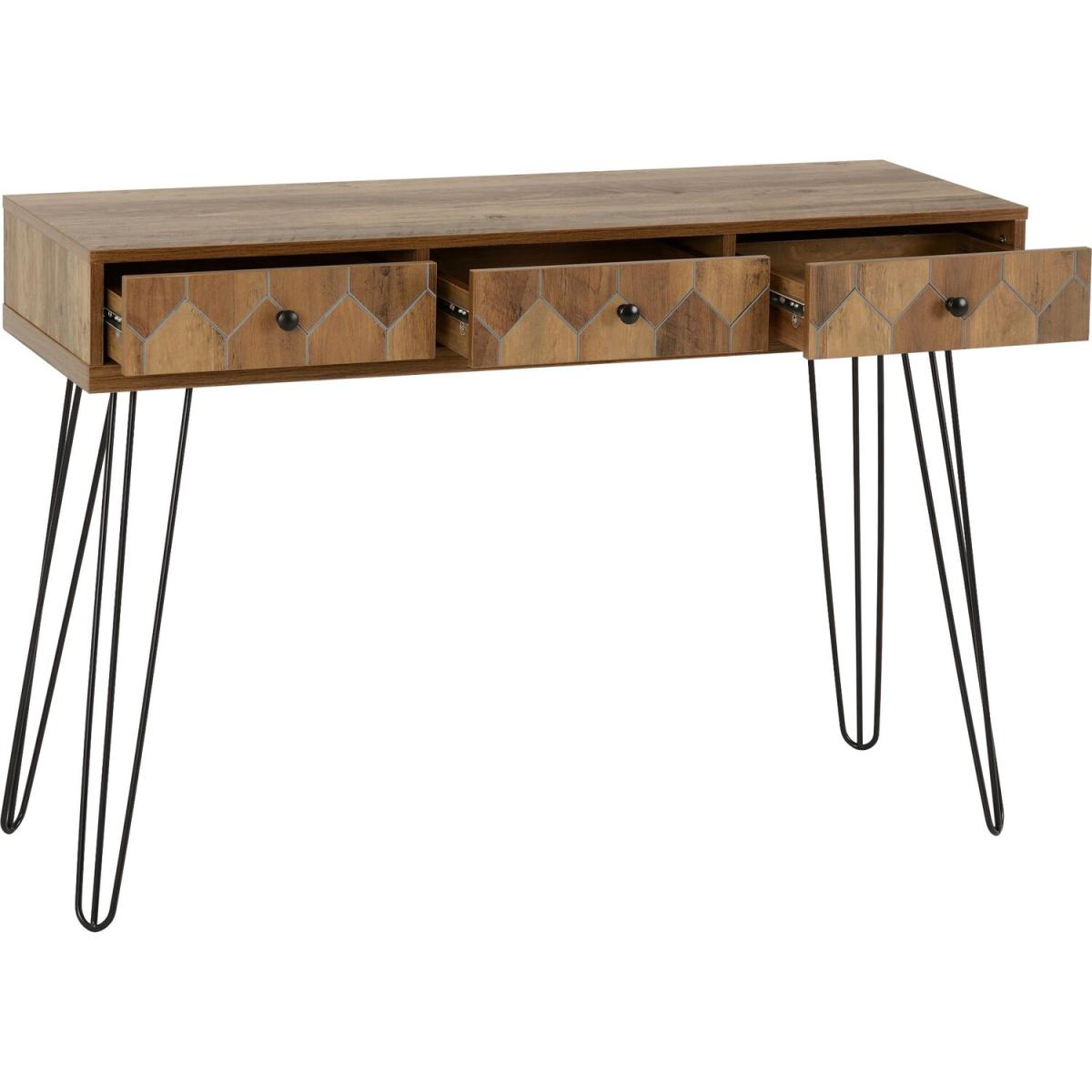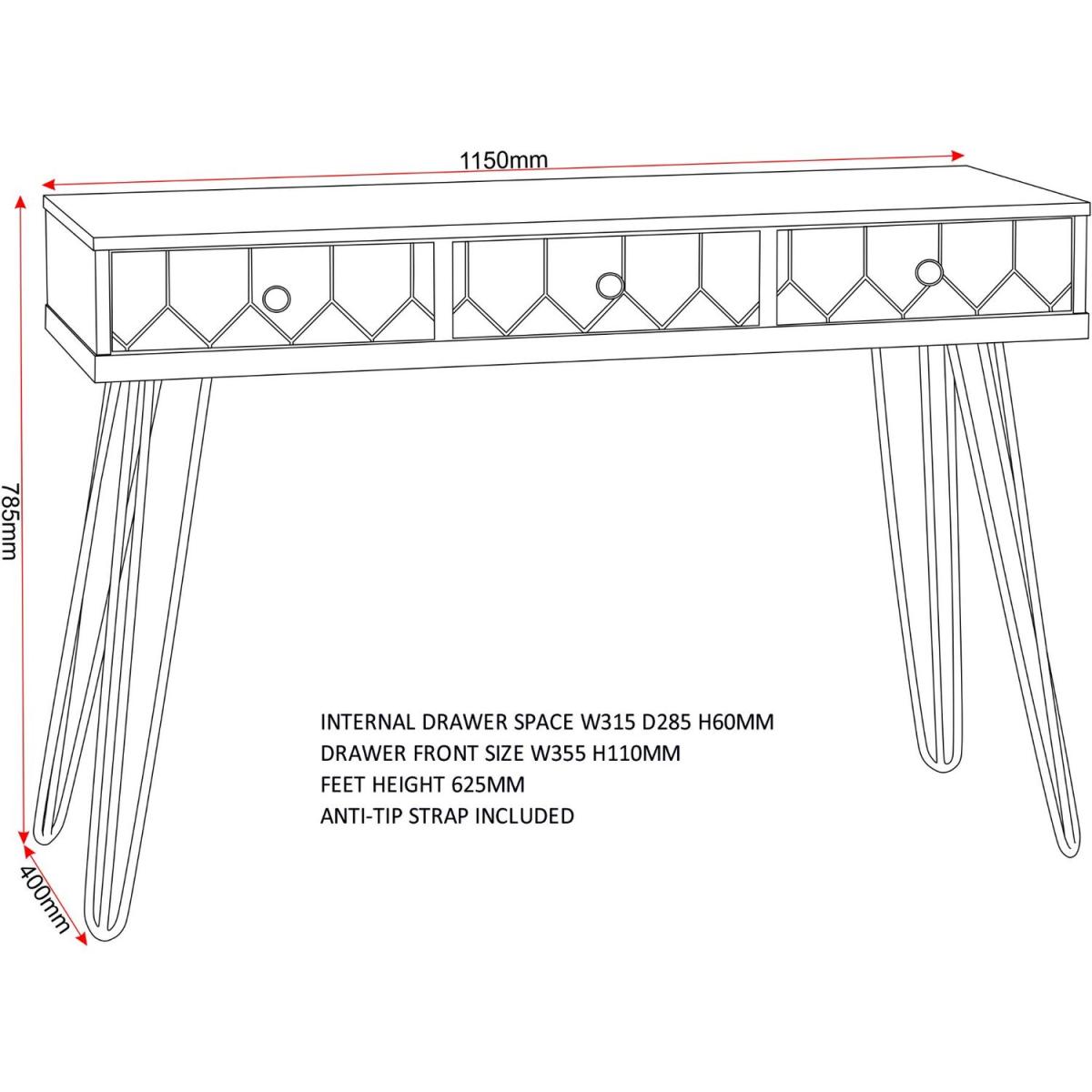 This Ottawa Three Drawer Console Table is a great piece for the home as the metal frame forms a tough and sturdy core structure making it steady and features a large tabletop and three drawers for storage. UK Mainland delivery only, between 9am - 9pm (weekdays) the courier will contact you on the day of delivery to offer a time slot. This takes place within 10 working days (Ground floor only). Please also ensure that we have a note of your up-to-date address and contact information, to be passed to the couriers.